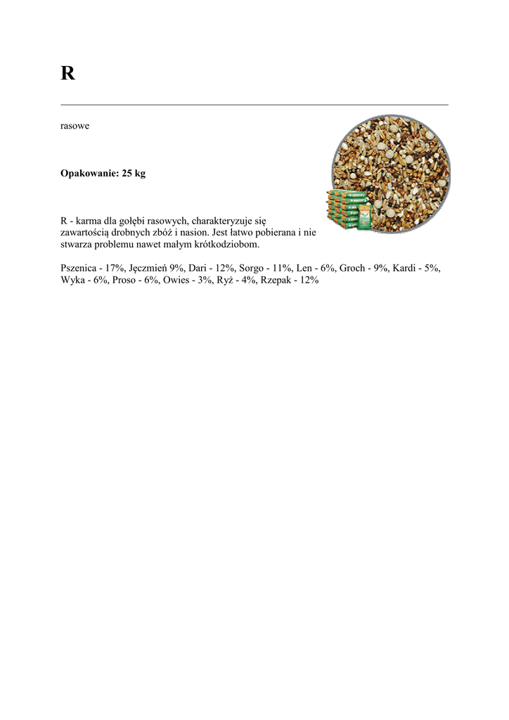 R rasowe Opakowanie: 25 kg R - karma dla gołębi rasowych, charakteryzuje się zawartością drobnych zbóż i nasion. Jest łatwo pobierana i nie stwarza problemu nawet małym krótkodziobom. Pszenica - 17%, Jęczmień 9%, Dari - 12%, Sorgo - 11%, Len - 6%, Groch - 9%, Kardi - 5%, Wyka - 6%, Proso - 6%, Owies - 3%, Ryż - 4%, Rzepak - 12%