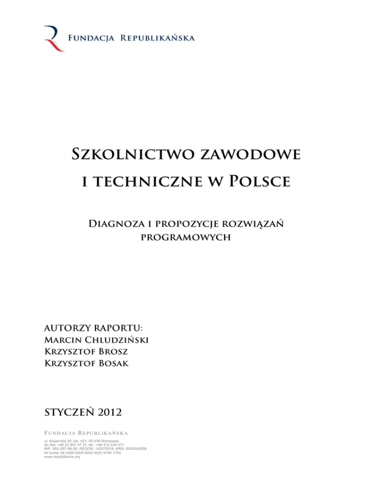 F U N D AC J A R E P U B L I K A Ń S K A ul. Kopernika 30, lok. 421, 00-336 Warszawa tel./fax: +48 22 891 07 37, tel.: +48 512 435 471 NIP: 952-207-86-26, REGON: 142075516, KRS: 0000340559 Nr konta: 84 2490 0005 0000 4520 9156 1754 www.republikanie.org Diagnoza Szkolnictwo zawodowe i techniczne od lat znajduje się w kryzysie. Jego przyczynami są wycofanie się państwa z aktywnej polityki w tym sektorze edukacji, dystrybucja środków w oparciu o algorytm niewystarczająco uwzględniający potrzeby szkół technicznych, przerzucenie odpowiedzialności za szkoły na samorządy oraz moda społeczna na naukę w liceach. Konsekwencjami takiego stanu rzeczy są zamykanie lub łączenie szkół, dekapitalizacja zaplecza technicznego, niewystarczająca jakość kształcenia i niedopasowanie oferty edukacyjnej do zapotrzebowania rynku pracy i spadek poziomu szczególnie niegdyś najlepszych szkół technicznych. Rekomendacje Przywrócenie państwa jako regulatora struktury kształcenia zawodowego poprzez przyjęcie Wieloletniego Programu Rozwoju Szkolnictwa Zawodowego, opartego m.in. fundusze unijne z perspektywy finansowej na lata 2014-2020. Przeniesienie mechanizmu zarządzania ofertą edukacyjną w szkolnictwie wyższym („kierunków zamawiane”) na średni poziom kształcenia. Monitorowanie sytuacji na rynku pracy i aktywne reagowanie na pojawiają się w gospodarce zmiany strukturalne. Umożliwienie uczniom uzyskania wszystkich niezbędnych uprawnień do wykonywania zawodu wraz z ukończeniem szkoły i obligatoryjność wymaganych egzaminów. Deregulacja zawodów, w których dodatkowe egzaminy nie są uzasadnione. Korekta algorytmu rozdziału subwencji oświatowej na korzyść szkół technicznych i stworzenie nowych narzędzi finansowych wspierających edukację techniczną (możliwość odpisania kosztu zatrudnienia pracownika oddelegowanego do nauki zawodu od przychodów w wartości większej niż 100%; możliwość amortyzowania sprzętu przekazanego szkole przy neutralności służb skarbowych; rządowy konkurs grantowy na doposażenie szkół w stanowiska do nauki przedmiotów technicznych). Stworzenie odrębnej polityki rządowej dla wyselekcjonowanej grupy elitarnych techników pod specjalnym nadzorem Ministerstwa Nauki i we współpracy z uczelniami technicznymi. 2 Niniejszy dokument jest diagnozą stanu faktycznego oraz opisem koniecznych zmian, które przywrócą właściwą rolę szkolnictwu zawodowemu (szkoły zawodowe, technika oraz szkoły policealne) w Polsce . Dokument ma charakter prelegislacyjny, jest wskazaniem kierunków pożądanych zmian, które należy przełożyć na język legislacji w postaci nowelizacji ustaw i rozporządzeń. Szkolnictwo zawodowe zwłaszcza po reformie edukacji w końcu lat dziewięćdziesiątych utraciło na znaczeniu, prestiżu i trosce państwa. Nieskoordynowana polityka edukacyjna prowadząca do tworzenia znacznej liczby relatywnie tanich (w sensie inwestycyjnym) lokalnych szkół wyższych o profilach humanistycznych i upowszechnienie zdawalności egzaminu maturalnego spowodowały, że popularność szkół zawodowych i technicznych wśród uczniów dramatycznie spadła. Zarówno uczniowie jak i ich rodzice wybierają przede wszystkim szkoły ogólnokształcące i studia wyższe na kierunkach humanistycznych. Przyczyniło się do tego również znaczne obniżenie wymagań, jeśli chodzi o kwalifikacje do liceów (za każdym uczniem „idzie” subwencja oświatowa). Upadek szkolnictwa zawodowego w początku lat dwutysięcznych, został wzmocniony przez negatywne trendy rynkowe. Spowolnienie gospodarcze lat 1997-2002 było okresem restrukturyzacji technologii i zatrudnienia w wielu polskich przedsiębiorstwach wytwórczych. Wówczas wdrażano nowe technologie, optymalizowano zatrudnienie. Te zmiany nałożyły się na faktyczną likwidację szkół technicznych co utrwaliło obraz takich placówek jako niedających szans za zatrudnienie. Dodatkowo, nastąpiła znaczna dekapitalizacja bazy sprzętowej i maszynowej szkół. Poszczególne czynniki zmniejszającego się znaczenia techników wzmacniały się wzajemnie. Szereg czynników, w tym zaniedbania państwa i zbyt pochopne przekazanie samorządom szkolnictwa zawodowego bez odpowiednich instrumentów finansowych, doprowadziło do sytuacji którą można podsumować poniższymi stwierdzeniami: Od pewnego czasu szkolnictwo zawodowe (szkoły zawodowe, technika, szkoły policealne) ulega degradacji zarówno jeśli chodzi o ich prestiż (szkoła zawodowa kojarzy się z miejscem, które nie daje szans na rynku pracy) jak i pod względem faktycznych możliwości kształcenia praktycznego, Mimo tego, że szkolnictwo zawodowe jest istotnym elementem kształcenia kadr dla gospodarki narodowej, państwo wycofało się z aktywnego wpływania na ten sektor, pozostawiając samorządom zarówno rozwój bazy do kształcenia praktycznego jak i wybór kierunków kształcenia, Skutkuje to utratą możliwości kształcenia praktycznego w wyniku dekapitalizacji bazy dydaktycznej oraz otwieraniem kierunków kształcenia w których szkoła może najłatwiej kształcić (posiadanie zaplecza praktycznego) – często są to kierunki, których absolwenci na lokalnym rynku pracy zasilają grono osób bezrobotnych. O naborze nie decydują realne potrzeby rynku pracy, ale konieczność wykorzystania 3 zasobów szkoły. Można powiedzieć, że mamy do czynienia ze swego rodzaju oszustwem edukacyjnym – otwiera się kierunki wiedząc o tym, że ich absolwenci mają bardzo małe szanse na runku pracy zarówno ze względu na brak przygotowania praktycznego jak i zbyt dużą grupę absolwentów kierunku (tajemnicą poliszynela jest że największą grupą zasilającą rejestr osób bezrobotnych jest grupa absolwentów szkół zawodowych). Przy powyższej sytuacji cały czas odnotowuje się duże zapotrzebowanie na zawody deficytowe w których nie podejmuje się kształcenia ze względu na niechęć szkół i samorząd