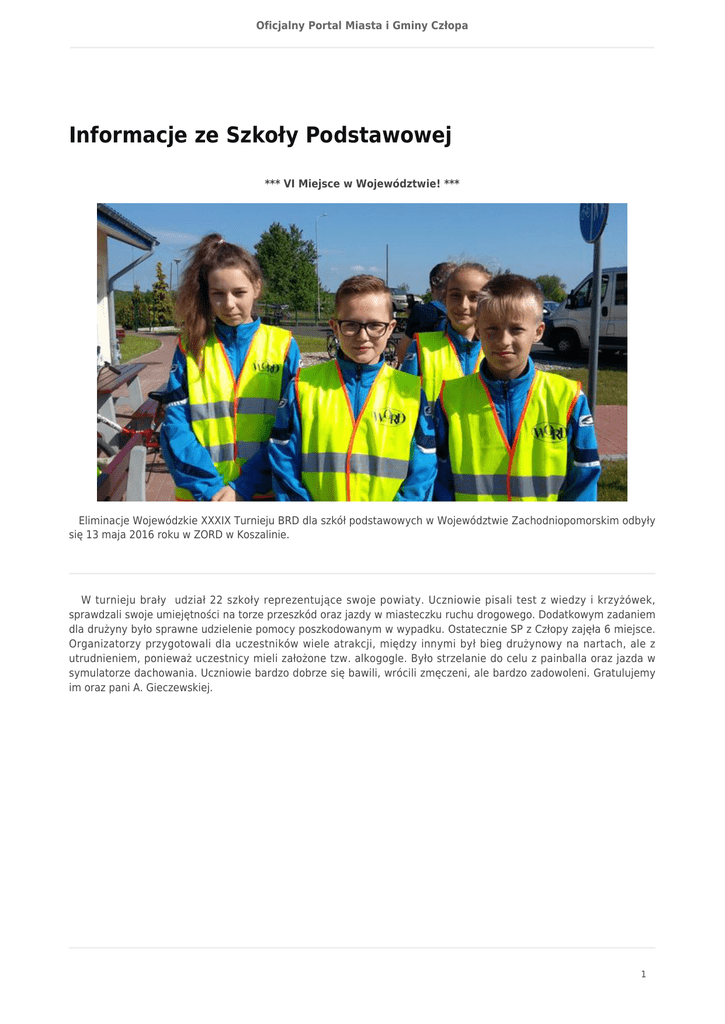 Oficjalny Portal Miasta i Gminy Człopa Informacje ze Szkoły Podstawowej *** VI Miejsce w Województwie! *** Eliminacje Wojewódzkie XXXIX Turnieju BRD dla szkół podstawowych w Województwie Zachodniopomorskim odbyły się 13 maja 2016 roku w ZORD w Koszalinie. W turnieju brały udział 22 szkoły reprezentujące swoje powiaty. Uczniowie pisali test z wiedzy i krzyżówek, sprawdzali swoje umiejętności na torze przeszkód oraz jazdy w miasteczku ruchu drogowego. Dodatkowym zadaniem dla drużyny było sprawne udzielenie pomocy poszkodowanym w wypadku. Ostatecznie SP z Człopy zajęła 6 miejsce. Organizatorzy przygotowali dla uczestników wiele atrakcji, między innymi był bieg drużynowy na nartach, ale z utrudnieniem, ponieważ uczestnicy mieli założone tzw. alkogogle. Było strzelanie do celu z painballa oraz jazda w symulatorze dachowania. Uczniowie bardzo dobrze się bawili, wrócili zmęczeni, ale bardzo zadowoleni. Gratulujemy im oraz pani A. Gieczewskiej. 1 Oficjalny Portal Miasta i Gminy Człopa 2 Oficjalny Portal Miasta i Gminy Człopa *** Rocznica uchwalenia Konstytucji 3 Maja *** 3 maja 1791- Sejm Czteroletni przyjął ustawę rządową, która przeszła do historii jako Konstytucja 3 Maja. Była ona drugą na świecie i pierwszą w Europie ustawą regulującą organizację władz państwowych oraz prawa i obowiązki obywateli. Była ostatnią próbą ratowania Rzeczypospolitej. Z tej okazji w szkole odbyły się apele w grupach wiekowych. Program artystyczny w klasach I-III przygotowali uczniowie klasy IIIb wraz ze swoją wychowawczynią panią Barbarą Olczak. W grupie Małolatów apel przygotowali uczniowie klasy IVa z panią Ewą Kogut. Społeczność szkolna zapoznała się z historią powstania konstytucji oraz jej znaczeniem dla ówczesnej Polski. Uczniowie szkoły śpiewająco zaprezentowali się także na gminnej majówce, a poczet sztandarowy reprezentował szkołę na uroczystej mszy za ojczyznę. 3 Oficjalny Portal Miasta i Gminy Człopa *** Super klasa *** Na apelu w grupie "Małolat" podsumowano miesięczne zmagania sześciu klas o miano tej naj... Tym razem nacisk położony był na wyniki w nauce, wzorową frekwencję, estetykę klas lekcyjnych oraz kulturalne zachowanie się. Po skrupulatnym podliczeniu punktów okazało sie, że drugi raz z rzędu tytuł "Super klasy" wywalczyła sobie klasa IVa z wych. panią E. Kogut. Gospodarz klasy wylosował dla swoich kolegów dzień bez kartkówek, klasówek i odpytywania. Gratulujemy! 4 Oficjalny Portal Miasta i Gminy Człopa *** Profilaktyka *** Nigdy za dużo działań jeśli chodzi o profilaktykę uzależnień. Tym razem pedagog szkolny przygotowała konkurs dla klas IV-VI - "Alkohol i jego skutki". Przed zmaganiami konkursowymi uczniowie w swoich klasach zostali zapoznani przez wychowawców z prawdą i mitami na temat alkoholu i jego spożywania, a całości dopełniły filmy o tejże tematyce oraz o tym, jak być asertywnym i umieć powiedzieć "Nie!". Pierwsze miejsce w konkursie zajęły wspólnie 3 klasy: Vb, VIa i VIb. Drobne upominki wręczyła uczniom pani dyrektor E.Rogala. 5 Oficjalny Portal Miasta i Gminy Człopa *** Konkurs plastyczny " Łowiectwo w oczach dziecka" *** Do udziału w tym konkursie zachęciła uczniów pani A. Gieczewska. Prac było bardzo dużo, a ich sposób wykonania, ujęcie tematu oraz pomysłowość młodych plastyków tak ogromna, że jury miało nie lada trudności, żeby wybrać te najlepsze. Po dłuuuugim zastanawianiu się postanowiono nagrodzić dziesięcioro uczniów: 1. 2. 3. 4. 5. 6. 7. 8. 9. 10. Julia Dereś VI a Kamińska Wiktoria kl. VI a Wiktoria Bulik - kl. VI a Olaf Banaśkiewicz kl. VI b Wiktoria Szpica kl. VI b Natalia Giłka kl. VI b Wiktoria Banaskiewicz kl. V a Weronika Wójcik kl. V a Karolina Pralicz kl. V a Zuzanna Kruszewska V b 6 Oficjalny Portal Miasta i Gminy Człopa Nagrody ufundowane przez Bractwo Kurkowe wręczył zaproszony na tę okazję brat K.Kasperek. Pan K.Kasperek przybliżył uczniom historię Bractwa Kurkowego, które istnieje na naszym terenie oraz zaprosił wszystkich do wzięcia udziału w następnym konkursie plastycznym. Główną nagrodą ma być w nim zamknięcie najlepszej pracy plastycznej w kapsule czasu i zamurowanie jej w przelewickim kościele na 100 lat. 7
