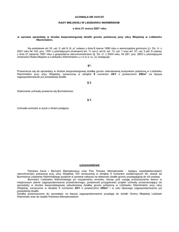 UCHWAŁA NR VI/41/07 RADY MIEJSKIEJ W LIDZBARKU WARMIŃSKIM z dnia 21 marca 2007 roku w sprawie sprzedaży w drodze bezprzetargowej działki gruntu położonej przy ulicy Wiejskiej w Lidzbarku Warmińskim. Na podstawie art.18, ust. 2, pkt 9, lit „a” ustawy z dnia 8 marca 1990 roku o samorządzie gminnym (j.t. Dz. U. z 2001 roku Nr 142, poz. 1591 z późniejszymi zmianami) art. 11 ust.2, art.l2, art. 13, ust. 1 oraz art. 37, ust. 2 pkt. 6 ustawy z dnia 21 sierpnia 1997 roku o gospodarce nieruchomościami (tj. Dz. U. z 2004 roku, Nr 261, poz. 2603 z późniejszymi zmianami) Rada Miejska w Lidzbarku Warmińskim u c h w a l a, co następuje: §1. Przeznacza się do sprzedaży w drodze bezprzetargowej działkę gruntu zabudowaną budynkiem położoną w Lidzbarku Warmińskim przy ulicy Wiejskiej, oznaczoną w obrębie 9 numerem 45/1 o powierzchni 292m2 na lepsze zagospodarowanie już posiadanej działki. § 2. Wykonanie uchwały powierza się Burmistrzowi. § 3. Uchwała wchodzi w życie z dniem podjęcia UZASADNIENIE Państwo Irena i Bernard Stempkowscy oraz Pan Tomasz Stempkowski - będący współwłaścicielami nieruchomości położonej przy ulicy Wiejskiej 103 oznaczonej w obrębie 9 numerem ewidencyjnym 40, złożyli do Burmistrza Lidzbarka Warmińskiego podanie w sprawie nabycia na własność działki gruntu przylegającej do ich posesji. Burmistrz Lidzbarka Warmińskiego po rozpatrzeniu wniosku, biorąc pod uwagę przeznaczenie terenu w miejscowym planie zagospodarowania przestrzennego, postanowił przygotować projekt uchwały przeznaczający do sprzedaży w drodze bezprzetargowej zabudowaną działkę gruntu położoną w Lidzbarku Warmińskim przy ulicy Wiejskiej, oznaczone w obrębie 9 numerem 45/1 o powierzchni 292m2 i w celu lepszego zagospodarowania już posiadanej działki. Działka przeznaczona do sprzedaży na lepsze zagospodarowanie przylega do działki Gminy Miejskiej Lidzbark Warmiński oraz do działki Państwa Stempkowskich.