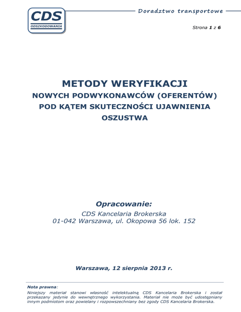 D o ra d z t w o t ra n s po rt o w e Strona 1 z 6 METODY WERYFIKACJI NOWYCH PODWYKONAWCÓW (OFERENTÓW) POD KĄTEM SKUTECZNOŚCI UJAWNIENIA OSZUSTWA Opracowanie: CDS Kancelaria Brokerska 01-042 Warszawa, ul. Okopowa 56 lok. 152 Warszawa, 12 sierpnia 2013 r. Nota prawna: Niniejszy materiał stanowi własność intelektualną CDS Kancelaria Brokerska i został przekazany jedynie do wewnętrznego wykorzystania. Materiał nie może być udostępniany innym podmiotom oraz powielany i rozpowszechniany bez zgody CDS Kancelaria Brokerska. D o ra d z t w o t ra n s po rt o w e Strona 2 z 6 METODY WERYFIKACJI NOWYCH PODWYKONAWCÓW (OFERENTÓW) POD KĄTEM SKUTECZNOŚCI UJAWNIENIA OSZUSTWA Podmiot weryfikowany Poziom skuteczności ujawnienia oszustwa Oszust Bardzo duża Oszust Bardzo duża Założenie: firma nie istnieje Sprawdzenie wiarygodności firmy oferenta w ogólnodostępnych europejskich lub krajowych rejestrach przedsiębiorców, VAT, wydanych licencji oraz na giełdach transportowych. Oszust Bardzo duża Sprawdzenie opinii o firmie oferenta na giełdach transportowych i forach internetowych. Uwaga. W sytuacji, gdy uzyskane informacje potwierdzą, że w przeszłości oszust podszył się pod tę firmę, może to być przesłanką świadczącą o próbie przejęcia towaru przez tego samego lub innego oszusta. Zalecenie. Jeżeli taki oferent nie był wnikliwie zweryfikowany należy go ponownie zweryfikować według metod opisanych w pkt. 1 i 2. Oszust Duża Lp. Metoda weryfikacji 1. 2. 3. 4. Poproszenie oferenta o podanie numeru telefonu stacjonarnego do firmy, w imieniu której oferent występuje i której dokumentami się posługuje. Wykonanie telefonu na ustalony przez siebie w Internecie lub w innych źródłach (rejestry: przedsiębiorców, VAT, wydanych licencji, giełdy transportowe, itp.) numer i dokonanie weryfikacji osoby składającej ofertę oraz potwierdzenie autentyczności oferty przewozu. Uwaga. W przypadku ustalania numeru telefonu w Internecie należy go potwierdzić na co najmniej trzech niezależnych stronach internetowych – w sieci mogą być fałszywe wizytówki. Nota prawna: Niniejszy materiał stanowi własność intelektualną CDS Kancelaria Brokerska i został przekazany jedynie do wewnętrznego wykorzystania. Materiał nie może być udostępniany innym podmiotom oraz powielany i rozpowszechniany bez zgody CDS Kancelaria Brokerska. D o ra d z t w o t ra n s po rt o w e Strona 3 z 6 5. 6. 7. Uzyskanie od oferenta (głównie z krajów południowych) informacji o zmianie numerów rejestracyjnych pojazdów i/lub kierowcy. Uwaga. Taka informacja może być przesłanką świadczącą o próbie przejęcia towaru przez oszusta. Zalecenie. Jeżeli taki oferent nie był wnikliwie zweryfikowany należy go ponownie zweryfikować według metod opisanych w pkt. 1 i 2. Oszust (przesłanka) Średnia Oszust (przesłanka) Średnia Oszust (przesłanka) Mała Założenie: firma istnieje Sprawdzenie wiarygodności firmy oferenta w ogólnodostępnych europejskich lub krajowych rejestrach przedsiębiorców, VAT, wydanych licencji oraz na giełdach transportowych. Firma, której dokumentami posługuje się oferent Bardzo mała Sprawdzenie zgodności danych na otrzymanych dokumentach i polisie OCP z danymi uzyskanymi w Internecie lub w innych źródłach. Firma, której dokumentami posługuje się oferent Bardzo mała Potwierdzenie autentyczności polisy OCP w zakładzie ubezpieczeń, który ją wystawił. Firma, której dokumentami posługuje się oferent Bardzo mała Oszust Metoda nieskuteczna Stwierdzenie osób różnych narodowości (głównie z krajów południowych) biorących udział w przewozie. Uwaga. Taka informacja może być przesłanką świadczącą o próbie przejęcia towaru przez oszusta. Zalecenie. Jeżeli taki oferent nie był wnikliwie zweryfikowany należy go ponownie zweryfikować według metod opisanych w pkt. 1 i 2. Potwierdzenie zgodności kraju i rejonu rejestracji pojazdu z adresem siedziby firmy, której dokumentami oferent się posługuje. Pomocne: http://www.tablicerejestracyjne.pl/tablice-rejestracyjne 8. 9. 10. 11. Wykonanie telefonu na podany przez oferenta numer w celu weryfikacji osoby składającej ofertę oraz potwierdzenie autentyczności oferty przewozu. Nota prawna: Niniejszy materiał stanowi własność intelektualną CDS Kancelaria Brokerska i został przekazany jedynie do wewnętrznego wykorzystania. Materiał nie może być udostępniany innym podmiotom oraz powielany i rozpowszechniany bez zgody CDS Kancelaria Brokerska. D o ra d z t w o t ra n s po rt o w e Strona 4 z 6 KOMENTARZ I OBJAŚNIENIA 1. Oszuści zazwyczaj działają w sposób zorganizowany. W takiej grupie przestępczej często uczestniczą przestępcy różnych narodowości, dokumenty tożsamości oraz język, którymi się posługują również wskazują na różne kraje. Analizowane przypadki potwierdzają, ze oszuści najczęściej pochodzą z Rumunii, Węgier, Bułgarii, Słowacji i Mołdawii, choć wykorzystywane są również dokumenty z innych krajów takich jak Ukraina, Słowenia a także Włochy. Nie oznacza to, że ten przestępczy proceder nie jest uprawiany również w Polsce. Niemniej jednak z powodu łatwiejszego dostępu do danych rejestrowych, a tym samym większych możliwości weryfikacji oferentów i ujawnienia ich faktycznych zamiarów, większość oszustów działających na obszarze Polski to oszuści z krajów południowych. W ich przypadku spedytorzy mają ograniczone możliwości weryfikacji a bariera językowa często uniemożliwia właściwą ocenę dokumentów i samych oferentów. 2. Polisa OCP nie jest głównym a już na pewno nie jedynym dokumentem potwierdzającym wiarygodność oferentów i wymagającym weryfikacji. W większości przypadków polisy OCP są autentyczne, gdyż albo zostały zawarte przez firmy, pod które podszywają się oszuści, albo też zawarte (i nawet opłacone) przez samych oszustów. Weryfikacja polisy w niewielkim stopni