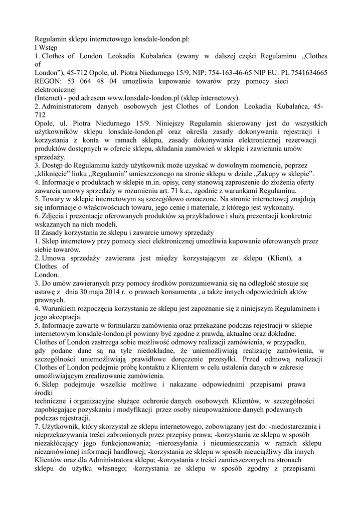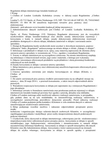 Regulamin sklepu internetowego lonsdale-london.pl: I Wstęp 1. Clothes of London Leokadia Kubalańca (zwany w dalszej części Regulaminu „Clothes of London”), 45-712 Opole, ul. Piotra Niedurnego 15/9, NIP: 754-163-46-65 NIP EU: PL 7541634665 REGON: 53 064 48 04 umożliwia kupowanie towarów przy pomocy sieci elektronicznej (Internet) - pod adresem www.lonsdale-london.pl (sklep internetowy). 2. Administratorem danych osobowych jest Clothes of London Leokadia Kubalańca, 45712 Opole, ul. Piotra Niedurnego 15/9. Niniejszy Regulamin skierowany jest do wszystkich użytkowników sklepu lonsdale-london.pl oraz określa zasady dokonywania rejestracji i korzystania z konta w ramach sklepu, zasady dokonywania elektronicznej rezerwacji produktów dostępnych w ofercie sklepu, składania zamówień w sklepie i zawierania umów sprzedaży. 3. Dostęp do Regulaminu każdy użytkownik może uzyskać w dowolnym momencie, poprzez „kliknięcie” linku „Regulamin” umieszczonego na stronie sklepu w dziale „Zakupy w sklepie”. 4. Informacje o produktach w sklepie m.in. opisy, ceny stanowią zaproszenie do złożenia oferty zawarcia umowy sprzedaży w rozumieniu art. 71 k.c., zgodnie z warunkami Regulaminu. 5. Towary w sklepie internetowym są szczegółowo oznaczone. Na stronie internetowej znajdują się informacje o właściwościach towaru, jego cenie i materiale, z którego jest wykonany. 6. Zdjęcia i prezentacje oferowanych produktów są przykładowe i służą prezentacji konkretnie wskazanych na nich modeli. II Zasady korzystania ze sklepu i zawarcie umowy sprzedaży 1. Sklep internetowy przy pomocy sieci elektronicznej umożliwia kupowanie oferowanych przez siebie towarów. 2. Umowa sprzedaży zawierana jest między korzystającym ze sklepu (Klient), a Clothes of London. 3. Do umów zawieranych przy pomocy środków porozumiewania się na odległość stosuje się ustawę z dnia 30 maja 2014 r. o prawach konsumenta , a także innych odpowiednich aktów prawnych. 4. Warunkiem rozpoczęcia korzystania ze sklepu jest zapoznanie się z niniejszym Regulaminem i jego akceptacja. 5. Informacje zawarte w formularzu zamówienia oraz przekazane podczas rejestracji w sklepie internetowym lonsdale-london.pl powinny być zgodne z prawdą, aktualne oraz dokładne. Clothes of London zastrzega sobie możliwość odmowy realizacji zamówienia, w przypadku, gdy podane dane są na tyle niedokładne, że uniemożliwiają realizację zamówienia, w szczególności uniemożliwiają prawidłowe doręczenie przesyłki. Przed odmową realizacji Clothes of London podejmie próbę kontaktu z Klientem w celu ustalenia danych w zakresie umożliwiającym zrealizowanie zamówienia. 6. Sklep podejmuje wszelkie możliwe i nakazane odpowiednimi przepisami prawa środki techniczne i organizacyjne służące ochronie danych osobowych Klientów, w szczególności zapobiegające pozyskaniu i modyfikacji przez osoby nieupoważnione danych podawanych podczas rejestracji. 7. Użytkownik, który skorzystał ze sklepu internetowego, zobowiązany jest do: -niedostarczania i nieprzekazywania treści zabronionych przez przepisy prawa; -korzystania ze sklepu w sposób niezakłócający jego funkcjonowania; -nierozsyłania i nieumieszczania w ramach sklepu niezamówionej informacji handlowej; -korzystania ze sklepu w sposób nieuciążliwy dla innych Klientów oraz dla Administratora sklepu; -korzystania z treści zamieszczonych na stronach sklepu do użytku własnego; -korzystania ze sklepu w sposób zgodny z przepisami obowiązującymi na terytorium Rzeczypospolitej Polskiej oraz postanowieniami Regulaminu. III Zawarcie umowy sprzedaży: 1. Aby zawrzeć umowę sprzedaży, należy złożyć zamówienie w jakiejkolwiek dostępnej formie: -na stronie sklepu (on-line), -telefonicznie, -pocztą elektroniczną, -komunikatorem Skype, Gadu-Gadu. 2. Sklep przyjmuje zamówienia składane on-line przez całą dobę, we wszystkie dni tygodnia. Jedynie zamówienia składane telefonicznie oraz pocztą elektroniczną przyjmowane są w dni robocze w godzinach 7.00 – 18.00. Zamówienia złożone w dni wolne od pracy będą realizowane w pierwszym dniu roboczym następującym po dniu, w którym zamówienie zostało złożone. 3. Klient może złożyć zamówienie bez konieczności trwałego rejestrowania swoich danych w bazie sklepu (tzw. zakupy bez rejestracji). 4. Warunkiem złożenia zamówienia jest wypełnienie w formularzu zamówienia wszystkich wymaganych danych koniecznych do wysyłki. 5. W celu złożenia zamówienia należy dokonać wyboru produktów z dostępnej oferty sklepu, ich kolorystyki, rozmiarów oraz ilości poprzez „dodanie do koszyka +”. 6. Zamówienie zostanie zrealizowane pod warunkiem, że towar jest dostępny na magazynie. W przypadku niedostępności części towarów objętych zamówieniem Klient jest informowany o stanie zamówienia i podejmuje decyzję o sposobie jego realizacji (częściowa realizacja, wydłużenie czasu oczekiwania, anulowanie całości zamówienia). 7. Do momentu zatwierdzenia wyboru produktów przyciskiem „Realizuj zamówienie”, Klient ma możliwość dokonywania zmian i modyfikacji produktów w zamówieniu, jak i danych teleadresowych do wysyłki lub faktury. 8. Do sprzedaży promocyjnej oraz wyprzedaży przeznaczona jest ograniczona liczba towarów i realizacja zamówień następuje według kolejności wpływania potwierdzonych zamówień na te towary, aż do wyczerpania się zapasów objętych tą formą sprzedaży. 9. Wysłanie zamówienia przez Klienta (zatwierdzenie przyciskiem „Potwierdzam zamówienie”) stanowi ofertę Klienta złożoną Clothes of London do zawarcia Umowy sprzedaży, zgodnie z treścią Regulaminu. 10.Po złożeniu przez Klienta zamówienia otrzyma on drogą mailową potwierdzenie przyjęcia jego oferty zawierające informacje dotyczące numeru zamówieniu, ilości produktów, wartości zamówienia, wybranego rodzaju dostawy i płatności, czasu realizacji z