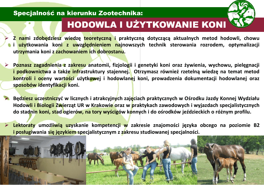 Specjalność na kierunku Zootechnika: HODOWLA I UŻYTKOWANIE KONI Z nami zdobędziesz wiedzę teoretyczną i praktyczną dotyczącą aktualnych metod hodowli, chowu i użytkowania koni z uwzględnieniem najnowszych technik sterowania rozrodem, optymalizacji utrzymania koni z zachowaniem ich dobrostanu. Poznasz zagadnienia z zakresu anatomii, fizjologii i genetyki koni oraz żywienia, wychowu, pielęgnacji i podkownictwa a także infrastruktury stajennej. Otrzymasz również rzetelną wiedzę na temat metod kontroli i oceny wartości użytkowej i hodowlanej koni, prowadzenia dokumentacji hodowlanej oraz sposobów identyfikacji koni. Będziesz uczestniczyć w licznych i atrakcyjnych zajęciach praktycznych w Ośrodku Jazdy Konnej Wydziału Hodowli i Biologii Zwierząt UR w Krakowie oraz w praktykach zawodowych i wyjazdach specjalistycznych do stadnin koni, stad ogierów, na tory wyścigów konnych i do ośrodków jeździeckich o różnym profilu. Lektoraty umożliwią uzyskanie kompetencji w zakresie znajomości języka obcego na poziomie B2 i posługiwania się językiem specjalistycznym z zakresu studiowanej specjalności. Perspektywy zatrudnienia Po ukończeniu specjalności Hodowla i Użytkowanie Koni będziesz przygotowany do pracy w ośrodkach hodowlanych (stadniny koni i stada ogierów), ośrodkach jeździeckich (rekreacyjnych, sportowych, hipoterapeutycznych), gospodarstwach agroturystycznych a także w instytucjach naukowo-badawczych i laboratoriach. Nabyte kwalifikacje pozwolą również na zatrudnienie w Agencji Restrukturyzacji i Modernizacji Rolnictwa, Agencji Nieruchomości Rolnych, jak też w instytucjach administracji publicznej i samorządu terytorialnego przy realizacji różnorodnych projektów związanych z funduszami strukturalnymi. Program nauczania oferowanych studiów obejmuje treści związane z produkcją zwierzęcą, dzięki czemu jako absolwent nabędziesz uprawnienia do przejęcia i prowadzenia gospodarstwa rolnego. Ośrodek Jazdy Konnej Jako student naszej specjalności będziesz mógł korzystać na preferencyjnych warunkach z Ośrodka Jazdy Konnej Wydziału Hodowli i Biologii Zwierząt Uniwersytetu Rolniczego, który oferuje: • jazdy rekreacyjne oraz jazdy z elementami sportu • warsztaty, szkolenia i kursy o tematyce hipologicznej • możliwość udziału w zawodach jeździeckich • możliwość wolontariatu oraz rozwój Twojej kreatywności • przygotowanie do egzaminu na odznaki PZJ i zainteresowań przez cały okres studiów w miłym towarzystwie ZAPRASZAMY www.whibz.ur.krakow.pl [email protected] Facebook: Zakład Hodowli Koni Ośrodek Jazdy Konnej Uniwersytetu Rolniczego