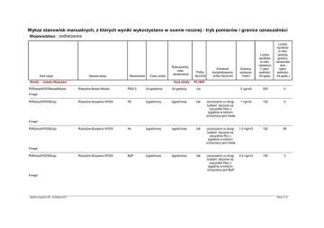 Wykaz stanowisk manualnych, z których wyniki wykorzystano w ocenie rocznej - tryb pomiarów i granice oznaczalnści Województwo: podkarpackie Kod stacji Strefa: Nazwa stacji Stanowisko Czas uśred. miasto Rzeszów PkRzeszWIOSNoweMiasto Rzeczywisty czas uśredniania Kod strefy: Próby łączone Schemat kompletowania próby łączonej Liczba wyników w roku poniżej granicy oznaczaln ości (jako wartości 24-godz.) Granica oznaczalności Liczba wyników w roku wpisanyc h jako wartości 24-godz. 2 ug/m3 355 0 PL1801 Rzeszów-Nowe Miasto PM2.5 24-godzinny 24 godziny nie Rzeszów-Szopena WIOS Pb tygodniowy tygodniowy tak oznaczanie co drugi tydzień, łączone są wszystkie filtry z tygodnia w którym oznaczany jest metal 1 ng/m3 152 0 Rzeszów-Szopena WIOS As tygodniowy tygodniowy tak oznaczanie co drugi tydzień, łaczone są wszystkie fltry z tygodnia w którym oznaczany jest metal 1,5 ng/m3 152 89 Rzeszów-Szopena WIOS BaP tygodniowy tygodniowy tak oznaczanie co drugi tydzień, łączone są wszystkie filtry z tygodnia w którym oznaczany jest BaP 0,2 ng/m3 152 3 Uwagi: PkRzeszWIOSSzop Uwagi: PkRzeszWIOSSzop Uwagi: PkRzeszWIOSSzop Uwagi: Wydruk z programu OR 24 kwietnia 2013 Strona 1 z 8 Województwo: podkarpackie Kod stacji PkRzeszWIOSSzop Nazwa stacji Stanowisko Czas uśred. Rzeczywisty czas uśredniania Próby łączone Schemat kompletowania próby łączonej Liczba wyników w roku poniżej granicy oznaczaln ości (jako wartości 24-godz.) Granica oznaczalności Liczba wyników w roku wpisanyc h jako wartości 24-godz. 2 ng/m3 152 121 Rzeszów-Szopena WIOS Ni tygodniowy tygodniowy tak Rzeszów-Szopena-WIOS PM10 24-godzinny 24 godziny nie 2 ug/m3 302 0 Rzeszów-Szopena-WIOS PM2.5 24-godzinny 24 godziny nie 2 ug/m3 338 0 Rzeszów-Szopena WIOS Cd tygodniowy tygodniowy tak oznaczanie co drugi tydzień, łączone są wszystkie filtry z tygodnia w którym oznaczany jest metal 0,1 ng/m3 152 0 oznaczanie co drugi tydzień, łączone są wszystkie filtry z tygodnia w którym oznaczany jest BaP 0,2 ng/m3 164 1 oznaczanie co drugi tydzień, łączone są wszystkie filtry z tygodnia w którym oznaczany jest metal Uwagi: PkRzeszWIOSSzop Uwagi: PkRzeszWIOSSzop Uwagi: PkRzeszWIOSSzop Uwagi: Strefa: Kod strefy: strefa podkarpacka PkJarosWIOSPWSTE Jarosław-PWSTE-WIOS BaP tygodniowy tygodniowy PL1802 tak Uwagi: Wydruk z programu OR 24 kwietnia 2013 Strona 2 z 8 Województwo: podkarpackie Kod stacji PkJarosWIOSPWSTE Nazwa stacji Stanowisko Czas uśred. Rzeczywisty czas uśredniania Próby łączone Schemat kompletowania próby łączonej Granica oznaczalności Liczba wyników w roku wpisanyc h jako wartości 24-godz. Liczba wyników w roku poniżej granicy oznaczaln ości (jako wartości 24-godz.) Jarosław-PWSTE-WIOS PM10 24-godzinny 24 godziny nie 2 ug/m3 331 0 Jasło-Sikorskiego-WIOS PM10 24-godzinny 24 godziny nie 2 ug/m3 360 0 Jasło-Skiorskiego-WIOS Pb tygodniowy tygodniowy tak oznaczanie co drugi tydzień, łączone są wszystkie filtry z tygodnia w którym oznaczany jest metal 1 ng/m3 179 0 Jasło-Sikorskiego-WIOS Ni tygodniowy tygodniowy tak oznaczanie co drugi tydzień, łączone są wszystkie filtry z tygodnia w którym oznaczany jest metal 2 ng/m3 179 118 Jasło-Sikorskiego-WIOŚ Cd tygodniowy tygodniowy tak oznaczanie co drugi tydzień, łączone są wszystkie filtry z tygodnia w którym oznaczany jest metal 0,1 ng/m3 179 0 Uwagi: PkJasloWIOSSikorskiego Uwagi: PkJasloWIOSSikorskiego Uwagi: PkJasloWIOSSikorskiego Uwagi: PkJasloWIOSSikorskiego Uwagi: Wydruk z programu OR 24 kwietnia 2013 Strona 3 z 8 Województwo: podkarpackie Kod stacji PkJasloWIOSSikorskiego Nazwa stacji Stanowisko Czas uśred. Rzeczywisty czas uśredniania Próby łączone Schemat kompletowania próby łączonej Granica oznaczalności Liczba wyników w roku wpisanyc h jako wartości 24-godz. Liczba wyników w roku poniżej granicy oznaczaln ości (jako wartości 24-godz.) Jasło-Sikorskiego-WIOS BaP tygodniowy tygodniowy tak oznaczanie co drugi tydzień, łączone są wszystkie filtry z tygodnia w którym oznaczany jest BaP 0,2 ug/m3 179 0 Jasło-Sikorskiego-WIOS As tygodniowy tygodniowy tak oznaczanie co drugi tydzień, łączone są wszystkie filtry z tygodnia w którym oznaczany jest metal 1,5 ng/m3 179 91 Krosno-Kletówki PM10 24-godzinny 24 godziny nie 2 ug/m3 361 0 Krosno_kletówki PM2.5 24-godzinny 24 godziny nie 2 ug/m3 318 0 Krosno-Kletówki Ni tygodniowy tygodniowy tak 2 ng/m3 179 112 Uwagi: PkJasloWIOSSikorskiego Uwagi: PkKrosnoWIOSKletowki Uwagi: PkKrosnoWIOSKletowki Uwagi: PkKrosnoWIOSKletowki oznaczanie co drugi tydzień, łączone są wszystkie filtry z tygodnia w którym oznaczany jest metal Uwagi: Wydruk z programu OR 24 kwietnia 2013 Strona 4 z 8 Województwo: podkarpackie Kod stacji PkKrosnoWIOSKletowki Nazwa stacji Stanowisko Czas uśred. Rzeczywisty czas uśredniania Próby łączone Schemat kompletowania próby łączonej Granica oznaczalności Liczba wyników w roku wpisanyc h jako wartości 24-godz. Liczba wyników w roku poniżej granicy oznaczaln ości (jako wartości 24-godz.) Krosno-Kletówki BaP tygodniowy tygodniowy tak oznaczanie co drugi tydzień, łączone są wszystkie filtry z tygodnia w którym oznaczany jest BaP 0,2 ug/m3 181 7 Krosno-Kletówki As tygodniowy tygodniowy tak oznaczanie co drugi tydzień, łączone są wszystkie filtry z tygodnia w którym oznaczany jest metal 1,5 ng/m3 179 125 Krosno-Kletówki Pb tygodniowy tygodniowy tak oznaczanie co drugi tydzień, łączone są wszystkie filtry z tygodnia w którym oznaczany jest metal 1 ng/m3 179 0 Krosno-Kletówki Cd tygodniowy tygodniowy tak oznaczanie co drugi tydzień, łączone są wszystkie filtry z tygodnia w którym oznaczany jest metal 0,1 ng/m3 179 0 Mielec - Zarząd Strefy PM10 24-godzinny 24 godziny nie 2 ug/m3 343 0 Uwagi: PkKrosnoWIOSKletowki Uwagi: PkKrosnoWIOSKletowki Uwagi: PkKrosnoWIOSKletowki Uwagi: PkMielWIOSZarzStr Uwagi: Wydruk z programu OR 24 kwietnia 2013 Strona 5 z 8 Województwo: podkarpackie Kod stacji P