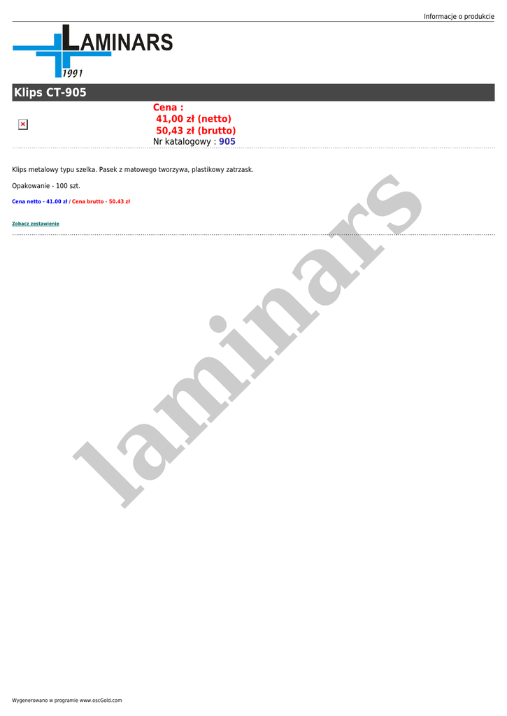 Informacje o produkcie Klips CT-905 Cena : 41,00 zł (netto) 50,43 zł (brutto) Nr katalogowy : 905 Klips metalowy typu szelka. Pasek z matowego tworzywa, plastikowy zatrzask. Cena netto - 41.00 zł / Cena brutto - 50.43 zł la m Zobacz zestawienie in ar s Opakowanie - 100 szt. Wygenerowano w programie www.oscGold.com