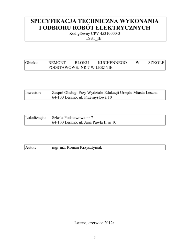 SPECYFIKACJA TECHNICZNA WYKONANIA I ODBIORU ROBÓT ELEKTRYCZNYCH Kod główny CPV 45310000-3 „SST_IE” Obiekt: REMONT BLOKU KUCHENNEGO PODSTAWOWEJ NR 7 W LESZNIE W SZKOLE Inwestor: Zespół Obsługi Przy Wydziale Edukacji Urzędu Miasta Leszna 64-100 Leszno, ul. Przemysłowa 10 Lokalizacja: Szkoła Podstawowa nr 7 64-100 Leszno, ul. Jana Pawła II nr 10 Autor: mgr inż. Roman Krzysztyniak Leszno, czerwiec 2012r. 1 1. CZĘŚĆ OGÓLNA 1.1 PRZEDMIOT SPECYFIKACJI TECHNICZNEJ Przedmiotem niniejszej Specyfikacji Technicznej są wymagania dotyczące wykonania i odbioru instalacji elektrycznych dla inwestycji „Remont bloku kuchennego w Szkole Podstawowej nr 7” w Lesznie przy ul. Jana Pawła II nr 10. 1.2 ZAKRES STOSOWANIA SPECYFIKACJI TECHNICZNEJ Szczegółowa Specyfikacja Techniczna jest stosowana jako dokument przetargowy i kontraktowy przy zlecaniu i realizacji robót wymienionych w punkcie 1.1. 1.3. ZAKRES ROBÓT OBJETYCH SPECYFIKACJĄ TECHNICZNĄ Roboty objęte niniejszą specyfikacją obejmują wszystkie czynności umożliwiające i mające na celu wykonanie instalacji elektrycznych dla inwestycji „Remont bloku kuchennego w Szkole Podstawowej nr 7” w Lesznie przy ul. Jana Pawła II nr 10. Przewidziane do wykonania prace obejmują następujący zakres: 1. Instalacje elektryczne wewnętrzne: instalacja oświetlenia, instalacja siły i gniazd wtykowych ogólnych 230V, 1.4. OKREŚLENIA PODSTAWOWE Podstawowe określenia użyte w ST są zgodne z PN-IEC 60050-826 „Międzynarodowy słownik terminologiczny elektryki - instalacje w obiektach budowlanych” oraz PN-IEC 61024-l „Ochrona odgromowa obiektów budowlanych - zasady ogólne”. Aparatura rozdzielcza i sterownicza – ogólna nazwa aparatów elektrycznych, a także zespół tych aparatów ze związanym wyposażeniem, wewnętrznymi połączeniami, osprzętem, obudowami i konstrukcjami wsporczymi – służących do łączenia, sterowania, pomiaru, zabezpieczeń i regulacji pracy obwodów elektrycznych; Główny zacisk uziemiający - gł. szyna uziemiająca lub zacisk przeznaczone do przyłączania do uziomu przewodów ochronnych, w tym przewodów połączeń wyrównawczych oraz przewodów uziemień funkcjonalnych, jeśli występują. Instalacja elektryczna – zespół odpowiednio połączonych przewodów i kabli wraz ze sprzętem i osprzętem elektroinstalacyjnym, a także urządzeniami oraz aparatami – przeznaczonymi do przesyłu, rozdziału, zabezpieczenia i zasilania odbiorników energii elektrycznej; Instalacja odbiorcza - instalacja, która znajduje się za rozliczeniowym układem pomiarowym służącym do rozliczeń miedzy dostawca a odbiorca energii elektrycznej, a w razie braku układu pomiarowego - za wyjściowymi zaciskami pierwszego urządzenia zabezpieczającego instalacje odbiorcy od strony zasilania; Kable - wyroby składające się z jednej lub większej liczby żył izolowanych, zaopatrzone w powłokę oraz ewentualnie - w zależności od warunków układania i eksploatacji w osłonę i pancerz. Kable przystosowane są do układania bezpośrednio w ziemi, wodzie lub kanałach podziemnych, albo też do zawieszenia w powietrzu; Obciążalność prądowa długotrwała (przewodu) - maksymalna wartość prądu, który może płynąć długotrwale w określonych warunkach bez przekroczenia dopuszczalnej temperatury przewodu; Obudowa, osłona - element zapewniający ochronę przed niektórymi wpływami otoczenia i przed dotykiem bezpośrednim z dowolnej strony; Obwód instalacji elektrycznej – zespół elementów instalacji elektrycznej wspólnie zasilanych i chronionych przed przetężeniami wspólnym zabezpieczeniem; 2 Obwód odbiorczy (obwód końcowy) - jest to obwód, do którego przyłączone są bezpośrednio odbiorniki energii elektrycznej lub gniazda wtyczkowe. Głównymi elementami obwodu instalacji elektrycznej są przewody (tory prądowe) umożliwiające przesyłanie energii elektrycznej, łączniki umożliwiające załączanie i wyłączanie oraz zabezpieczenia chroniące elementy obwodu przed skutkami zakłóceń; Obwód rozdzielczy - jest to obwód zasilający tablice rozdzielcze. W obiektach budowlanych role obwodów rozdzielczych pełnią wewnętrzne linie zasilające (WLZ); Ochrona przed dotykiem bezpośrednim (podstawowa) – zespół środków technicznych, chroniących przed zetknięciem się człowieka lub zwierzęcia z częściami czynnymi oraz przed pojawieniem się napięcia na częściach nie znajdujących pod napięciem w warunkach normalnej pracy instalacji; Ochrona przed dotykiem pośrednim (dodatkowa) – zespół środków technicznych, chroniących przed wynikłymi z uszkodzenia ochrony przeciwporażeniowej podstawowej, skutkami zetknięcia człowieka lub zwierzęcia z częściami przewodzącymi i/lub częściami obcymi; Ochrona przeciwporażeniowa uzupełniająca - ochrona polegająca na zastosowaniu dodatkowych urządzeń wyłączających np. różnicowoprądowych; Oprawa oświetleniowa – urządzenie służące do rozdziału, filtracji i przekształcania strumienia świetlnego wysyłanego przez źródło światła, zawierające wszystkie niezbędne detale do przymocowania i połączenia z instalacją elektryczną; Oprzewodowanie - przewód, przewody lub przewody szynowe i elementy zapewniające ich zamocowanie i ochronne przed uszkodzeniami mechanicznymi; Oświetlenie awaryjne – oświetlenie elektryczne samoczynnie włączające się w przypadku wystąpienia przerwy w zasilaniu podstawowym, mające na celu zapewnienie dostatecznej widoczności w pomieszczeniach (oświetlenie bezpieczeństwa) oraz umożliwienie ewentualnej ewakuacji ludzi z budynku (oświetlenie ewakuacyjne). Oświetlenie awaryjne jest zasilane z awaryjnych niezależnych źródeł zasilania poprzez niezależne obwody oświetleniowe lub część obwodów oświetlenia podstawowego; Połączenie wyrównawcze – elektryczne połączenie części przewodzących dostępnych i/lub części przewodzących obcych, wyk
