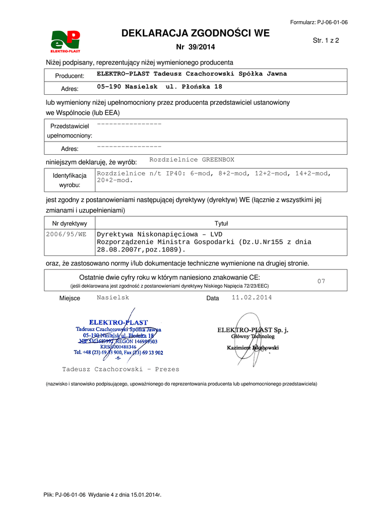 Formularz: PJ-06-01-06 DEKLARACJA ZGODNOŚCI WE Nr 39/2014 Str. 1 z 2 Niżej podpisany, reprezentujący niżej wymienionego producenta Producent: ELEKTRO-PLAST Tadeusz Czachorowski Spółka Jawna 05-190 Nasielsk Adres: ul. Płońska 18 lub wymieniony niżej upełnomocniony przez producenta przedstawiciel ustanowiony we Wspólnocie (lub EEA) Przedstawiciel ---------------- upełnomocniony: ---------------- Adres: niniejszym deklaruję, że wyrób: Identyfikacja wyrobu: Rozdzielnice GREENBOX Rozdzielnice n/t IP40: 6-mod, 8+2-mod, 12+2-mod, 14+2-mod, 20+2-mod. jest zgodny z postanowieniami następującej dyrektywy (dyrektyw) WE (łącznie z wszystkimi jej zmianami i uzupełnieniami) Nr dyrektywy 2006/95/WE Tytuł Dyrektywa Niskonapięciowa – LVD Rozporządzenie Ministra Gospodarki (Dz.U.Nr155 z dnia 28.08.2007r,poz.1089). oraz, że zastosowano normy i/lub dokumentacje techniczne wymienione na drugiej stronie. Ostatnie dwie cyfry roku w którym naniesiono znakowanie CE: (jeśli deklarowana jest zgodność z postanowieniami dyrektywy Niskiego Napięcia 72/23/EEC) Miejsce Nasielsk Data 11.02.2014 Tadeusz Czachorowski – Prezes (nazwisko i stanowisko podpisującego, upoważnionego do reprezentowania producenta lub upełnomocnionego przedstawiciela) Plik: PJ-06-01-06 Wydanie 4 z dnia 15.01.2014r. 07 Formularz: PJ-06-01-06 DEKLARACJA ZGODNOŚCI WE Str. 2 z 2 Nr 39/2014 Normy i/lub dokumentacje techniczne lub ich części zastosowane do wyrobu, którego dotyczy niniejsza deklaracja zgodności: - normy zharmonizowane: Nr Wydanie PN-EN 62208 2006 PN-EN 61439-1 2011 PN-EN 61439-3 2012 ) Tytuł Część* Puste obudowy do rozdzielnic i sterownic niskonapięciowych. Rozdzielnice i sterownice niskonapięciowe. - inne normy i/lub dokumentacje techniczne: Nr Wydanie ) Tytuł Część* Inne dokumenty nie występują - inne rozwiązania techniczne, szczegóły, które zostały włączone do dokumentacji technicznej lub konstrukcyjnej: Skrzynka Skrzynka Skrzynka Skrzynka Skrzynka Skrzynka Skrzynka Skrzynka Skrzynka Skrzynka Skrzynka Skrzynka Skrzynka Skrzynka Skrzynka Greenbox Greenbox Greenbox Greenbox Greenbox Greenbox Greenbox Greenbox Greenbox Greenbox Greenbox Greenbox Greenbox Greenbox Greenbox n/t n/t n/t n/t n/t n/t n/t n/t n/t n/t n/t n/t n/t n/t n/t 6-mod(N+PE)IP40 szyba biała 6-mod(N+PE)IP40 szyba transp 6-mod(N+PE)IP40 szyba dymna 8+2-mod(N+PE)IP40 szyba biała 8+2-mod(N+PE)IP40 szyba transp 8+2-mod(N+PE)IP40 szyba dymna 12+2-mod(N+PE)IP40 szyba biała 12+2-mod(N+PE)IP40 szyba trans 12+2-mod(N+PE)IP40 szyba dymna 14+2-mod(N+PE)IP40 szyba biała 14+2-mod(N+PE)IP40 szyba trans 14+2-mod(N+PE)IP40 szyba dymna 20+2-mod(N+PE)IP40 szyba biała 20+2-mod(N+PE)IP40 szyba trans 20+2-mod(N+PE)IP40 szyba dymna nr nr nr nr nr nr nr nr nr nr nr nr nr nr nr - inne dokumenty lub informacje wymagane właściwą dyrektywą (dyrektywami) WE: Inne dokumenty nie występują *) Należy wypełnić w przypadku powoływania się na części lub rozdziały normy lub dokumentacji technicznej Plik: PJ-06-01-06 Wydanie 4 z dnia 15.01.2014r. kat kat kat kat kat kat kat kat kat kat kat kat kat kat kat 0688-00 0688-01 0688-02 0689-00 0689-01 0689-02 0690-00 0690-01 0690-02 0691-00 0691-01 0691-02 0692-00 0692-01 0692-02