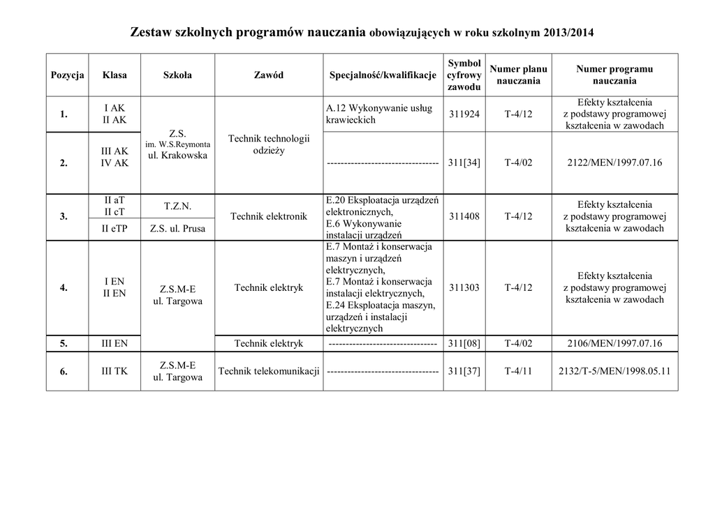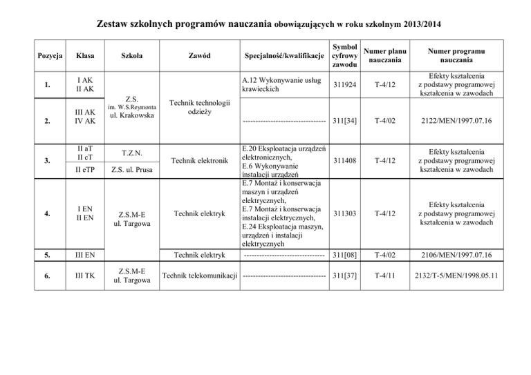 ZESTAW SZKOLNYCH PROGRAMÓW NAUCZANIA 2013/2014
