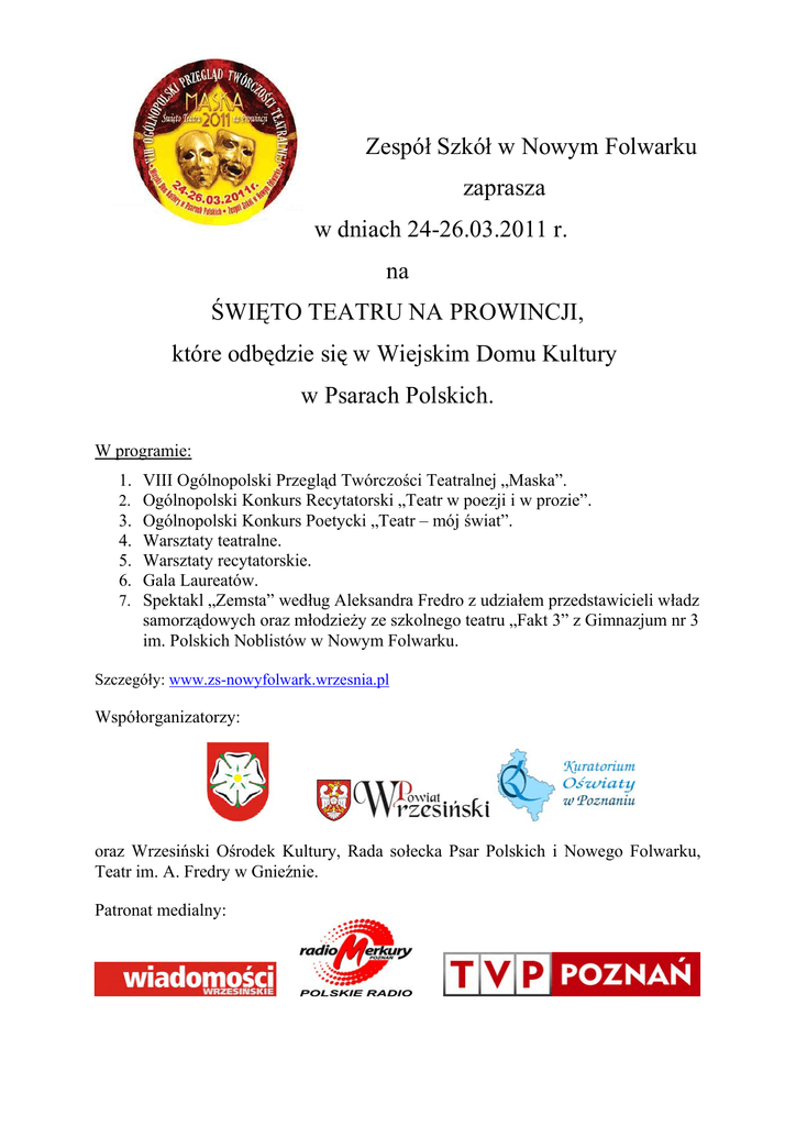 Zespół Szkół w Nowym Folwarku zaprasza w dniach 24-26.03.2011 r. na ŚWIĘTO TEATRU NA PROWINCJI, które odbędzie się w Wiejskim Domu Kultury w Psarach Polskich. W programie: 1. VIII Ogólnopolski Przegląd Twórczości Teatralnej „Maska”. 2. Ogólnopolski Konkurs Recytatorski „Teatr w poezji i w prozie”. 3. Ogólnopolski Konkurs Poetycki „Teatr – mój świat”. 4. Warsztaty teatralne. 5. Warsztaty recytatorskie. 6. Gala Laureatów. 7. Spektakl „Zemsta” według Aleksandra Fredro z udziałem przedstawicieli władz samorządowych oraz młodzieży ze szkolnego teatru „Fakt 3” z Gimnazjum nr 3 im. Polskich Noblistów w Nowym Folwarku. Szczegóły: www.zs-nowyfolwark.wrzesnia.pl Współorganizatorzy: oraz Wrzesiński Ośrodek Kultury, Rada sołecka Psar Polskich i Nowego Folwarku, Teatr im. A. Fredry w Gnieźnie. Patronat medialny: