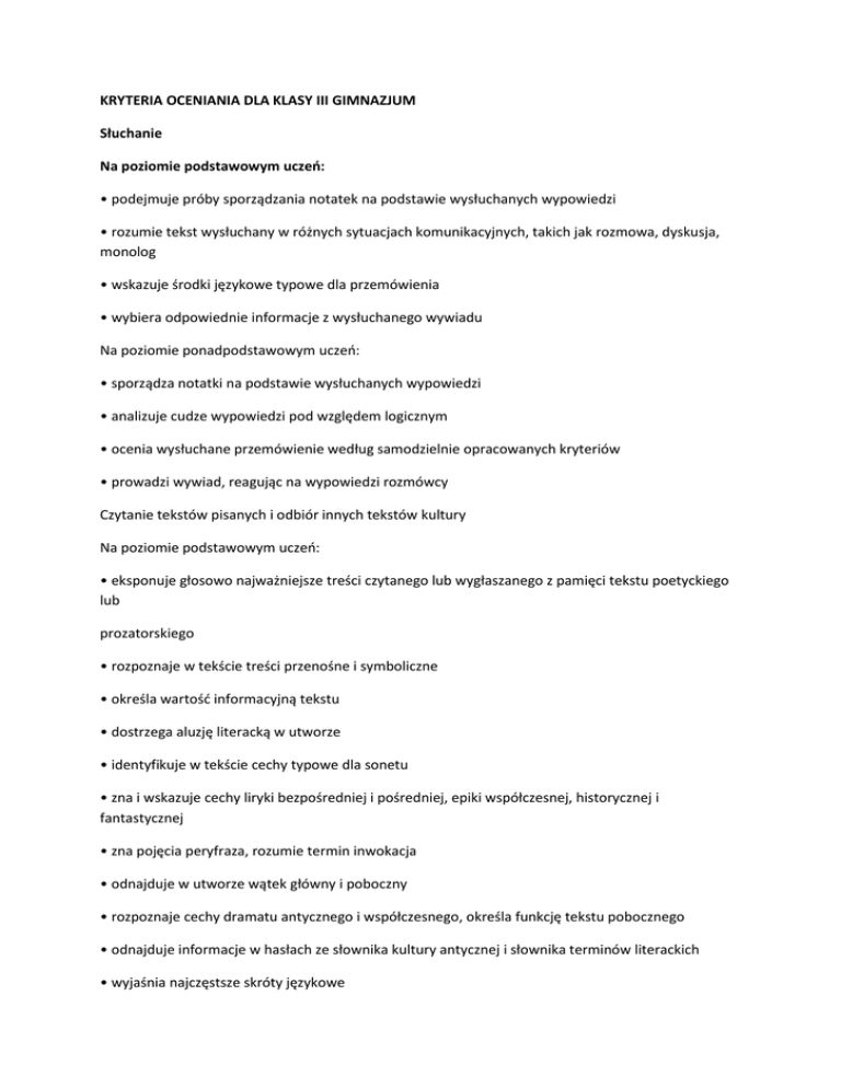 KRYTERIA OCENIANIA DLA KLASY III GIMNAZJUM Słuchanie Na poziomie podstawowym uczeo: • podejmuje próby sporządzania notatek na podstawie wysłuchanych wypowiedzi • rozumie tekst wysłuchany w różnych sytuacjach komunikacyjnych, takich jak rozmowa, dyskusja, monolog • wskazuje środki językowe typowe dla przemówienia • wybiera odpowiednie informacje z wysłuchanego wywiadu Na poziomie ponadpodstawowym uczeo: • sporządza notatki na podstawie wysłuchanych wypowiedzi • analizuje cudze wypowiedzi pod względem logicznym • ocenia wysłuchane przemówienie według samodzielnie opracowanych kryteriów • prowadzi wywiad, reagując na wypowiedzi rozmówcy Czytanie tekstów pisanych i odbiór innych tekstów kultury Na poziomie podstawowym uczeo: • eksponuje głosowo najważniejsze treści czytanego lub wygłaszanego z pamięci tekstu poetyckiego lub prozatorskiego • rozpoznaje w tekście treści przenośne i symboliczne • określa wartośd informacyjną tekstu • dostrzega aluzję literacką w utworze • identyfikuje w tekście cechy typowe dla sonetu • zna i wskazuje cechy liryki bezpośredniej i pośredniej, epiki współczesnej, historycznej i fantastycznej • zna pojęcia peryfraza, rozumie termin inwokacja • odnajduje w utworze wątek główny i poboczny • rozpoznaje cechy dramatu antycznego i współczesnego, określa funkcję tekstu pobocznego • odnajduje informacje w hasłach ze słownika kultury antycznej i słownika terminów literackich • wyjaśnia najczęstsze skróty językowe • rozumie informacje zawarte w zapisie bibliograficznym • zna cechy charakterystyczne reportażu i komiksu, melodramatu, westernu, horroru, thrillera, komedii, dramatu psychologicznego, telenoweli • wskazuje elementy tragiczne i komiczne w utworze Na poziomie ponadpodstawowym uczeo: • interpretuje głosowo czytany lub wygłaszany z pamięci tekst poetycki lub prozatorski • analizuje utwór na poziomie przenośnym i symbolicznym • ocenia wartośd informacyjną tekstu • wyjaśnia aluzję literacką • dostrzega w tekście ironię • posługuje się terminami sonet, inwokacja, liryka pośrednia i bezpośrednia • wskazuje peryfrazę w utworze poetyckim • porównuje cechy epiki współczesnej, historycznej i fantastycznej • porównuje dramat antyczny i współczesny • posługuje się słownikiem kultury antycznej i słownikiem terminów literackich • odnajduje w słowniku języka polskiego wiadomości gramatyczne, m.in. wzory odmiany rzeczowników • posługuje się katalogiem bibliotecznym i bibliografią • wyróżnia w tekście cechy charakterystyczne reportażu, komiksu, melodramatu, westernu, horroru, thrillera, komedii, dramatu psychologicznego, telenoweli • omawia związki dzieła sztuki z prądami filozoficznymi, kierunkami w sztuce, obyczajami, religią • analizuje niejednorodności stylowe w tekstach kultury i wyjaśnia absurdalnośd świata przedstawionego w grotesce Mówienie Na poziomie podstawowym uczeo: • moduluje głos w celu nadania wypowiedzi odpowiedniego sensu • zbiera i porządkuje argumenty według ich ważności • wygłasza przemówienie według sporządzonego wcześniej planu • uczestniczy w dyskusji, zachowując zasady kulturalnej rozmowy • wzbogaca opowiadanie opisem • sporządza charakterystykę postaci rzeczywistej i literackiej, autocharakterystykę • dobiera do przemówienia odpowiednie cytaty spośród podanych • wygłasza z pamięci fragmenty prozy i poezji, próbuje podkreślid głosowo ich najważniejsze treści • wypowiada się na temat wypowiedzi innych osób Na poziomie ponadpodstawowym uczeo: • wykorzystuje argumenty poparte odpowiednimi przykładami w celu przekonania innych do własnego stanowiska w dyskusji • posługuje się odpowiednio dobranymi figurami retorycznymi podczas wygłaszania przemówienia • formułuje i komentuje podsumowanie dyskusji • układa charakterystykę porównawczą • nagrywa wywiad z osobą rzeczywistą według przygotowanego planu (uczeo w roli dziennikarza) • wprowadza cytat do przemówienia • interpretuje głosowo teksty wygłaszane z pamięci • analizuje i ocenia wypowiedzi innych osób pod względem zawartości merytorycznej i poprawności językowej oraz artykulacyjnej Pisanie Na poziomie podstawowym uczeo: • redaguje poprawne logicznie teksty zgodne z tematem, o przejrzystej kompozycji, prawidłowe pod względem stylistycznym i językowym, ortograficznym i interpunkcyjnym • opisuje dzieło sztuki • wprowadza do opowiadania elementy charakterystyki bohatera • przedstawia logiczną argumentację w wypowiedzi poruszającej tematykę związaną z historią, filozofią i sztuką • porównuje postaci literackie i rzeczywiste (ich charakter, usposobienie, postawy) • charakteryzuje zbiorowośd • redaguje list prywatny i oficjalny, kartkę z dziennika i pamiętnika • krytycznie omawia elementy tekstu kultury, stosuje odpowiednio dobrane środki wyrazu • sporządza opis bibliograficzny artykułu z czasopisma • zapisuje wywiad z osobą rzeczywistą lub fikcyjną • redaguje streszczenie tekstu literackiego, w którym zastosowano inwersję czasową fabuły, i dłuższego tekstu popularnonaukowego • redaguje podanie, życiorys, CV Na poziomie ponadpodstawowym uczeo: • układa teksty o charakterze ironicznym, stosuje puentę • opisuje i interpretuje dzieło sztuki • stosuje w opowiadaniu elementy charakterystyki pośredniej bohatera • indywidualizuje język bohatera • redaguje rozprawki poruszające tematy związane z historią, filozofią, sztuką, wprowadzając do tekstu rozważao cytaty z tekstów filozoficznych, łacioskie sentencje na poparcie prezentowanego stanowiska • redaguje charakterystykę porównawczą • stylizuje język listu na język dawnych epok, uwzględnia realia epoki • wzbogaca list, kartkę z dziennika, pamiętnika opisem przeżyd i charakterystyką • redaguje do gazetki szkolnej recenzję z