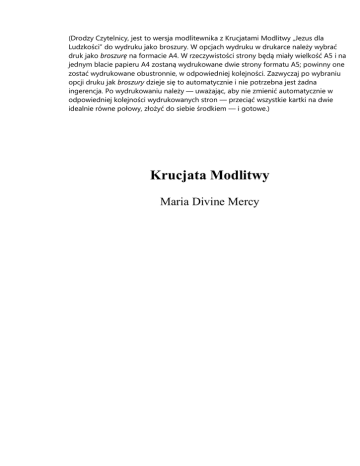 (Drodzy Czytelnicy, jest to wersja modlitewnika z Krucjatami Modlitwy „Jezus dla Ludzkości” do wydruku jako broszury. W opcjach wydruku w drukarce należy wybrać druk jako broszurę na formacie A4. W rzeczywistości strony będą miały wielkość A5 i na jednym blacie papieru A4 zostaną wydrukowane dwie strony formatu A5; powinny one zostać wydrukowane obustronnie, w odpowiedniej kolejności. Zazwyczaj po wybraniu opcji druku jak broszury dzieje się to automatycznie i nie potrzebna jest żadna ingerencja. Po wydrukowaniu należy — uważając, aby nie zmienić automatycznie w odpowiedniej kolejności wydrukowanych stron — przeciąć wszystkie kartki na dwie idealnie równe połowy, złożyć do siebie środkiem — i gotowe.) Krucjata Modlitwy Maria Divine Mercy Poświęcam: Bożej Matce, Matce Zbawienia Krucjata Modlitw Modlitwy podyktowane przez Niebo Lokucje przekazane Marii Bożego Miłosierdzia – Maria Divine Mercy – od listopada 2011 Modlitwy Krucjaty Modlitwy Litanie Krucjaty Modlitwy Inne Modlitwy Angielski oryginał na stronie: www.thewarningsecondcoming.com Geneza powstania tego Modlitewnika Modlitwy zawarte w tej książeczce nie pochodzą od człowieka. Zostały one przekazane zwyczajnej kobiecie, mężatce i matce, żyjącej w Europie, która została wezwana, aby głosić Słowo Boże. Otrzymała ona ponad 700 orędzi z nieba w codziennych przekazach od listopada 2010 roku, pragnąc przy tym pozostać nieznaną i poza jakąkolwiek sławą. Wszystkie te orędzia stanowią główną treść strony internetowej: www.thewarningsecondcoming.com Orędzia te odsłaniają Boży Plan wobec umierającego świata, dotyczący tego wszystkiego, co ujawni się w czasach ostatecznych, wiodących do Drugiego Przyjścia Jezusa Chrystusa. Owe wizje, orędzia i modlitwy zostały jej przekazane za pośrednictwem Ducha Świętego i są przedstawione w tej książeczce tak, jak zostały podyktowane tej Bożej służebnicy o imieniu Maria Bożego Miłosierdzia. Tak samo było za dni, gdy narodził się Jezus – Bóg wysłał swojego proroka, Jana Chrzciciela, aby „prostował drogę Pańską” i ostrzegł naród Izraela, że proroctwa Izajasza, dotyczące Mesjasza, wkrótce się wypełnią. Orędzie Jana wzywało ludzi, aby się przygotowali na przyjście Mesjasza poprzez pokutę i duchowe oczyszczenie. Dzisiaj jest nam przekazywane to samo orędzie – że Mesjasz wkrótce powróci i że musimy być na to duchowo przygotowani. W przeciwnym wypadku zostaniemy zaskoczeni i staniemy przed Bogiem w śmiertelnym zawstydzeniu, bo nasze grzechy zostaną bez ogródek odsłonięte i ogarnie nas szok, którego nie można sobie w ogóle wyobrazić czy pojąć. Na przestrzeni historii Boży prorocy byli odrzucani, czego najjaskrawszym przykładem jest Jedyny Syn Boga, Który został ukrzyżowany przez tych samych ludzi, których przyszedł ocalić. Moglibyśmy przypuszczać, że dzisiaj Boży wysłannicy, a w rzeczywistości Sam Bóg może nie zostać przyjęty inaczej, niż za dni Jana Chrzciciela. A jednak jest naszym obowiązkiem, by uważnie słuchać tych głosów „wołających na pustyni”, nawołujących nas, aby porzucić wszystko, co jest grzeszne, i powrócić do naszego Stworzyciela z otwartymi sercami, chętnymi na przyjęcie od Boga przebaczenia i Jego Łaski. Odrzucenie tych orędzi – bez zastanowienia się – naraża nas na to samo niebezpieczeństwo, co tych, którzy odrzucili Jana Chrzciciela, a następnie Syna Bożego, Jezusa Chrystusa. Dzięki przyjęciu Bożej Prawdy i podążaniu za nią, gdziekolwiek nas ona nie powiedzie, stajemy się jak rodziny Noego i Lota, i możemy zostać oszczędzeni od nadchodzących kar, które wkrótce zostaną wylane na ten urągliwy i zeświecczały świat. Chociaż czas ucieka, Jezus wyciąga do nas Swoją Dłoń pojednania, tak aby żadna dusza nie została zgubiona. Nieważne, jak daleko zabłądziliśmy, oddalając się od Jezusa, gdyż poprzez przyjęcie Jego Miłosierdzia i zezwalając Mu na wejście do naszych serc, ciągle możemy poznać radość zostania pojednanym z naszym Stworzycielem, gdy wkroczymy do Wiecznego Królestwa Bożego. Kiedy będziecie czytać modlitwy zapisane w tej książeczce, otwórzcie wasze serce i módlcie się, aby Duch Święty do was przemówił, oświecił wasze serce i udzielił wam łaski, abyście rozpoznali źródło, z którego pochodzą słowa, znajdujące się na niniejszych stronach. Uwaga dla polskich Czytelników: Pisownia małą i wielką literą nie zawsze odpowiada zasadom polskiej pisowni, co podyktowane jest chęcią podkreślenia bądź uroczystego, bądź szczególnie pozytywnego, bądź szczególnie negatywnego znaczenia niektórych pojęć, nazw i tytułów. Krucjaty Modlitwy i Litanie Spis Treści Modlitwy Krucjaty Modlitwy Modlitwy dla kapłanów zaznaczone są tłustym drukiem (1) Mój dar dla Jezusa, dla ratowania dusz 17 listopada 2011 (2) Modlitwa za światowych przywódców 18 listopada 2011 (3) Uwolnić świat od lęku 19 listopada 2011 (4) Zjednoczyć wszystkie Rodziny 20 listopada 2011 (5) Chwała Bogu Najwyższemu 21 listopada 2011 (6) Modlitwa o powstrzymanie antychrysta 22 listopada 2011 (7) Modlitwa za odrzucających Miłosierdzie 22 listopada 2011 (8) Spowiedź 22 listopada 2011 (9) Ofiarowanie cierpienia jako daru 28 listopada 2011 (10) Nieść płomień Twojej miłości 29 listopada 2011 (11) Powstrzymanie nienawiści wobec wizjonerów 30 listopada 2011 (12) Modlitwa o uniknięcie Grzechu Pychy 3 grudnia 2011 (13) Modlitwa o ochronę od potępienia 11 grudnia 2011 (14) Modlitwa do Boga Ojca o ochronę przed Wojną Atomową 14 grudnia 2011 (15) Podziękowanie za dar Bożego Miłosierdzia 15 grudnia 2011 (16) Przyjęcie łask ofiarowanych podczas Ostrzeżenia 31 grudnia 2011 (17) Modlitwa do Matki Zbawienia za Ciemne Dusze 1 stycznia 2012 (18) Powstrzymanie antychrysta i jego grupy 11 stycznia 2012 (19) Modlitwa za młodych ludzi 13 stycznia 2012 (20) Powstrzy