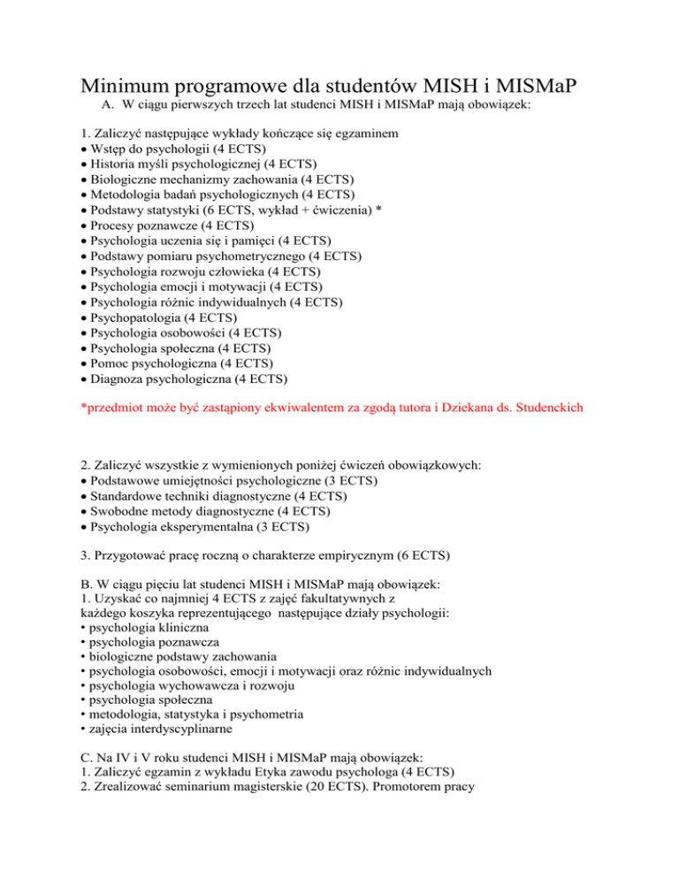 Minimum programowe dla studentów MISH i MISMaP A. W ciągu pierwszych trzech lat studenci MISH i MISMaP mają obowiązek: 1. Zaliczyć następujące wykłady kończące się egzaminem • Wstęp do psychologii (4 ECTS) • Historia myśli psychologicznej (4 ECTS) • Biologiczne mechanizmy zachowania (4 ECTS) • Metodologia badań psychologicznych (4 ECTS) • Podstawy statystyki (6 ECTS, wykład + ćwiczenia) * • Procesy poznawcze (4 ECTS) • Psychologia uczenia się i pamięci (4 ECTS) • Podstawy pomiaru psychometrycznego (4 ECTS) • Psychologia rozwoju człowieka (4 ECTS) • Psychologia emocji i motywacji (4 ECTS) • Psychologia różnic indywidualnych (4 ECTS) • Psychopatologia (4 ECTS) • Psychologia osobowości (4 ECTS) • Psychologia społeczna (4 ECTS) • Pomoc psychologiczna (4 ECTS) • Diagnoza psychologiczna (4 ECTS) *przedmiot może być zastąpiony ekwiwalentem za zgodą tutora i Dziekana ds. Studenckich 2. Zaliczyć wszystkie z wymienionych poniżej ćwiczeń obowiązkowych: • Podstawowe umiejętności psychologiczne (3 ECTS) • Standardowe techniki diagnostyczne (4 ECTS) • Swobodne metody diagnostyczne (4 ECTS) • Psychologia eksperymentalna (3 ECTS) 3. Przygotować pracę roczną o charakterze empirycznym (6 ECTS) B. W ciągu pięciu lat studenci MISH i MISMaP mają obowiązek: 1. Uzyskać co najmniej 4 ECTS z zajęć fakultatywnych z każdego koszyka reprezentującego następujące działy psychologii: • psychologia kliniczna • psychologia poznawcza • biologiczne podstawy zachowania • psychologia osobowości, emocji i motywacji oraz różnic indywidualnych • psychologia wychowawcza i rozwoju • psychologia społeczna • metodologia, statystyka i psychometria • zajęcia interdyscyplinarne C. Na IV i V roku studenci MISH i MISMaP mają obowiązek: 1. Zaliczyć egzamin z wykładu Etyka zawodu psychologa (4 ECTS) 2. Zrealizować seminarium magisterskie (20 ECTS). Promotorem pracy magisterskiej powinien być pracownik naukowy Wydziału Psychologii. 3. Zrealizować zajęcia z wybranej specjalizacji psychologicznej (48 ECTS) lub też zrealizować wybrane zajęcia z wymienionych wyżej modułów specjalizacyjnych oraz z innych kursów psychologii stosowanej w ramach tzw. specjalizacji ‘psychologia ogólna’ o łącznej wartości 48 ECTS. Jeżeli przedmioty specjalizacyjne mają łącznie mniej niż 48 pkt ECTS, należy uzupełnić brakującą liczbę punktów przedmiotami z innych specjalizacji. Specjalizacje: • Neuropsychologia kliniczna • Psychologia kliniczna dziecka i rodziny • Psychologia organizacji i pracy • Psychologia sądowa • Psychologia wychowawcza stosowana • Psychologia zdrowia • Psychometria stosowana • Psychoterapia • Wspieranie rozwoju osobowości • Psychologia ekonomiczna • Psychologia środowiskowa • Psychologia rehabilitacyjna D. Studentom MISH i MISMaP rekomendowane jest zaliczenie dodatkowych zajęć z koszyków zajęć fakultatywnych czy kursów z psychologii stosowanej (łącznie: co najmniej 30 ECTS). UWAGA! Uprzejmie informuję, że studenci MISH, tak jak wszyscy studenci Psychologii, mogą zapisywać się na zajęcia zgodnie z obowiązującym kalendarzem. Przypominam jednocześnie, że nie ma możliwości wyrejestrowania z zajęć, na które Państwo zapisaliście się w I lub II turze rejestracji (z wyjątkiem sytuacji opisanych w par. 23 b. Regulaminu Studiowania na UW). Proszę więc o przemyślane wybory i decyzje.