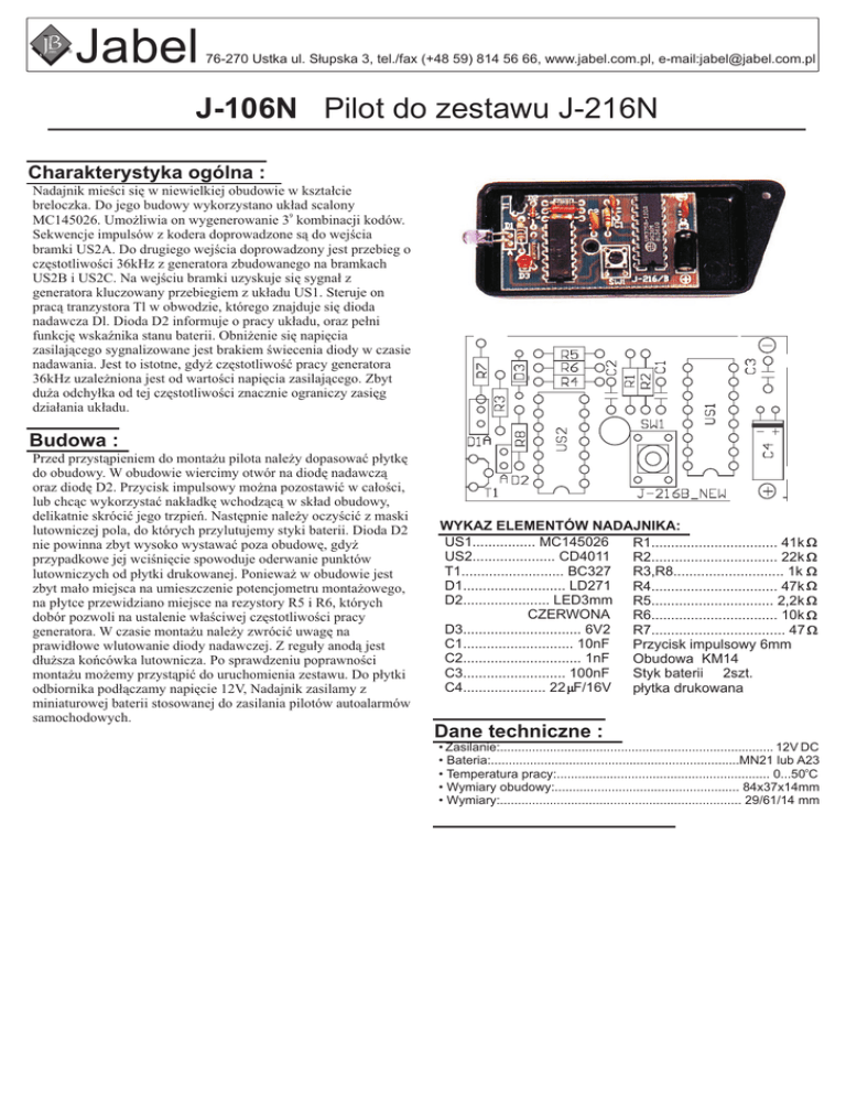 JABEL ® Jabel 76-270 Ustka ul. S³upska 3, tel./fax (+48 59) 814 56 66, www.jabel.com.pl, e-mail:[email protected] J-106N Pilot do zestawu J-216N Charakterystyka ogólna : Nadajnik mieœci siê w niewielkiej obudowie w kszta³cie breloczka. Do jego budowy wykorzystano uk³ad scalony MC145026. Umo¿liwia on wygenerowanie 39 kombinacji kodów. Sekwencje impulsów z kodera doprowadzone s¹ do wejœcia bramki US2A. Do drugiego wejœcia doprowadzony jest przebieg o czêstotliwoœci 36kHz z generatora zbudowanego na bramkach US2B i US2C. Na wejœciu bramki uzyskuje siê sygna³ z generatora kluczowany przebiegiem z uk³adu US1. Steruje on prac¹ tranzystora Tl w obwodzie, którego znajduje siê dioda nadawcza Dl. Dioda D2 informuje o pracy uk³adu, oraz pe³ni funkcjê wskaŸnika stanu baterii. Obni¿enie siê napiêcia zasilaj¹cego sygnalizowane jest brakiem œwiecenia diody w czasie nadawania. Jest to istotne, gdy¿ czêstotliwoœæ pracy generatora 36kHz uzale¿niona jest od wartoœci napiêcia zasilaj¹cego. Zbyt du¿a odchy³ka od tej czêstotliwoœci znacznie ograniczy zasiêg dzia³ania uk³adu. Budowa : Przed przyst¹pieniem do monta¿u pilota nale¿y dopasowaæ p³ytkê do obudowy. W obudowie wiercimy otwór na diodê nadawcz¹ oraz diodê D2. Przycisk impulsowy mo¿na pozostawiæ w ca³oœci, lub chc¹c wykorzystaæ nak³adkê wchodz¹c¹ w sk³ad obudowy, delikatnie skróciæ jego trzpieñ. Nastêpnie nale¿y oczyœciæ z maski lutowniczej pola, do których przylutujemy styki baterii. Dioda D2 nie powinna zbyt wysoko wystawaæ poza obudowê, gdy¿ przypadkowe jej wciœniêcie spowoduje oderwanie punktów lutowniczych od p³ytki drukowanej. Poniewa¿ w obudowie jest zbyt ma³o miejsca na umieszczenie potencjometru monta¿owego, na p³ytce przewidziano miejsce na rezystory R5 i R6, których dobór pozwoli na ustalenie w³aœciwej czêstotliwoœci pracy generatora. W czasie monta¿u nale¿y zwróciæ uwagê na prawid³owe wlutowanie diody nadawczej. Z regu³y anod¹ jest d³u¿sza koñcówka lutownicza. Po sprawdzeniu poprawnoœci monta¿u mo¿emy przyst¹piæ do uruchomienia zestawu. Do p³ytki odbiornika pod³¹czamy napiêcie 12V, Nadajnik zasilamy z miniaturowej baterii stosowanej do zasilania pilotów autoalarmów samochodowych. WYKAZ ELEMENTÓW NADAJNIKA: US1................ MC145026 R1................................ 41k US2..................... CD4011 R2................................ 22k T1.......................... BC327 R3,R8............................ 1k D1.......................... LD271 R4................................ 47k D2...................... LED3mm R5............................... 2,2k CZERWONA R6................................ 10k D3.............................. 6V2 R7.................................. 47 C1............................ 10nF Przycisk impulsowy 6mm C2.............................. 1nF Obudowa KM14 C3.......................... 100nF Styk baterii 2szt. C4..................... 22 F/16V p³ytka drukowana Dane techniczne : • Zasilanie:............................................................................. 12V DC • Bateria:......................................................................MN21 lub A23 o • Temperatura pracy:............................................................ 0...50 C • Wymiary obudowy:.................................................... 84x37x14mm • Wymiary:.................................................................... 29/61/14 mm