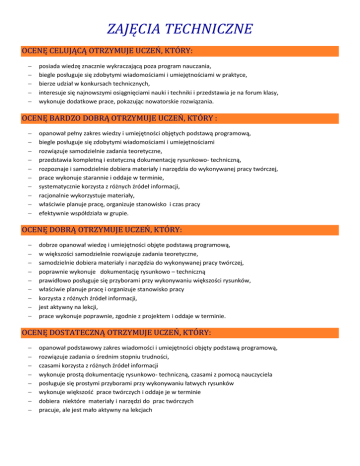 ZAJĘCIA TECHNICZNE OCENĘ CELUJĄCĄ OTRZYMUJE UCZEŃ, KTÓRY:      posiada wiedzę znacznie wykraczającą poza program nauczania, biegle posługuje się zdobytymi wiadomościami i umiejętnościami w praktyce, bierze udział w konkursach technicznych, interesuje się najnowszymi osiągnięciami nauki i techniki i przedstawia je na forum klasy, wykonuje dodatkowe prace, pokazując nowatorskie rozwiązania. OCENĘ BARDZO DOBRĄ OTRZYMUJE UCZEŃ, KTÓRY :           opanował pełny zakres wiedzy i umiejętności objętych podstawą programową, biegle posługuje się zdobytymi wiadomościami i umiejętnościami rozwiązuje samodzielnie zadania teoretyczne, przedstawia kompletną i estetyczną dokumentację rysunkowo- techniczną, rozpoznaje i samodzielnie dobiera materiały i narzędzia do wykonywanej pracy twórczej, prace wykonuje starannie i oddaje w terminie, systematycznie korzysta z różnych źródeł informacji, racjonalnie wykorzystuje materiały, właściwie planuje pracę, organizuje stanowisko i czas pracy efektywnie współdziała w grupie. OCENĘ DOBRĄ OTRZYMUJE UCZEŃ, KTÓRY:          dobrze opanował wiedzę i umiejętności objęte podstawą programową, w większości samodzielnie rozwiązuje zadania teoretyczne, samodzielnie dobiera materiały i narzędzia do wykonywanej pracy twórczej, poprawnie wykonuje dokumentację rysunkowo – techniczną prawidłowo posługuje się przyborami przy wykonywaniu większości rysunków, właściwie planuje pracę i organizuje stanowisko pracy korzysta z różnych źródeł informacji, jest aktywny na lekcji, prace wykonuje poprawnie, zgodnie z projektem i oddaje w terminie. OCENĘ DOSTATECZNĄ OTRZYMUJE UCZEŃ, KTÓRY:         opanował podstawowy zakres wiadomości i umiejętności objęty podstawą programową, rozwiązuje zadania o średnim stopniu trudności, czasami korzysta z różnych źródeł informacji wykonuje prostą dokumentację rysunkowo- techniczną, czasami z pomocą nauczyciela posługuje się prostymi przyborami przy wykonywaniu łatwych rysunków wykonuje większość prace twórczych i oddaje je w terminie dobiera niektóre materiały i narzędzi do prac twórczych pracuje, ale jest mało aktywny na lekcjach OCENĘ DOPUSZCZAJĄCĄ OTRZYMUJE UCZEŃ, KTÓRY:      opanował konieczny zakres wiedzy i umiejętności objętych podstawą programową wykonuje z pomocą nauczyciela zadania i prace o małym stopniu trudności z pomocą nauczyciela poprawnie posługuje się prostymi przyborami przy wykonaniu łatwych rysunków z pomocą nauczyciela rozpoznaje niektóre materiały i narzędzia i dobiera je do wykonania prostych prac twórczych wymaga kierowania i zachęty do pracy oraz dłuższego czasu na wykonanie zadań. FORMY SPRAWDZANIA WIEDZY I UMIEJĘTNOŚCI: Odpowiedź pisemna (kartkówka z 3 ostatnich lekcji teoretycznych),ćwiczenia wykonane w zeszycie lub zeszycie ćwiczeń, odpowiedź ustna, pomiar wielkości, prace twórcze, dokumentacja rysunkowo- techniczna, obserwacja pracy ucznia. Ocenianiu podlega: Wykorzystanie wiedzy i umiejętności w praktyce, zaangażowanie, przygotowanie stanowiska i właściwa organizacja pracy, pomysłowość, estetyka i terminowość wykonania prac. 1. Każdy uczeń ma obowiązek przestrzegać przepisy BHP, prawidłowo i bezpiecznie posługiwać się narzędziami i przyborami. 2. Raz w ciągu okresu uczeń może być nieprzygotowany do lekcji i zgłasza ten fakt nauczycielowi przed lekcją. 3. Obowiązkowo na każdą lekcję uczeń musi posiadać określone wcześniej materiały, zeszyt i podręcznik. 4. W przypadku braku materiałów do pracy twórczej, uczeń otrzymuje ocenę niedostateczną za pracę na lekcji. 5. Nieobecność ucznia w szkole nie zwalnia go z obowiązku pisania kartkówki, wykonania zadań rysunkowych, pracy twórczej. Prace te uczeń wykona na zajęciach dodatkowych w terminie ustalonym przez nauczyciela. 6. Praca twórcza powinna być wykonane na lekcji. Za pozwoleniem nauczyciela może być dokończona w domu. 7. Uczeń może poprawić ocenę z pracy praktycznej lub ćwiczeń rysunkowych w okresie 2 tygodni. Chęć poprawy oceny zgłasza w tym samym dniu w którym otrzymał ocenę. Pracę poprawia w obecności nauczyciela na dodatkowych zajęciach.