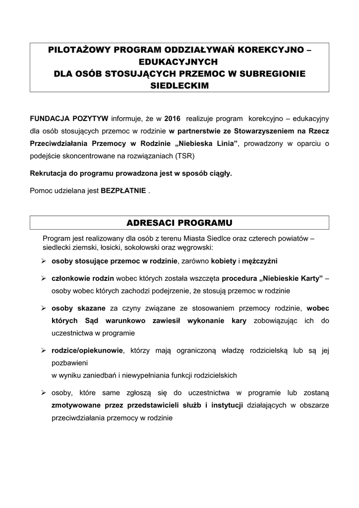 PILOTAŻOWY PROGRAM ODDZIAŁYWAŃ KOREKCYJNO – EDUKACYJNYCH DLA OSÓB STOSUJĄCYCH PRZEMOC W SUBREGIONIE SIEDLECKIM FUNDACJA POZYTYW informuje, że w 2016 realizuje program korekcyjno – edukacyjny dla osób stosujących przemoc w rodzinie w partnerstwie ze Stowarzyszeniem na Rzecz Przeciwdziałania Przemocy w Rodzinie „Niebieska Linia”, prowadzony w oparciu o podejście skoncentrowane na rozwiązaniach (TSR) Rekrutacja do programu prowadzona jest w sposób ciągły. Pomoc udzielana jest BEZPŁATNIE . ADRESACI PROGRAMU Program jest realizowany dla osób z terenu Miasta Siedlce oraz czterech powiatów – siedlecki ziemski, łosicki, sokołowski oraz węgrowski: osoby stosujące przemoc w rodzinie, zarówno kobiety i mężczyźni członkowie rodzin wobec których została wszczęta procedura „Niebieskie Karty” – osoby wobec których zachodzi podejrzenie, że stosują przemoc w rodzinie osoby skazane za czyny związane ze stosowaniem przemocy rodzinie, wobec których Sąd warunkowo zawiesił wykonanie kary zobowiązując ich do uczestnictwa w programie rodzice/opiekunowie, którzy mają ograniczoną władzę rodzicielską lub są jej pozbawieni w wyniku zaniedbań i niewypełniania funkcji rodzicielskich osoby, które same zgłoszą się do uczestnictwa w programie lub zostaną zmotywowane przez przedstawicieli służb i instytucji działających w obszarze przeciwdziałania przemocy w rodzinie OFEROWANA POMOC W ramach programu każdy uczestnik bierze udział w: - konsultacji wstępnej -diagnostyczneji/lub konsultacjach motywujących do udziału w grupie - 10 spotkaniach grupy korekcyjno-edukacyjnej [każde spotkanie trwa 3 godziny] - konsultacji indywidualnej specjalistycznej WARUNKIEM OTRZYMANIA ZAŚWIADCZENIA O UKOŃCZENIU PROGRAMU jest udział w co najmniej 70% różnych form oddziaływań (grupowych i indywidualnych) Na każdym etapie udziału możliwe jest otrzymanie przez uczestnika potwierdzenia o zakwalifikowaniu do programu i ilości godzin uczestnictwa W razie pytań lub wątpliwości zapraszamy do kontaktu z pracownikiem Punktu Konsultacyjnego programu Elżbietą Roszczak tel. 693 570 205, [email protected] ZAPISY telefonicznie od poniedziałku do piątku w godzinach 9.00 -15.00 lub osobiście w poniedziałki i środy po wcześniejszym telefonicznym umówieniu się na godzinę w Punktach Konsultacyjnych: w Siedlcach – ul. Bpa Świrskiego 57, pokój nr 18, parter (siedziba Centrum Wolontariatu przy Caritas) w Łosicach ul. 11-go Listopada 1- siedziba FUNDACJI POZYTYW (wejście od Urzędu Skarbowego w Łosicach ) Bliższe informacje, w tym harmonogram pracy Punktu Konsultacyjnego na stronie internetowej www.fundacjapozytyw.pl 693 570 205 Zapraszamy do współpracy ! Zadanie publiczne zlecone przez Zarząd Województwa Mazowieckiego pn.: „Realizacja programów oddziaływań korekcyjno – edukacyjnych do osób stosujących przemoc w rodzinie”.