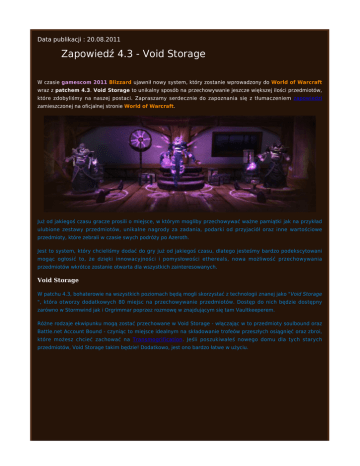 Data publikacji : 20.08.2011 Zapowiedź 4.3 - Void Storage W czasie gamescom 2011 Blizzard ujawnił nowy system, który zostanie wprowadzony do World of Warcraft wraz z patchem 4.3. Void Storage to unikalny sposób na przechowywanie jeszcze większej ilości przedmiotów, które zdobyliśmy na naszej postaci. Zapraszamy serdecznie do zapoznania się z tłumaczeniem zapowiedzi zamieszczonej na oficjalnej stronie World of Warcraft. Już od jakiegoś czasu gracze prosili o miejsce, w którym mogliby przechowywać ważne pamiątki jak na przykład ulubione zestawy przedmiotów, unikalne nagrody za zadania, podarki od przyjaciół oraz inne wartościowe przedmioty, które zebrali w czasie swych podróży po Azeroth. Jest to system, który chcieliśmy dodać do gry już od jakiegoś czasu, dlatego jesteśmy bardzo podekscytowani mogąc ogłosić to, że dzięki innowacyjności i pomysłowości ethereals, nowa możliwość przechowywania przedmiotów wkrótce zostanie otwarta dla wszystkich zainteresowanych. Void Storage W patchu 4.3, bohaterowie na wszystkich poziomach będą mogli skorzystać z technologii znanej jako "Void Storage ", która otworzy dodatkowych 80 miejsc na przechowywanie przedmiotów. Dostęp do nich będzie dostępny zarówno w Stormwind jak i Orgrimmar poprzez rozmowę w znajdującym się tam Vaultkeeperem. Różne rodzaje ekwipunku mogą zostać przechowane w Void Storage - włączając w to przedmioty soulbound oraz Battle.net Account Bound - czyniąc to miejsce idealnym na składowanie trofeów przeszłych osiągnięć oraz zbroi, które możesz chcieć zachować na Transmogrification. Jeśli poszukiwałeś nowego domu dla tych starych przedmiotów, Void Storage takim będzie! Dodatkowo, jest ono bardzo łatwe w użyciu. W zamian za skorzystanie z tej unikatowej usługi, ethereals będą wymagali pewnej opłaty za każdy przedmiot umieszczony i wyjęty z Void Storage. Wiele przedmiotów może być włożonych lub wyciągniętych w jednym czasie, a dynamicznie zmieniający się koszt każdej transakcji będzie widoczny na dole ekranu. Po włożeniu przedmiotu w Void Storage, może on tam pozostać przez nieograniczony czas bez potrzeby ponoszenia dodatkowych opłat. Istotnym podkreślenia jest fakt, że Void Storage nie ma być drugim bankiem, a raczej miejscem w którym gracze mogą bezpiecznie przechowywać przedmioty przez długi czas ze względów sentymentalnych lub wizualnych. W związku z tym, że to dodatkowe miejsce nie zostało stworzone z myślą o przetrzymywaniu dóbr z których regularnie korzystasz (na przykład obecne sety do raidowania), każda rzecz umieszczona w Void Storage zostanie pozbawiona wszystkich posiadanych bonusów takich jak enchanty, gemy czy statystyki z Reforging. Pomoże nam to zredukować wpływ takiego składowania przedmiotów na serwery gry. Bag Search: Znajdź to co potrzebujesz, kiedy jest ci to potrzebne Możecie sobie pomyśleć: "Na dobra, ethereals mają niezłe pomysły, a posiadanie dodatkowego miejsca jest świetne! Ale czy będę mógł znaleźć to co schowałem? Czy wiesz jak długo szukałem tego jednego stacka Papa Hummel's Pet Biscuits? Chyba przez rok. No dobra, może 15 minut. Tak czy inaczej, żaden śliczny bobas-raptor nie jest wart takiego wysiłku, a ja uwielbiam małe tłuściutkie raptory." Nie obawiaj się miłośniku małych dinozaurów obdarzonych niewielkimi łapkami! Poza Void Storage, w patchu 4.3 dodajemy także możliwość przeszukiwania ekwipunku, która pozwoli na szybkie odnalezienie przedmiotów w torbach i banku. Zintegrowana z interfejsem toreb i banku, ta nowa opcja będzie bardzo szybka i łatwa w użyciu. Aby odnaleźć przedmioty znajdujący się w jednej z toreb, w banku, guild banku lub Void Storage, będziesz musiał wpisać ich nazwę - bądź słowo występujące w ich nazwie - w małym oknie wyszukiwarki. Tylko przedmioty pasujące do wyrazu który wpisałeś zostaną wyświetlone, dzięki czemu łatwiej niż kiedykolwiek wcześniej odnajdziesz to czego potrzebujesz, dokładnie w chwili kiedy jest to potrzebne. Pamiętajcie że zarówno Void Storage jak i nowa opcja przeszukiwania ekwipunku są wciąż tworzone, dlatego ich funkcjonowanie może ulec zmianie. Jesteśmy bardzo podekscytowani mogąc zaoferować obie możliwości zarządzania przedmiotami. Wraz z postępem prac nad patchem 4.3 będziemy dzielić się większą ilością informacji na temat jego zawartości. Autor: Grzegorz "Sigmar" Sadziński Data publikacji : 20.08.2011 Data modyfikacji : 20.08.2011 Tagi: zapowiedź, patch 4.3, Void Storage Liczba wyświetleń strony: 8961 Komentarz (3) dodaj komentarz Nowe screeny dotyczące systemu Void Storage http://www.mmo-champion.com/content/2421-Void-Storage-Update-Transmogrification-Clarification-Blue-Posts-Comic~ ZaQ 2011/08/20 11:59 To bank już nie jest miejscem gdzie można przez dłuższy czas przechowywać bezpiecznie swoje przedmioty ? :P :P :P Nie widze w tym nic spektakularnego...~Darkpact 2011/08/20 14:10 Zależy od ceny przechowywania. Ze screenów można wnioskować, że dużo lepszym posunięciem będzie zarzucenie banku torbami o max pojemności, później założenie jednoosobowej gildii z kilkoma tabami na śmieci i dopiero na końcu korzystanie z void storage. Chyba, że transmogrification będzie możliwe tylko na itemach z void, wtedy co innego...~ Gumrri 2011/08/22 08:51 dodaj komentarz Pozostałe nowości Zapowiedź zmian w klasach - Mnich Legion wkroczył w fazę alfa testów w czasie których dostępna jest póki co jedynie lokacja startowa łowców demonów, a my przyglądamy się temu, jakich zmian doczeka się klasa, która stosunkowo niedawno pojawiła się w World of Warcraft. Oto co na najnowszy dodatek Blizzard przygotował dla mnichów.Data publikacji: 24.11.20150 Zapowiedź zmian w klasach - Wojownik Po krótkiej przerwie wracamy z tłumaczeniami blogów poświęconych zmianom, jakie pojawią się w klasach w nadchodzącym dodatku do World of Warc
