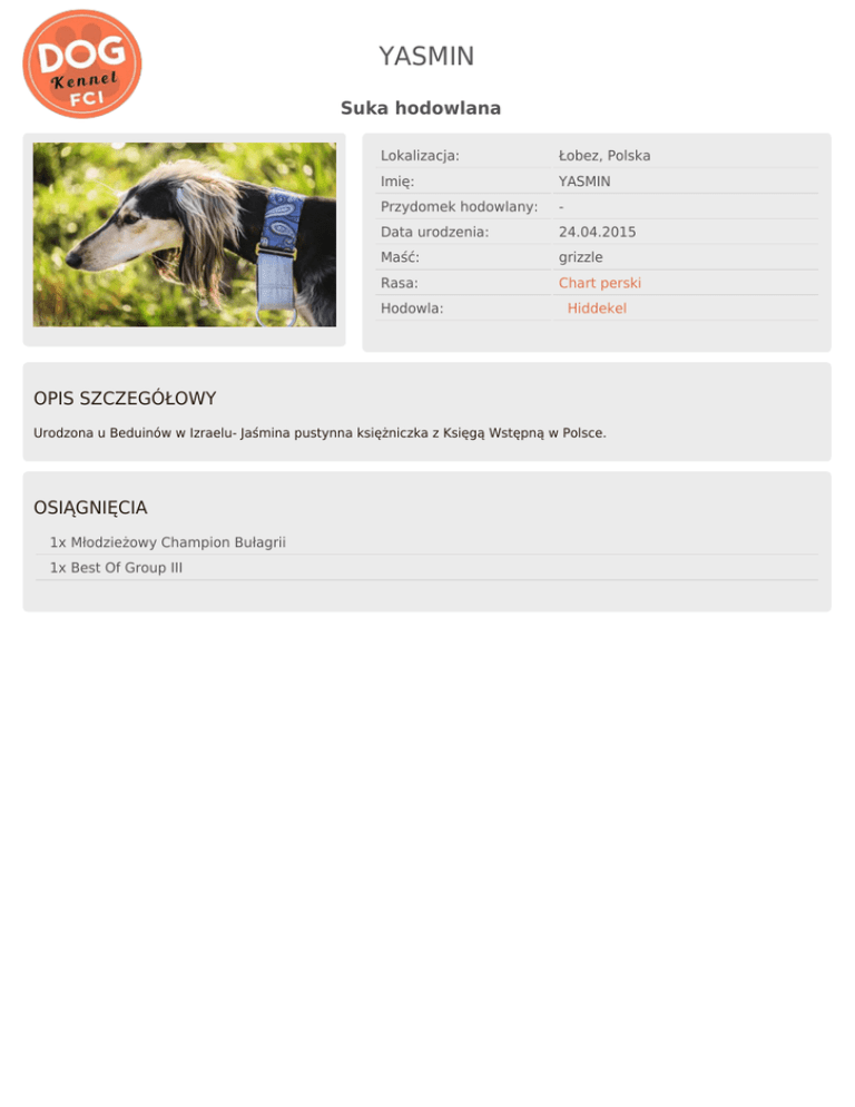 YASMIN Suka hodowlana Lokalizacja: Łobez, Polska Imię: YASMIN Przydomek hodowlany: - Data urodzenia: 24.04.2015 Maść: grizzle Rasa: Chart perski Hodowla: Hiddekel OPIS SZCZEGÓŁOWY Urodzona u Beduinów w Izraelu- Jaśmina pustynna księżniczka z Księgą Wstępną w Polsce. OSIĄGNIĘCIA 1x Młodzieżowy Champion Bułagrii 1x Best Of Group III