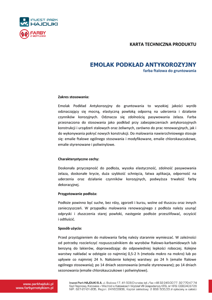 KARTA TECHNICZNA PRODUKTU EMOLAK PODKŁAD ANTYKOROZYJNY farba ftalowa do gruntowania Zakres stosowania: Emolak Podkład Antykorozyjny do gruntowania to wysokiej jakości wyrób odznaczający się mocną, elastyczną powłoką odporną na uderzenia i działanie czynników korozyjnych. Odznacza się zdolnością pasywowania żelaza. Farba przeznaczona do stosowania jako podkład przy zabezpieczeniach antykorozyjnych konstrukcji i urządzeń stalowych oraz żeliwnych, zarówno do prac renowacyjnych, jak i do wykonywania pokryć nowych konstrukcji. Do malowania nawierzchniowego stosuje się: emalie ftalowe ogólnego stosowania i modyfikowane, emalie chlorokauczukowe, emalie styrenowane i poliwinylowe. Charakterystyczne cechy: Doskonała przyczepność do podłoża, wysoka elastyczność, zdolność pasywowania żelaza, doskonałe krycie, duża szybkość schnięcia, łatwa aplikacja, odporność na uderzenia oraz działanie czynników korozyjnych, podwyższa trwałość farby dekoracyjnej. Przygotowanie podłoża: Podłoże powinno być suche, bez rdzy, zgorzeli i kurzu, wolne od tłuszczu oraz innych zanieczyszczeń. W przypadku malowania renowacyjnego z podłoża należy usunąć odpryski i złuszczenia starej powłoki, następnie podłoże przeszlifować, oczyścić i odtłuścić. Sposób użycia: Przed przystąpieniem do malowania farbę należy starannie wymieszać. W zależności od potrzeby rozcieńczyć rozpuszczalnikiem do wyrobów ftalowo-karbamidowych lub benzyną do lakierów, doprowadzając do odpowiedniej lepkości roboczej. Kolejne warstwy nakładać w odstępie co najmniej 0,5-2 h (metoda mokro na mokro) lub po upływie co najmniej 24 h. Nałożenie kolejnej warstwy: po 24 h (emalie ftalowe ogólnego stosowania); po 14 dniach sezonowania (emalie styrenowane); po 14 dniach sezonowania (emalie chlorokauczukowe i poliwinylowe). METODY I PARAMETRY NAKŁADANIA Dodatek rozcieńcz. [%] Lepkość (4 mm) [s] Średnica dyszy [mm] Ciśnienie MPa Zalecana ilość warstw 0÷5 Postać handlowa - - 1÷2 Natrysk pneumatyczny max 20 25÷35 1,5÷2 0,3÷0,5 1÷2 Natrysk hydrodynamiczny max 5 Postać handlowa 0,26÷0,48 12÷22 1÷2 Pędzel, wałek Parametry techniczne: Zalecana ilość warstw: Temperatura zapłonu: Okres gwarancji: 6-8 m2/l min. 70% max. 480 g/l (Dyrektywa z 2004/42/WE) pędzel, wałek malarski, natrysk pneumatyczny I stopień (suchość dotykowa) – 2 h; II stopień (całkowite) – 5 h 1-2 pow. 230C 12 miesięcy Ciężar właściwy: Lepkość: Norma: najwyżej 1,5 g/cm3 umowna mierzona kubkiem Forda Φ4 – 80-120 s PN-C-81901 Wydajność: Zawartość substancji stałych: Limit zawartości LZO: Sposób nanoszenia: Czas schnięcia: Wskazówki BHP i przeciwpożarowe: Surowce wchodzące w skład farby są palne i szkodliwe w przypadku wdychania, kontaktu ze skórą i spożycia. Przechowywać w zamknięciu i poza zasięgiem dzieci. Prace malarskie prowadzić przy dobrze działającej wentylacji, z dala od otwartego ognia. Produkt zawiera benzynę.