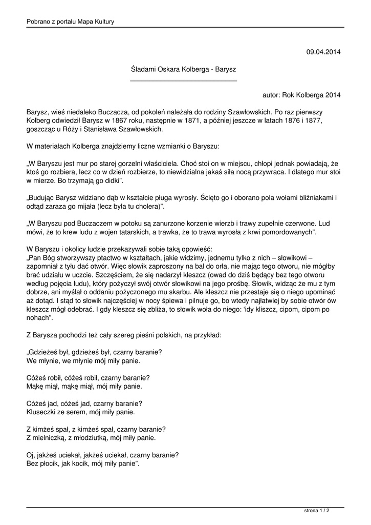 Pobrano z portalu Mapa Kultury 09.04.2014 Śladami Oskara Kolberga - Barysz ____________________________ autor: Rok Kolberga 2014 Barysz, wieś niedaleko Buczacza, od pokoleń należała do rodziny Szawłowskich. Po raz pierwszy Kolberg odwiedził Barysz w 1867 roku, następnie w 1871, a później jeszcze w latach 1876 i 1877, goszcząc u Róży i Stanisława Szawłowskich. W materiałach Kolberga znajdziemy liczne wzmianki o Baryszu: „W Baryszu jest mur po starej gorzelni właściciela. Choć stoi on w miejscu, chłopi jednak powiadają, że ktoś go rozbiera, lecz co w dzień rozbierze, to niewidzialna jakaś siła nocą przywraca. I dlatego mur stoi w mierze. Bo trzymają go didki”. „Budując Barysz widziano dąb w kształcie pługa wyrosły. Ścięto go i oborano pola wołami bliźniakami i odtąd zaraza go mijała (lecz była tu cholera)”. „W Baryszu pod Buczaczem w potoku są zanurzone korzenie wierzb i trawy zupełnie czerwone. Lud mówi, że to krew ludu z wojen tatarskich, a trawka, że to trawa wyrosła z krwi pomordowanych”. W Baryszu i okolicy ludzie przekazywali sobie taką opowieść: „Pan Bóg stworzywszy ptactwo w kształtach, jakie widzimy, jednemu tylko z nich – słowikowi – zapomniał z tyłu dać otwór. Więc słowik zaproszony na bal do orła, nie mając tego otworu, nie mógłby brać udziału w uczcie. Szczęściem, że się nadarzył kleszcz (owad do dziś będący bez tego otworu według pojęcia ludu), który pożyczył swój otwór słowikowi na jego prośbę. Słowik, widząc że mu z tym dobrze, ani myślał o oddaniu pożyczonego mu skarbu. Ale kleszcz nie przestaje się o niego upominać aż dotąd. I stąd to słowik najczęściej w nocy śpiewa i pilnuje go, bo wtedy najłatwiej by sobie otwór ów kleszcz mógł odebrać. I gdy kleszcz się zbliża, to słowik woła do niego: ‘idy kliszcz, cipom, cipom po nohach”. Z Barysza pochodzi też cały szereg pieśni polskich, na przykład: „Gdzieżeś był, gdzieżeś był, czarny baranie? We młynie, we młynie mój miły panie. Cóżeś robił, cóżeś robił, czarny baranie? Mąkę miął, mąkę miął, mój miły panie. Cóżeś jad, cóżeś jad, czarny baranie? Kluseczki ze serem, mój miły panie. Z kimżeś spał, z kimżeś spał, czarny baranie? Z mielniczką, z młodziutką, mój miły panie. Oj, jakżeś uciekał, jakżeś uciekał, czarny baranie? Bez płocik, jak kocik, mój miły panie”. strona 1 / 2 Pobrano z portalu Mapa Kultury I ukraińskich, jak ta śpiewana na chrzcinach: „Oj, ne żałuj, moja myła, szczo ja pju, tohdy budesz żałówaty, jak ja wmru. Tohdy budesz żałowaty, płakaty, jak ja budu na ławonci leżaty. Oj, wstań myły, oj wstań myły, wstań serce, stojit tobi w hołowońkach mid, weńce. Oj, naj stojit, oj naj stojit, pyjże ho sama, kolyś meni żałowała za żywota”. Opracowane przez autorów "Przewodnika śladami Oskara Kolberga po Polsce", przygotowanego przez Instytut Oskara Kolberga, Narodowy Instytut Fryderyka Chopina i Instytut Muzyki i Tańca. strona 2 / 2
