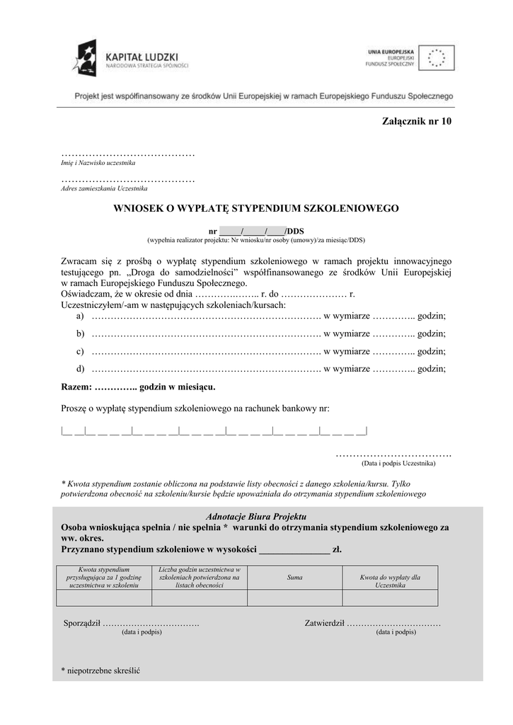 Załącznik nr 10 ………………………………… Imię i Nazwisko uczestnika ………………………………… Adres zamieszkania Uczestnika WNIOSEK O WYPŁATĘ STYPENDIUM SZKOLENIOWEGO nr _____/_____/____/DDS (wypełnia realizator projektu: Nr wniosku/nr osoby (umowy)/za miesiąc/DDS) Zwracam się z prośbą o wypłatę stypendium szkoleniowego w ramach projektu innowacyjnego testującego pn. „Droga do samodzielności” współfinansowanego ze środków Unii Europejskiej w ramach Europejskiego Funduszu Społecznego. Oświadczam, że w okresie od dnia ………….…….. r. do ………………… r. Uczestniczyłem/-am w następujących szkoleniach/kursach: a) ………………………………………………………………. w wymiarze ………….. godzin; b) ………………………………………………………………. w wymiarze ………….. godzin; c) ………………………………………………………………. w wymiarze ………….. godzin; d) ………………………………………………………………. w wymiarze ………….. godzin; Razem: ………….. godzin w miesiącu. Proszę o wypłatę stypendium szkoleniowego na rachunek bankowy nr: |__ __|__ __ __ __|__ __ __ __|__ __ __ __|__ __ __ __|__ __ __ __|__ __ __ __| ……………………………. (Data i podpis Uczestnika) * Kwota stypendium zostanie obliczona na podstawie listy obecności z danego szkolenia/kursu. Tylko potwierdzona obecność na szkoleniu/kursie będzie upoważniała do otrzymania stypendium szkoleniowego Adnotacje Biura Projektu Osoba wnioskująca spełnia / nie spełnia * warunki do otrzymania stypendium szkoleniowego za ww. okres. Przyznano stypendium szkoleniowe w wysokości _______________ zł. Kwota stypendium przysługująca za 1 godzinę uczestnictwa w szkoleniu Liczba godzin uczestnictwa w szkoleniach potwierdzona na listach obecności Sporządził ……………………………. (data i podpis) * niepotrzebne skreślić Suma Kwota do wypłaty dla Uczestnika Zatwierdził …………………………… (data i podpis)
