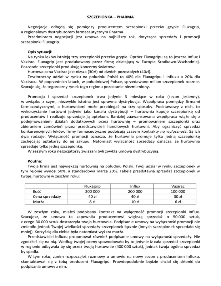 SZCZEPIONKA – PHARMA Negocjacje odbędą się pomiędzy producentem szczepionki przeciw grypie Fluxagrip, a regionalnym dystrybutorem farmaceutycznym Pharma. Przedmiotem negocjacji jest umowa na najbliższy rok, dotycząca sprzedaży i promocji szczepionki Fluxagrip. Opis sytuacji: Na rynku leków istnieją trzy szczepionki przeciw grypie. Oprócz Fluxagripu są to jeszcze Influx i Vaxirac. Fluxagrip jest produkowany przez firmę działającą w Europie Środkowo-Wschodniej. Pozostałe szczepionki produkują koncerny światowe. Hurtowa cena Vaxirac jest niższa (30zł) od dwóch pozostałych (40zł). Zeszłoroczny udział w rynku na południu Polski to 40% dla Fluxagripu i Influxu a 20% dla Vaxiracu. W poprzednich latach, w południowej Polsce, sprzedawano milion szczepionek rocznie. Szacuje się, że tegoroczny rynek tego regionu pozostanie niezmieniony. Promocja i sprzedaż szczepionek trwa jedynie 3 miesiące w roku (sezon jesienny), w związku z czym, niezwykle istotna jest sprawna dystrybucja. Współpraca pomiędzy firmami farmaceutycznymi, a hurtowniami może przebiegać na trzy sposoby. Podstawowy z nich, to wykorzystanie hurtowni jedynie jako kanału dystrybucji – hurtownia kupuje szczepionkę od producentów i realizuje sprzedaje ją aptekom. Bardziej zaawansowana współpraca wiąże się z podejmowaniem działań dodatkowych przez hurtownię – promowaniem szczepionki oraz zbieraniem zamówień przez przedstawicieli handlowych hurtowni. Aby ograniczyć sprzedaż konkurencyjnych leków, firmy farmaceutyczne podpisują czasem kontrakty na wyłączność. Są ich dwa rodzaje. Wyłączność promocji oznacza, że hurtownia promuje tylko jedną szczepionkę zachęcając aptekarzy do jej zakupu. Natomiast wyłączność sprzedaży oznacza, że hurtownia sprzedaje tylko jedną szczepionkę. W zeszłym roku negocjatorzy związani byli zwykłą umową dystrybucyjną. Poufne: Twoja firma jest największą hurtownią na południu Polski. Twój udział w rynku szczepionek w tym rejonie wynosi 50%, a standardowa marża 20%. Tabela przedstawia sprzedaż szczepionek w twojej hurtowni w zeszłym roku: Ilość Cena sprzedaży Marża Fluxagrip 200 000 40 zł 8 zł Influx 200 000 40 zł 10 zł Vaxirac 100 000 30 zł 6 zł W zeszłym roku, miałeś podpisany kontrakt na wyłączność promocji szczepionki Influx. Szacujesz, że umowa ta zapewniła producentowi większą sprzedaż o 50 000 sztuk, z czego 30 000 sztuk dostarczyła twoja hurtownia. Podpisanie umowy na wyłączność promocji nie zmieniło jednak Twojej wielkości sprzedaży szczepionek łącznie (innych szczepionek sprzedało się mniej). Korzyścią dla ciebie była natomiast wyższa marża. Przedstawiciel Influxu proponował również podpisanie umowy na wyłączność sprzedaży. Nie zgodziłeś się na nią. Według twojej oceny spowodowało by to jedynie iż cała sprzedaż szczepionki w regionie odbywała by się przez twoją hurtownie (400 000 sztuk), jednak twoja ogólna sprzedaż by spadła. W tym roku, zanim rozpocząłeś rozmowy o umowie na nowy sezon z producentem Influxu, skontaktował się z tobą producent Fluxagripu. Prawdopodobnie będzie chciał cię skłonić do podpisania umowy z nim.