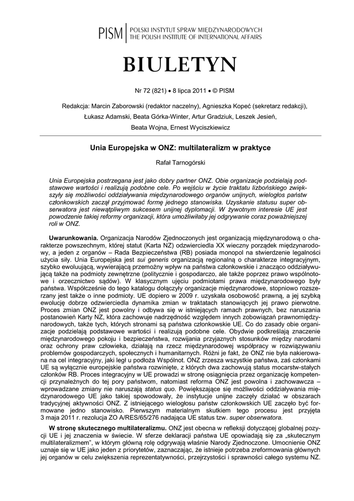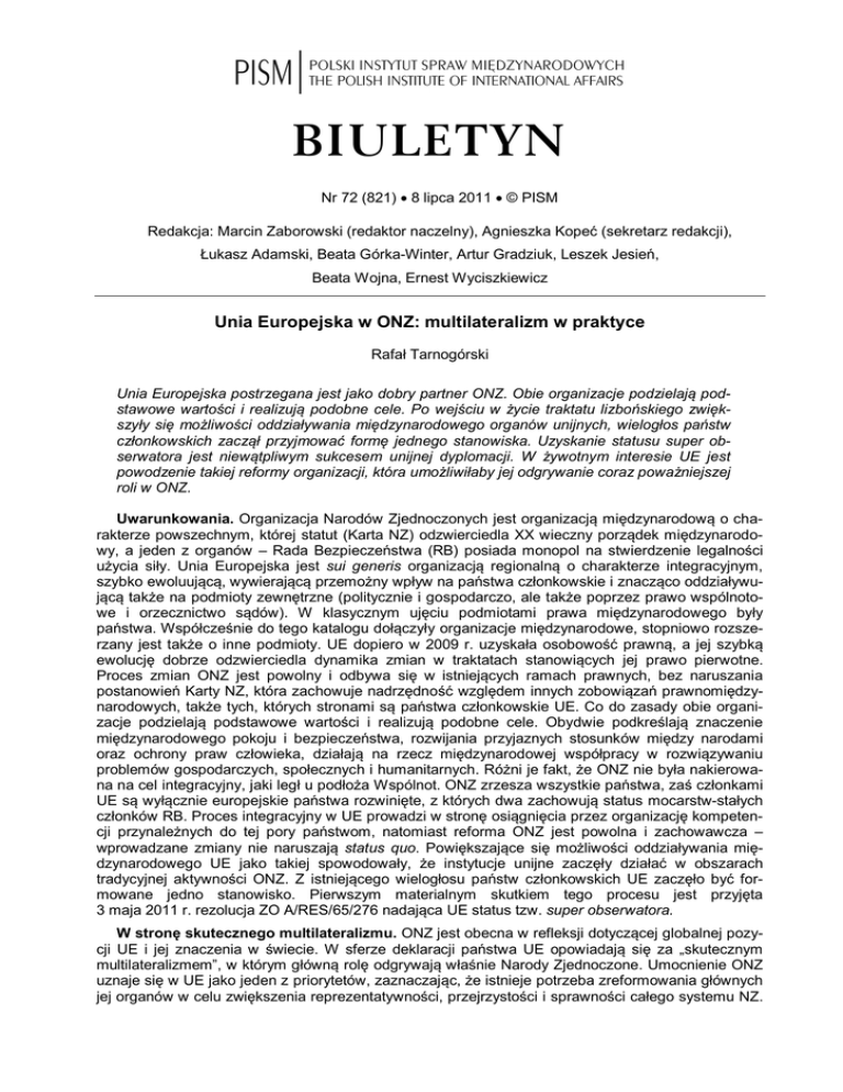 BIULETYN Nr 72 (821) 8 lipca 2011 © PISM Redakcja: Marcin Zaborowski (redaktor naczelny), Agnieszka Kopeć (sekretarz redakcji), Łukasz Adamski, Beata Górka-Winter, Artur Gradziuk, Leszek Jesień, Beata Wojna, Ernest Wyciszkiewicz Unia Europejska w ONZ: multilateralizm w praktyce Rafał Tarnogórski Unia Europejska postrzegana jest jako dobry partner ONZ. Obie organizacje podzielają podstawowe wartości i realizują podobne cele. Po wejściu w życie traktatu lizbońskiego zwiększyły się możliwości oddziaływania międzynarodowego organów unijnych, wielogłos państw członkowskich zaczął przyjmować formę jednego stanowiska. Uzyskanie statusu super obserwatora jest niewątpliwym sukcesem unijnej dyplomacji. W żywotnym interesie UE jest powodzenie takiej reformy organizacji, która umożliwiłaby jej odgrywanie coraz poważniejszej roli w ONZ. Uwarunkowania. Organizacja Narodów Zjednoczonych jest organizacją międzynarodową o charakterze powszechnym, której statut (Karta NZ) odzwierciedla XX wieczny porządek międzynarodowy, a jeden z organów – Rada Bezpieczeństwa (RB) posiada monopol na stwierdzenie legalności użycia siły. Unia Europejska jest sui generis organizacją regionalną o charakterze integracyjnym, szybko ewoluującą, wywierającą przemożny wpływ na państwa członkowskie i znacząco oddziaływującą także na podmioty zewnętrzne (politycznie i gospodarczo, ale także poprzez prawo wspólnotowe i orzecznictwo sądów). W klasycznym ujęciu podmiotami prawa międzynarodowego były państwa. Współcześnie do tego katalogu dołączyły organizacje międzynarodowe, stopniowo rozszerzany jest także o inne podmioty. UE dopiero w 2009 r. uzyskała osobowość prawną, a jej szybką ewolucję dobrze odzwierciedla dynamika zmian w traktatach stanowiących jej prawo pierwotne. Proces zmian ONZ jest powolny i odbywa się w istniejących ramach prawnych, bez naruszania postanowień Karty NZ, która zachowuje nadrzędność względem innych zobowiązań prawnomiędzynarodowych, także tych, których stronami są państwa członkowskie UE. Co do zasady obie organizacje podzielają podstawowe wartości i realizują podobne cele. Obydwie podkreślają znaczenie międzynarodowego pokoju i bezpieczeństwa, rozwijania przyjaznych stosunków między narodami oraz ochrony praw człowieka, działają na rzecz międzynarodowej współpracy w rozwiązywaniu problemów gospodarczych, społecznych i humanitarnych. Różni je fakt, że ONZ nie była nakierowana na cel integracyjny, jaki legł u podłoża Wspólnot. ONZ zrzesza wszystkie państwa, zaś członkami UE są wyłącznie europejskie państwa rozwinięte, z których dwa zachowują status mocarstw-stałych członków RB. Proces integracyjny w UE prowadzi w stronę osiągnięcia przez organizację kompetencji przynależnych do tej pory państwom, natomiast reforma ONZ jest powolna i zachowawcza – wprowadzane zmiany nie naruszają status quo. Powiększające się możliwości oddziaływania międzynarodowego UE jako takiej spowodowały, że instytucje unijne zaczęły działać w obszarach tradycyjnej aktywności ONZ. Z istniejącego wielogłosu państw członkowskich UE zaczęło być formowane jedno stanowisko. Pierwszym materialnym skutkiem tego procesu jest przyjęta 3 maja 2011 r. rezolucja ZO A/RES/65/276 nadająca UE status tzw. super obserwatora. W stronę skutecznego multilateralizmu. ONZ jest obecna w refleksji dotyczącej globalnej pozycji UE i jej znaczenia w świecie. W sferze deklaracji państwa UE opowiadają się za „skutecznym multilateralizmem”, w którym główną rolę odgrywają właśnie Narody Zjednoczone. Umocnienie ONZ uznaje się w UE jako jeden z priorytetów, zaznaczając, że istnieje potrzeba zreformowania głównych jej organów w celu zwiększenia reprezentatywności, przejrzystości i sprawności całego systemu NZ. 2489 Polski Instytut Spraw Międzynarodowych W kwestiach dotyczących zapewnienia pokoju i bezpieczeństwa pożądane jest powiększenie potencjału operacyjnego ONZ. UE opowiada się za wprowadzeniem jednolitej ONZ-owskiej praktyki, dzięki której można by zsynchronizować misje utrzymywania pokoju ONZ z operacjami UE. Przed traktatem lizbońskim UE reprezentowana była przez państwa sprawujące prezydencję oraz Komisję Europejską. Po jego wejściu w życie funkcje reprezentacyjne pełni przedstawicielstwo UE przy ONZ, sprawujące je w imieniu wysokiego przedstawiciela UE do spraw zagranicznych i polityki bezpieczeństwa. Do niedawna UE posiadała odziedziczony po EWG status stałego obserwatora przy ONZ (rezolucja ZO 3208(XXIX) z 1974 r., status analogiczny do Stolicy Apostolskiej czy Palestyny), który pozwalał na bierne uczestnictwo w pracach organizacji. Sytuacja uległa zmianie po wspomnianej rezolucji z 3 maja br., która jest efektem blisko 2-letnich starań unijnej dyplomacji. Unia Europejska zyskała prawo prezentacji wspólnego stanowiska podczas obrad ZO. Przedstawicielstwo UE będzie otrzymywać zaproszenia do udziału w debacie generalnej ZO, może zgłaszać propozycje we własnym imieniu, ma także możliwość udzielania odpowiedzi na zapytania dotyczące stanowiska państw członkowskich. Nie ma natomiast prawa głosu, nie może we własnym imieniu zgłaszać i popierać kandydatów, a także zaskarżać decyzji przewodniczącego ZO – te uprawnienia przynależą wyłącznie do państw jako pełnoprawnych członków ONZ. Zgodnie z postanowieniami traktatu lizbońskiego koordynację prac na forum ONZ zapewnia wysoki przedstawiciel do spraw zagranicznych i polityki bezpieczeństwa. Jeżeli w organizacjach lub podczas konferencji nie ma reprezentacji wszystkich państw członkowskich, państwa uczestniczące zobowiązane są do podtrzymania stanowiska Unii. Powinny one poinformować pozostałych członków i wysokiego przedstawiciela o sprawach będących przedmiotem wspólnego zainteresowania. Dotyczy to także państw członkowskich zasia