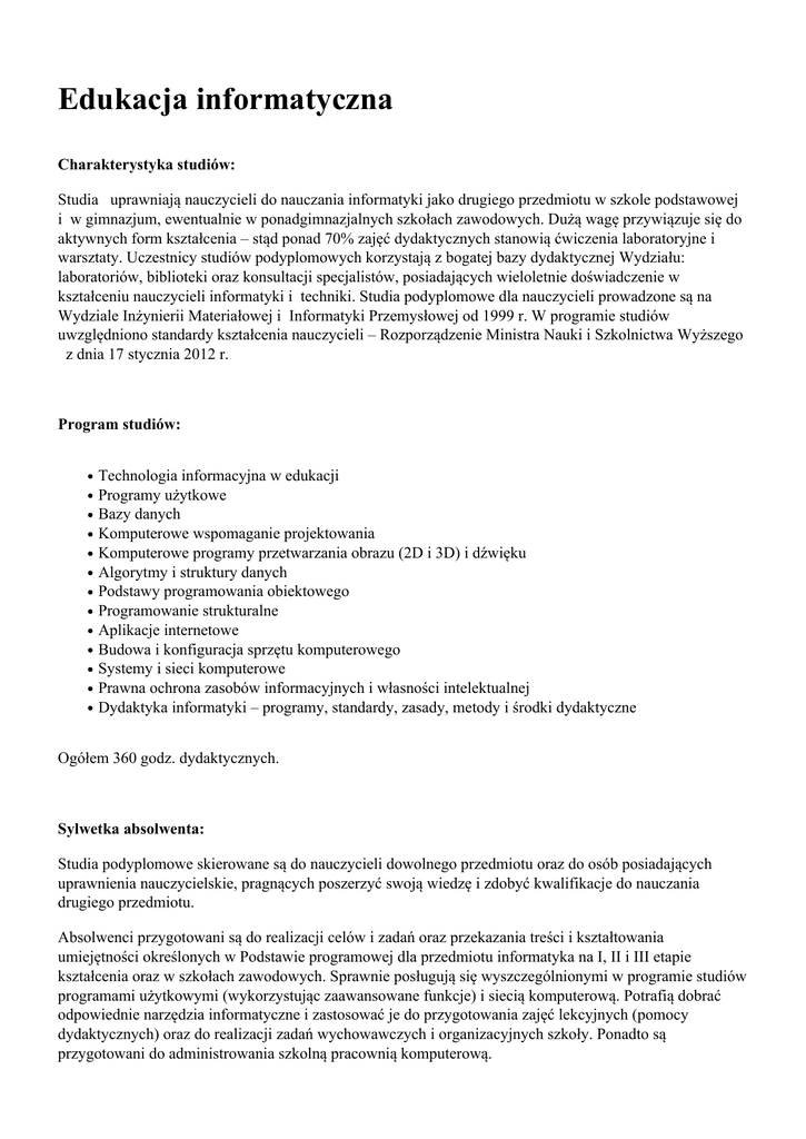 Edukacja informatyczna Charakterystyka studiów: Studia uprawniają nauczycieli do nauczania informatyki jako drugiego przedmiotu w szkole podstawowej i w gimnazjum, ewentualnie w ponadgimnazjalnych szkołach zawodowych. Dużą wagę przywiązuje się do aktywnych form kształcenia – stąd ponad 70% zajęć dydaktycznych stanowią ćwiczenia laboratoryjne i warsztaty. Uczestnicy studiów podyplomowych korzystają z bogatej bazy dydaktycznej Wydziału: laboratoriów, biblioteki oraz konsultacji specjalistów, posiadających wieloletnie doświadczenie w kształceniu nauczycieli informatyki i techniki. Studia podyplomowe dla nauczycieli prowadzone są na Wydziale Inżynierii Materiałowej i Informatyki Przemysłowej od 1999 r. W programie studiów uwzględniono standardy kształcenia nauczycieli – Rozporządzenie Ministra Nauki i Szkolnictwa Wyższego z dnia 17 stycznia 2012 r. Program studiów: Technologia informacyjna w edukacji Programy użytkowe Bazy danych Komputerowe wspomaganie projektowania Komputerowe programy przetwarzania obrazu (2D i 3D) i dźwięku Algorytmy i struktury danych Podstawy programowania obiektowego Programowanie strukturalne Aplikacje internetowe Budowa i konfiguracja sprzętu komputerowego Systemy i sieci komputerowe Prawna ochrona zasobów informacyjnych i własności intelektualnej Dydaktyka informatyki – programy, standardy, zasady, metody i środki dydaktyczne Ogółem 360 godz. dydaktycznych. Sylwetka absolwenta: Studia podyplomowe skierowane są do nauczycieli dowolnego przedmiotu oraz do osób posiadających uprawnienia nauczycielskie, pragnących poszerzyć swoją wiedzę i zdobyć kwalifikacje do nauczania drugiego przedmiotu. Absolwenci przygotowani są do realizacji celów i zadań oraz przekazania treści i kształtowania umiejętności określonych w Podstawie programowej dla przedmiotu informatyka na I, II i III etapie kształcenia oraz w szkołach zawodowych. Sprawnie posługują się wyszczególnionymi w programie studiów programami użytkowymi (wykorzystując zaawansowane funkcje) i siecią komputerową. Potrafią dobrać odpowiednie narzędzia informatyczne i zastosować je do przygotowania zajęć lekcyjnych (pomocy dydaktycznych) oraz do realizacji zadań wychowawczych i organizacyjnych szkoły. Ponadto są przygotowani do administrowania szkolną pracownią komputerową. Czas trwania: 3 semestry (od X 2014 r. do XI 2015 r.) Termin zgłoszeń: od 1 do 30 IX 2014 r. Wymagane dokumenty: odpis dyplomu ukończenia studiów wyższych, kwestionariusz osobowy, podanie. Tryb zgłoszeń: kolejność zgłoszeń Liczba miejsc: min. 20 osób Miejsce zgłoszeń: AGH, Wydział Inżynierii Metali i Informatyki Przemysłowej al. Mickiewicza 30, 30-059 Kraków pawilon B-5, pokój 3 Osoba przyjmująca zgłoszenia: Ewa Rywotycka (tel.: 12 617 25 50, [email protected]) Rejestracja elektroniczna: www.sp-is.agh.edu.pl Opłaty: 4 650 zł (3 raty po 1 550 zł) Informacje dodatkowe: Zajęcia na studiach prowadzone są w soboty (9.00–19.00) i niedziele (9.00–16.00) – średnio dwa razy w miesiącu. W semestrze III (dyplomowym) planowane są trzy zjazdy we wrześniu 2015 r. na programowe zajęcia dydaktyczne. Ponadto uczestnicy studiów przygotowujący pracę dyplomową mają możliwość korzystania z laboratoriów i pomocy opiekuna naukowego do końca października 2015 r. Organizator studiów podyplomowych: Wydział Inżynierii Metali i Informatyki Przemysłowej Adres organizatora: al. Mickiewicza 30, 30-059 Kraków pawilon B-5, pokój 407 tel.: 12 617 29 15, 617 25 50 fax: 12 617 20 92 e-mail: [email protected] www.sp-is.agh.edu.pl Kierownik: dr inż. Barbara Mrzygłód Osoba do kontaktu: dr inż. Barbara Mrzygłód tel. 12 617 29 15 e-mail: [email protected]