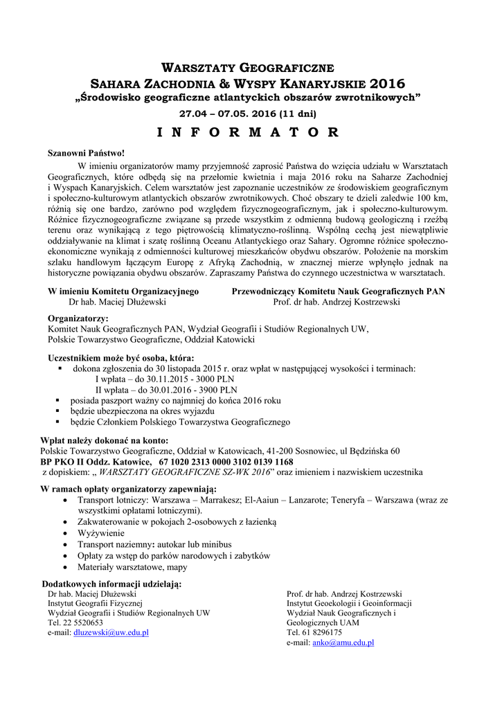 WARSZTATY GEOGRAFICZNE SAHARA ZACHODNIA & WYSPY KANARYJSKIE 2016 „Środowisko geograficzne atlantyckich obszarów zwrotnikowych” 27.04 – 07.05. 2016 (11 dni) I N F O R M A T O R Szanowni Państwo! W imieniu organizatorów mamy przyjemność zaprosić Państwa do wzięcia udziału w Warsztatach Geograficznych, które odbędą się na przełomie kwietnia i maja 2016 roku na Saharze Zachodniej i Wyspach Kanaryjskich. Celem warsztatów jest zapoznanie uczestników ze środowiskiem geograficznym i społeczno-kulturowym atlantyckich obszarów zwrotnikowych. Choć obszary te dzieli zaledwie 100 km, różnią się one bardzo, zarówno pod względem fizycznogeograficznym, jak i społeczno-kulturowym. Różnice fizycznogeograficzne związane są przede wszystkim z odmienną budową geologiczną i rzeźbą terenu oraz wynikającą z tego piętrowością klimatyczno-roślinną. Wspólną cechą jest niewątpliwie oddziaływanie na klimat i szatę roślinną Oceanu Atlantyckiego oraz Sahary. Ogromne różnice społecznoekonomiczne wynikają z odmienności kulturowej mieszkańców obydwu obszarów. Położenie na morskim szlaku handlowym łączącym Europę z Afryką Zachodnią, w znacznej mierze wpłynęło jednak na historyczne powiązania obydwu obszarów. Zapraszamy Państwa do czynnego uczestnictwa w warsztatach. W imieniu Komitetu Organizacyjnego Dr hab. Maciej Dłużewski Przewodniczący Komitetu Nauk Geograficznych PAN Prof. dr hab. Andrzej Kostrzewski Organizatorzy: Komitet Nauk Geograficznych PAN, Wydział Geografii i Studiów Regionalnych UW, Polskie Towarzystwo Geograficzne, Oddział Katowicki Uczestnikiem może być osoba, która:  dokona zgłoszenia do 30 listopada 2015 r. oraz wpłat w następującej wysokości i terminach: I wpłata – do 30.11.2015 - 3000 PLN II wpłata – do 30.01.2016 - 3900 PLN  posiada paszport ważny co najmniej do końca 2016 roku  będzie ubezpieczona na okres wyjazdu  będzie Członkiem Polskiego Towarzystwa Geograficznego Wpłat należy dokonać na konto: Polskie Towarzystwo Geograficzne, Oddział w Katowicach, 41-200 Sosnowiec, ul Będzińska 60 BP PKO II Oddz. Katowice, 67 1020 2313 0000 3102 0139 1168 z dopiskiem: „ WARSZTATY GEOGRAFICZNE SZ-WK 2016” oraz imieniem i nazwiskiem uczestnika W ramach opłaty organizatorzy zapewniają:  Transport lotniczy: Warszawa – Marrakesz; El-Aaiun – Lanzarote; Teneryfa – Warszawa (wraz ze wszystkimi opłatami lotniczymi).  Zakwaterowanie w pokojach 2-osobowych z łazienką  Wyżywienie  Transport naziemny: autokar lub minibus  Opłaty za wstęp do parków narodowych i zabytków  Materiały warsztatowe, mapy Dodatkowych informacji udzielają: Dr hab. Maciej Dłużewski Instytut Geografii Fizycznej Wydział Geografii i Studiów Regionalnych UW Tel. 22 5520653 e-mail: [email protected] Prof. dr hab. Andrzej Kostrzewski Instytut Geoekologii i Geoinformacji Wydział Nauk Geograficznych i Geologicznych UAM Tel. 61 8296175 e-mail: [email protected]
