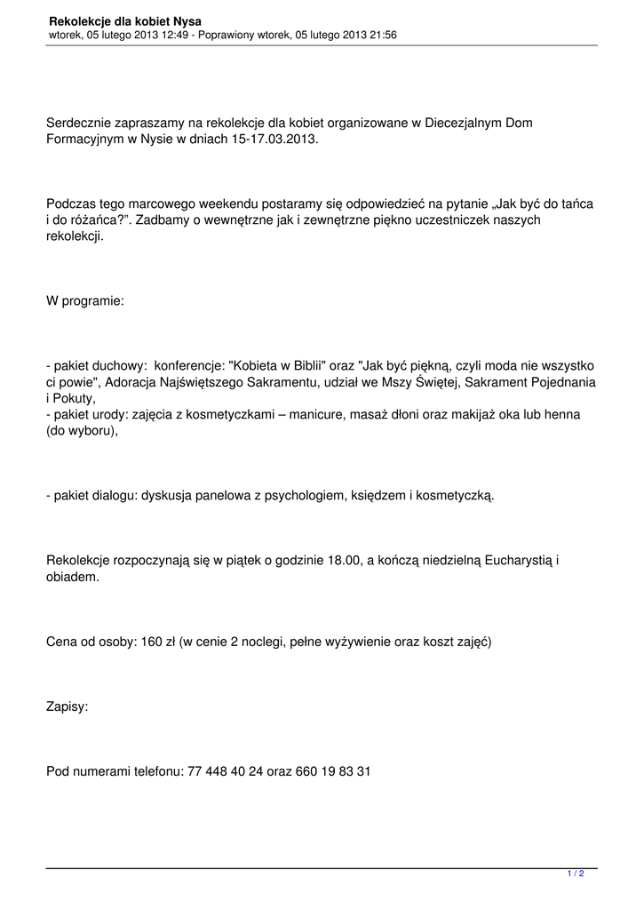 Rekolekcje dla kobiet Nysa wtorek, 05 lutego 2013 12:49 - Poprawiony wtorek, 05 lutego 2013 21:56 Serdecznie zapraszamy na rekolekcje dla kobiet organizowane w Diecezjalnym Dom Formacyjnym w Nysie w dniach 15-17.03.2013. Podczas tego marcowego weekendu postaramy się odpowiedzieć na pytanie „Jak być do tańca i do różańca?”. Zadbamy o wewnętrzne jak i zewnętrzne piękno uczestniczek naszych rekolekcji. W programie: - pakiet duchowy: konferencje: "Kobieta w Biblii" oraz "Jak być piękną, czyli moda nie wszystko ci powie", Adoracja Najświętszego Sakramentu, udział we Mszy Świętej, Sakrament Pojednania i Pokuty, - pakiet urody: zajęcia z kosmetyczkami – manicure, masaż dłoni oraz makijaż oka lub henna (do wyboru), - pakiet dialogu: dyskusja panelowa z psychologiem, księdzem i kosmetyczką. Rekolekcje rozpoczynają się w piątek o godzinie 18.00, a kończą niedzielną Eucharystią i obiadem. Cena od osoby: 160 zł (w cenie 2 noclegi, pełne wyżywienie oraz koszt zajęć) Zapisy: Pod numerami telefonu: 77 448 40 24 oraz 660 19 83 31 1/2 Rekolekcje dla kobiet Nysa wtorek, 05 lutego 2013 12:49 - Poprawiony wtorek, 05 lutego 2013 21:56 Wypełniając formularz zgłoszeniowy z dopiskiem „rekolekcje dla kobiet” na ww w.ddf.nysa.pl Uwaga! Ograniczona ilość miejsc! Decyduje kolejność zgłoszeń. - Kamagra generic uk Viagra effect use Viva viagra music Rush viagra child prostitution Generic viagra consultation Viagra 100mg uk Viagra should used How to store viagra 25mg viagra dosage Generic propecia reliable Buy levitra review Generic levitra tadalafil Viagra 50mg pakistan Viagra pills picture What was the original use of viagra 2/2