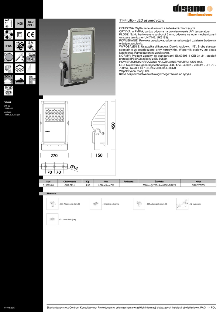 1144 Litio - LED asymetryczny OBUDOWA: Wytłaczane aluminium z żeberkami chłodzącymi. OPTYKA: w PMMA, bardzo odporna na promieniowanie UV i temperatury KLOSZ: Szkło hartowane o grubości 5 mm, odporne na udar mechaniczny i wstrząsy termiczne (UNI7142, UK3193). POWLEKANIE: Powłoka proszkowa, odporna na korozję i działanie środowisk o dużym zasoleniu. WYPOSAżENIE: Uszczelka silikonowa. Dławik kablowy, 1/2“. Śruby stalowe, specjalnie zabezpieczone anty-korozyjnie. Wspornik stalowy ze skalą kątomierza. Rama otwierana zawiasowo. NORMY: Produkt zgodny ze standardami EN60598-1 CEI 34-21, stopień protekcji IP65IK08 zgodny z EN 60529. POWIERZCHNIA NARAŻONA NA DZIAŁANIE WIATRU: 1200 cm2. LED: Najnowszej generacji technologia LED, 47w - 4000K - 7080lm - CRI 70 700mA, Ta-20 + 40 ° C Czas 50.000h L80B20 Współczynnik mocy: 0,9. Klasa bezpieczeństwa fotobiologicznego: Wolna od ryzyka. Pobierz DXF 2D - 1144n.dxf Montaggi - 1144_8_9_litio.pdf Kod Okablowanie Kg Wat 313369-00 CLD CELL 4,90 LED white 47W Podstawa Źarówka Kolor 7080lm @ 700mA-4000K -CRI 70 GRAFITOWY Akcesoria - 333 Attack pole diam.60 - 53 siatka ochronna - 334 Attack pole diam. 76 - 42 wysięgnik - 51 raster żaluzjowy 07/03/2017 Skontaktować się z Centrum Konsultacyjno- Projektowym w celu uzyskania wszelkich informacji dotyczących instalacji oświetleniowej. PAG 1 - POL