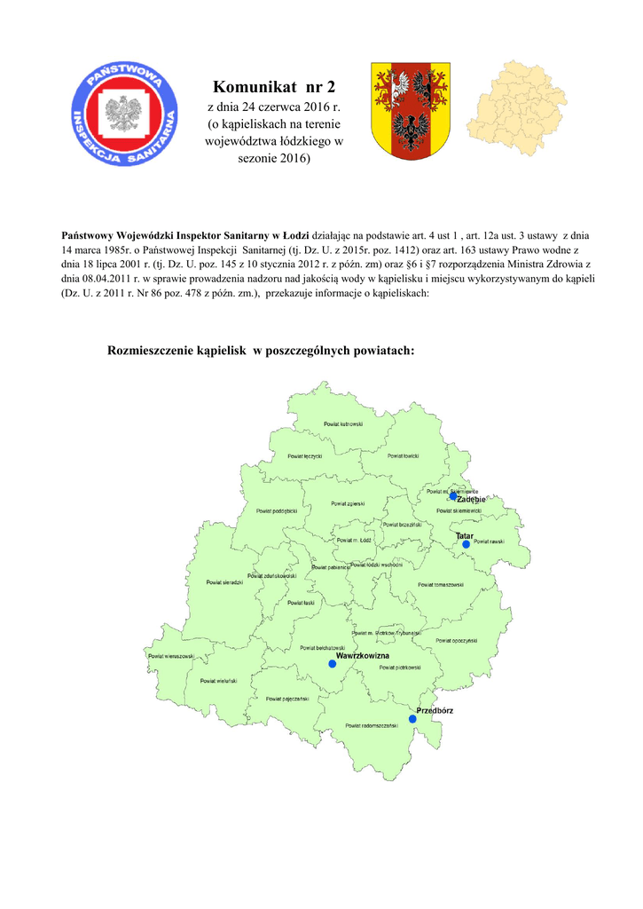 Komunikat nr 2 z dnia 24 czerwca 2016 r. (o kąpieliskach na terenie województwa łódzkiego w sezonie 2016) Państwowy Wojewódzki Inspektor Sanitarny w Łodzi działając na podstawie art. 4 ust 1 , art. 12a ust. 3 ustawy z dnia 14 marca 1985r. o Państwowej Inspekcji Sanitarnej (tj. Dz. U. z 2015r. poz. 1412) oraz art. 163 ustawy Prawo wodne z dnia 18 lipca 2001 r. (tj. Dz. U. poz. 145 z 10 stycznia 2012 r. z późn. zm) oraz §6 i §7 rozporządzenia Ministra Zdrowia z dnia 08.04.2011 r. w sprawie prowadzenia nadzoru nad jakością wody w kąpielisku i miejscu wykorzystywanym do kąpieli (Dz. U. z 2011 r. Nr 86 poz. 478 z późn. zm.), przekazuje informacje o kąpieliskach: Rozmieszczenie kąpielisk w poszczególnych powiatach: Znaczenie ikon używanych w tabelach Ocena kąpielisk w powiecie bełchatowskim przeprowadzana przez Państwowego Powiatowego Inspektora Sanitarnego w Bełchatowie tel. 44-7331355 e-mail [email protected] Sezon otwarty. Ocena kąpielisk w powiecie radomszczańskim przeprowadzana przez Państwowego Powiatowego Inspektora Sanitarnego w Radomsku tel. 44-6852350 e-mail [email protected] Lp Miejscowość Przed1. bórz Nazwa kąpieliska Adres Nazwa kąpierzeki liska ZbiorPrzedZbiornik nik na bórz ul. Strudze wodny w TuryPrzedborzu Strzeleck styczna iej Ocena przydatności wody Elementy infrastruktury kąpieliska Elementy bezpieczeństwa brak oceny jakości wody Sezon nie otwarty. Deklarowany przez organizatora termin otwarcia: 1.07.2016r. Ocena kąpielisk w powiecie rawskim przeprowadzana przez Państwowego Powiatowego Inspektora Sanitarnego w Rawie Mazowieckiej tel. 46-8144862 e-mail [email protected] Sezon otwarty. Ocena kąpielisk w powiecie skierniewickim przeprowadzana przez Państwowego Powiatowego Inspektora Sanitarnego w Skierniewicach tel. 46-8334600 e-mail [email protected] Sezon nie otwarty. Deklarowany przez organizatora termin otwarcia : 25.06.2016r. Ponadto Państwowy Wojewódzki Inspektor Sanitarny w Łodzi informuje: 1. Państwowy Wojewódzki Inspektor Sanitarny w Łodzi zastrzega sobie prawo zmiany podanych wyżej ustaleń w przypadku zmiany jakości wody w ocenianych akwenach. 2. Nie należy korzystać z kąpieli podczas zakwitu sinic, gdyż może spowodować to niekorzystne skutki zdrowotne. 3. Bieżąca informacja o przydatności wody do kąpieli w kąpieliskach woj. łódzkiego jest dostępna na stronie internetowej Wojewódzkiej Stacji Sanitarno-Epidemiologicznej w Łodzi www.pis.lodz.pl, a szczegółowe informacje znajdują się na stronach internetowych Powiatowych Stacji Sanitarno-Epidemiologicznych woj. łódzkiego. 4. Korzystanie z miejsc wykorzystywanych do kąpieli – informacje znajdują się na stronach internetowych terenowo właściwych państwowych powiatowych inspektorów sanitarnych woj. łódzkiego. 5. Terminy i warunki udostępnienia poszczególnych kąpielisk i miejsc wykorzystywanych do kąpieli dla ludności określają zarządcy.