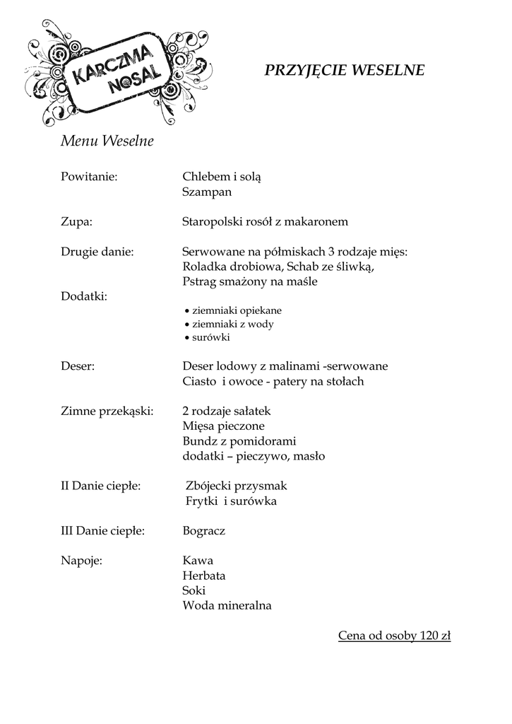 PRZYJĘCIE WESELNE Menu Weselne Powitanie: Chlebem i solą Szampan Zupa: Staropolski rosół z makaronem Drugie danie: Serwowane na półmiskach 3 rodzaje mięs: Roladka drobiowa, Schab ze śliwką, Pstrag smażony na maśle Dodatki:  ziemniaki opiekane  ziemniaki z wody  surówki Deser: Deser lodowy z malinami -serwowane Ciasto i owoce - patery na stołach Zimne przekąski: 2 rodzaje sałatek Mięsa pieczone Bundz z pomidorami dodatki – pieczywo, masło II Danie ciepłe: Zbójecki przysmak Frytki i surówka III Danie ciepłe: Bogracz Napoje: Kawa Herbata Soki Woda mineralna Cena od osoby 120 zł