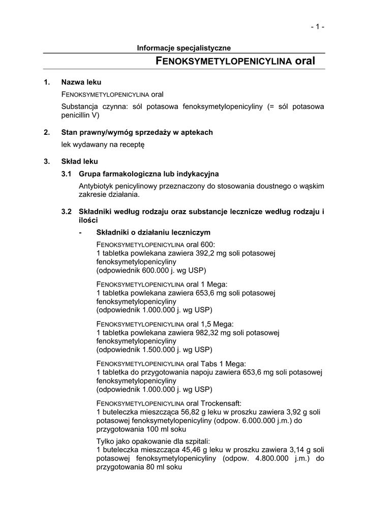 -1Informacje specjalistyczne FENOKSYMETYLOPENICYLINA oral 1. Nazwa leku FENOKSYMETYLOPENICYLINA oral Substancja czynna: sól potasowa fenoksymetylopenicyliny (= sól potasowa penicillin V) 2. Stan prawny/wymóg sprzedaży w aptekach lek wydawany na receptę 3. Skład leku 3.1 Grupa farmakologiczna lub indykacyjna Antybiotyk penicylinowy przeznaczony do stosowania doustnego o wąskim zakresie działania. 3.2 Składniki według rodzaju oraz substancje lecznicze według rodzaju i ilości - Składniki o działaniu leczniczym FENOKSYMETYLOPENICYLINA oral 600: 1 tabletka powlekana zawiera 392,2 mg soli potasowej fenoksymetylopenicyliny (odpowiednik 600.000 j. wg USP) FENOKSYMETYLOPENICYLINA oral 1 Mega: 1 tabletka powlekana zawiera 653,6 mg soli potasowej fenoksymetylopenicyliny (odpowiednik 1.000.000 j. wg USP) FENOKSYMETYLOPENICYLINA oral 1,5 Mega: 1 tabletka powlekana zawiera 982,32 mg soli potasowej fenoksymetylopenicyliny (odpowiednik 1.500.000 j. wg USP) FENOKSYMETYLOPENICYLINA oral Tabs 1 Mega: 1 tabletka do przygotowania napoju zawiera 653,6 mg soli potasowej fenoksymetylopenicyliny (odpowiednik 1.000.000 j. wg USP) FENOKSYMETYLOPENICYLINA oral Trockensaft: 1 buteleczka mieszcząca 56,82 g leku w proszku zawiera 3,92 g soli potasowej fenoksymetylopenicyliny (odpow. 6.000.000 j.m.) do przygotowania 100 ml soku Tylko jako opakowanie dla szpitali: 1 buteleczka mieszcząca 45,46 g leku w proszku zawiera 3,14 g soli potasowej fenoksymetylopenicyliny (odpow. 4.800.000 j.m.) do przygotowania 80 ml soku -21 łyżeczka miarowa (= 5 ml) gotowego soku zawiera 196 mg soli potasowej fenoksymetylopenicyliny (odpow. 300.000 j. wg USP.) - Pozostałe składniki Tabletki powlekane FENOKSYMETYLOPENICYLINA oral 600 : substancja zapachowa, węglan wapnia, celuloza mikrokrystaliczna, hipromelloza, laktoza, glikol polietylenowy 6000, stearynian magnezowy, skrobia kukurydziana, poliwidon, glikol propylenowy, sól sodowa sacharyny, krzemionka koloidalna, talk, tlenek tytanu(IV), E 171. Tabletki powlekane FENOKSYMETYLOPENICYLINA oral 1 Mega, Tabletki powlekane FENOKSYMETYLOPENICYLINA oral 1,5 Mega: substancja zapachowa, celuloza mikrokrystaliczna, tleneki i wodorotleneki żelaza, E 172, hipromelloza, laktoza, glikol polietylenowy 6000, stearynian magnezowy, skrobia kukurydziana, poliwidon, glikol propylenowy, sól sodowa sacharyny, krzemionka koloidalna, talk, tlenek tytanu(IV), E 171. FENOKSYMETYLOPENICYLINA oral Tabs 1 Mega: substancje zapachowe, celuloza mikrokrystaliczna, stearynian magnezowy, cyklaminian sodowy, (ester) kwasu poli(met)akrylowego, poliwidon, sól sodowa sacharyny, krzemionka koloidalna. FENOKSYMETYLOPENICYLINA oral Trockensaft: Substancje pomocnicze istotne farmakodynamicznie: 1 łyżeczka miarowa (= 5 ml) gotowego soku zawiera 2,6 g sacharozy (odpow. 0,22 jednostki chlebowej) Substancje pomocnicze nieistotne farmakodynamicznie: substancje zapachowe, kwas cytrynowy, aspartam, sodowy, chlorek sodowy 4. cytranian Wskazania Leczenie zakażeń lekkich do średnio ciężkich, wywołanych przez drobnoustroje wrażliwe na działanie fenoksymetylopenicyliny, takich jak: - infekcje uszu, nosa i gardła (nieżyt gardła, zapalenie migdałków, zapalenie zatok przynosowych, zapalenie ucha środkowego), - infekcje dróg oddechowych (zapalenie oskrzeli, odoskrzelowe zapalenie płuc, zapalenie płuc), - infekcje wywołane przez ß-hemolityczne paciorkowce grupy A, takie jak płonica, róża, profilaktyka przeciwnawrotowa gorączki reumatycznej, zakażenia skóry (ropne zapalenie skóry, czyraczność, ropowica), -3- profilaktyka zapalenia wsierdzia przy zabiegach obejmujących zęby, jamę ustną, szczęki oraz górny odcinek dróg oddechowych. W razie potrzeby możliwe jest stosowanie leku w połączeniu z dalszym przydatnym antybiotykiem. 5. Przeciwwskazania Ze względu na niebezpieczeństwo wystąpienia wstrząsu anafilaktycznego leku FENOKSYMETYLOPENICYLINA oral nie wolno stosować u pacjentów o potwierdzonej nadwrażliwości na penicylinę. Możliwe jest wystąpienie alergii krzyżowej z innymi antybiotykami ß-laktamowymi. U pacjentów wykazujących skłonność do reakcji uczuleniowych (np. katar sienny, astma oskrzelowa) obserwowane jest zwiększone ryzyko wystąpienia poważnych reakcji alergicznych, stąd też u takich pacjentów należy zachować szczególną ostrożność przy stosowaniu leku FENOKSYMETYLOPENICYLINA. U pacjentów z ciężkimi zaburzeniami żołądkowymi i jelitowymi, z wymiotami i biegunką należy zrezygnować z leczenia fenoksymetylopenicyliną, bowiem nie jest zapewnione dostateczne wchłanianie leku. (w takich przypadkach zalecana jest terapia drogą pozajelitową np. przy pomocy benzylopenicyliny lub innego odpowiedniego antybiotyku). Stosowanie u ciężarnych i u kobiet karmiących Obserwacje obejmujące ludzi nie przyniosły dotąd wskazówek świadczących o szkodliwym działaniu leku na organizm dziecka w łonie matki. Badania doświadczalne nie wykazały żadnego działania szkodliwego na płód. Ponieważ brak jest dotąd jakichkolwiek doniesień na temat szkodliwego działania fenoksymetylopenicyliny możliwe jest - przy istnieniu odpowiedniej indykacji - stosowanie antybiotyku FENOKSYMETYLOPENICYLINA oral w pełnym okresie cięży oraz w czasie karmienia noworodka piersią. Fenoksymetylopenicylina przenika do mleka matki. W przypadku karmienia niemowlęcia należy uwzględnić możliwość wpływu leku na fizjologiczną florę jelitową – ew. biegunki i rozwój drożdżaków. Wskazówka dotycząca dzieci: W przypadku fenyloketonurii (stanowiącej poważne zaburzenie przemiany materii) należy uwzględnić, że lek w postaci proszku do przygotowania soku FENOKSYMETYLOPENICYLINA oral Trockensaft zawiera syntetyczny środek słodzący Aspartam. 6. Działania uboczne Działanie na układ pokarmowy Zaburzenia żołądkowo-jelitowe stanowią ok. 5 – 10 % najczęstszych działań ubocznych w czasie terapii lekiem FENOKSYMETYLOPENICYLINA oral. Zaliczane są tutaj nu