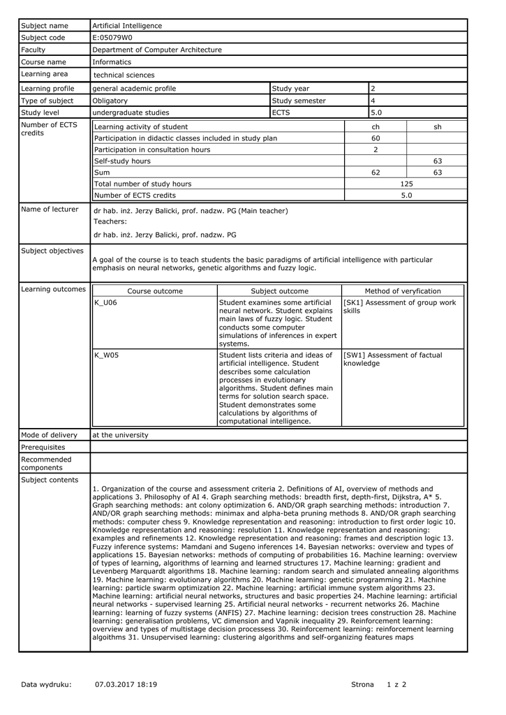 12.11.2016 06:14 Strona 1 z 2 Subject name Artificial Intelligence
