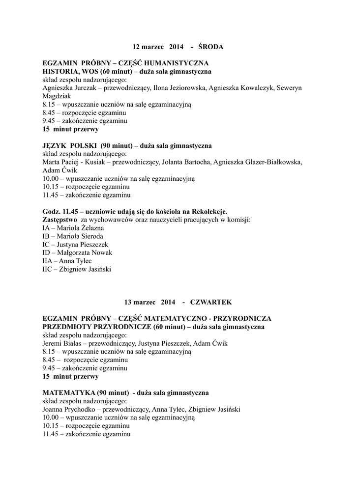 12 marzec 2014 - ŚRODA EGZAMIN PRÓBNY – CZĘŚĆ HUMANISTYCZNA HISTORIA, WOS (60 minut) – duża sala gimnastyczna skład zespołu nadzorującego: Agnieszka Jurczak – przewodniczący, Ilona Jeziorowska, Agnieszka Kowalczyk, Seweryn Magdziak 8.15 – wpuszczanie uczniów na salę egzaminacyjną 8.45 – rozpoczęcie egzaminu 9.45 – zakończenie egzaminu 15 minut przerwy JĘZYK POLSKI (90 minut) – duża sala gimnastyczna skład zespołu nadzorującego: Marta Paciej - Kusiak – przewodniczący, Jolanta Bartocha, Agnieszka Glazer-Białkowska, Adam Ćwik 10.00 – wpuszczanie uczniów na salę egzaminacyjną 10.15 – rozpoczęcie egzaminu 11.45 – zakończenie egzaminu Godz. 11.45 – uczniowie udają się do kościoła na Rekolekcje. Zastępstwo za wychowawców oraz nauczycieli pracujących w komisji: IA – Mariola Żelazna IB – Mariola Sieroda IC – Justyna Pieszczek ID – Małgorzata Nowak IIA – Anna Tylec IIC – Zbigniew Jasiński 13 marzec 2014 - CZWARTEK EGZAMIN PRÓBNY – CZĘŚĆ MATEMATYCZNO - PRZYRODNICZA PRZEDMIOTY PRZYRODNICZE (60 minut) – duża sala gimnastyczna skład zespołu nadzorującego: Jeremi Białas – przewodniczący, Justyna Pieszczek, Adam Ćwik 8.15 – wpuszczanie uczniów na salę egzaminacyjną 8.45 – rozpoczęcie egzaminu 9.45 – zakończenie egzaminu 15 minut przerwy MATEMATYKA (90 minut) - duża sala gimnastyczna skład zespołu nadzorującego: Joanna Prychodko – przewodniczący, Anna Tylec, Zbigniew Jasiński 10.00 – wpuszczanie uczniów na salę egzaminacyjną 10.15 – rozpoczęcie egzaminu 11.45 – zakończenie egzaminu Godz. 11.45 – uczniowie udają się do kościoła na Rekolekcje. Zastępstwo za wychowawców oraz nauczycieli pracujących w komisji: IB – Agnieszka Kowalczyk IC – Natasza Możdżeń IIB – Agnieszka Jurczak IIC – Małgorzata Nowak IIIA – Agnieszka Glazer - Białkowska 14 marzec 2014 - PIĄTEK EGZAMIN PRÓBNY – CZĘŚĆ JĘZYKOWA I część POZIOM PODSTAWOWY (60 minut) JĘZYK ANGIELSKI (PP) – duża sala gimnastyczna skład zespołu nadzorującego: Magdalena Łacińska – Ogórkiewicz – przewodniczący, Agnieszka Jurczak, Adam Ćwik 8.30 – wpuszczanie uczniów na salę egzaminacyjną 9.00 – rozpoczęcie egzaminu 10.00 – zakończenie egzaminu JĘZYK NIEMIECKI (PP) – sala nr 13 skład zespołu nadzorującego: Marta Archman – Orczykowska – przewodniczący, Justyna Pieszczek, Zbigniew Jasiński 8.30 – wpuszczanie uczniów na salę egzaminacyjną 9.00 – rozpoczęcie egzaminu 10.00 – zakończenie egzaminu 15 minut przerwy II część POZIOM ROZSZERZONY (60 minut) JĘZYK ANGIELSKI (PR) – duża sala gimnastyczna skład zespołu nadzorującego: Magdalena Łacińska – Ogórkiewicz – przewodniczący, Agnieszka Jurczak, Adam Ćwik 10.15 – wpuszczanie uczniów na salę egzaminacyjną 10.30 – rozpoczęcie egzaminu 11.30 – zakończenie egzaminu JĘZYK NIEMIECKI (PR) – sala nr 13 skład zespołu nadzorującego: Marta Archman – Orczykowska – przewodniczący, Justyna Pieszczek, Zbigniew Jasiński 10.15 – wpuszczanie uczniów na salę egzaminacyjną 10.30 – rozpoczęcie egzaminu 11.30 – zakończenie egzaminu Godz. 11.45 – uczniowie udają się do kościoła na Rekolekcje. Zastępstwo za wychowawców oraz nauczycieli pracujących w komisji: IC – Agnieszka Glazer – Białkowska IIC – Agnieszka Kowalczyk