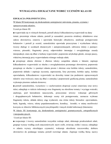 WYMAGANIA EDUKACYJNE WOBEC UCZNIÓW KLAS III EDUKACJA POLONISTYCZNA. W klasie III kontynuuje się doskonalenie umiejętności mówienia, pisania, czytania i opracowywania tekstów. Uczeń po klasie III: ■ wypowiada się w różnych formach, potrafi ułożyć kilkuzdaniową wypowiedź na dany temat; prezentuje własne zdanie, potrafi je uzasadnić; poszerza struktury składniowe oraz zakres słownictwa; omawia i opowiada historyjki obrazkowe, analizuje postępowanie bohaterów i potrafi je ocenić; samodzielnie opowiada przeczytane i wysłuchane teksty; tworzy dialogi w scenkach dramowych i autoprezentacjach; odtwarza teksty z pamięci: wiersze, piosenki, fragmenty prozy, odpowiednio intonując i uwzględniając zasady interpunkcji; stara się dbać o kulturę wypowiedzi: poprawnie artykułuje głoski, stosuje pauzy, właściwą intonację przy wypowiadaniu różnego rodzaju zdań; ■ przepisuje zdania złożone i dłuższe teksty; uzupełnia zdania z lukami; zapisuje kilkuzdaniowe wypowiedzi ze słuchu z uwzględnieniem poznanego słownictwa; poprawnie przepisuje ze słuchu i z pamięci zdania proste i złożone oraz krótkie teksty; samodzielnie, poprawnie układa i zapisuje życzenia, zaproszenia, listy prywatne, krótkie opisy, krótkie opowiadania, kilkuzdaniowe wypowiedzi na dowolny temat (na podstawie opracowanych tekstów oraz twórcze); stara się dbać o estetykę i poprawność graficzną pisma; samodzielnie wykonuje pisemne zadania domowe; ■ potrafi samodzielnie, wyraziście i z zachowaniem ekspresji czytać omawiany oraz nowy tekst; odnajduje w tekście informacje oraz fragmenty na określone tematy i wyciąga wnioski; analizuje, pod kierunkiem nauczyciela, przeczytane utwory: wskazuje głównych i drugoplanowych bohaterów, dokonuje oceny ich postępowania, zaznacza wybrane fragmenty tekstu, układa dalszy ciąg wydarzeń; zna różne teksty literackie: opowiadanie, baśń, legendę, wiersz, teksty popularnonaukowe, komiksy, kroniki; w miarę możliwości korzysta ze zbiorów bibliotecznych (encyklopedii) i innych źródeł informacji (Internetu). W klasie III kontynuuje się doskonalenie umiejętności gramatycznych, ortograficznych i interpunkcyjnych. Uczeń po klasie III: ■ rozpoznaje i tworzy samodzielnie wszystkie rodzaje zdań; dokonuje przekształceń zdań; grupuje wyrazy według cech znaczeniowych: nazw osób, zwierząt, roślin i rzeczy; odnajduje w zdaniu wyrazy określające czynności, wskazuje określenia rzeczownika; dobiera słownictwo do podanego tematu; potrafi rozwinąć zdanie. Zapisuje wielką literą: nazwy popularnych zabytków, niektóre tytuły książek i czasopism, zna zastosowanie przecinka, dwukropka przy wyliczaniu; dba o poprawność ortograficzną i interpunkcyjną podczas pisania ze słuchu oraz tekstów pisanych samodzielnie. EDUKACJA PRZYRODNICZO - SPOŁECZNA W klasie III kontynuuje się doskonalenie umiejętności przyrodniczych, społecznych. Uczeń po klasie III: ■ rozumie komunikaty pogodowe podawane w środkach masowego przekazu; wie, jakie spotyka się zagrożenia wynikające z działalności człowieka (palenie śmieci, wypalanie łąk, kłusownictwo, hałas); rozumie, na czym polegają zagrożenia ze strony przyrody (huragan, lawina, śnieżyca),wie, jak należy zachować się w takich sytuacjach; umie wskazać, rozróżnić i nazwać charakterystyczne cechy krajobrazów Polski; potrafi wyjaśnić jak funkcjonuje przyroda w różnych porach roku; umie opisać życie w ekosystemie pola, lasu i zbiorników wodnych (wymienia nazwy podstawowych zwierząt i roślin wodnych, nazywa różne zbiorniki wodne, zna warunki życia organizmów w danym środowisku); ■ uczestniczy aktywnie w życiu szkoły, zna jej tradycje; szanuje symbole narodowe, zna ważniejsze wydarzenia historyczne, potrafi wyliczyć nazwiska wybitnych Polaków oraz ich osiągnięcia; potrafi wskazać na mapie ważne miasta i miejsca Polski (góry, rzeki); zna swoją miejscowość, potrafi o niej opowiedzieć; EDUKACJA ARTYSTYCZNA; W klasie III kontynuuje się doskonalenie umiejętności plastycznych, technicznych, muzycznych. Uczeń po klasie III: ■ zna dyscypliny sztuki: fotografię, film, przekazy medialne, rzemiosło artystyczne; rozumie pojęcia: „scena rodzajowa”, „autoportret”, „sztuka nowoczesna”; umiejscawia i nazywa wybrane budowle Europy i świata; zapoznaje się z przeznaczeniem różnych urządzeń technicznych; zapoznaje się z budową roweru; potrafi korzystać ze środków komunikacji dostępnych w miejscu zamieszkania oraz wie, z jakich środków transportu korzystają ludzie ; ■ zna i śpiewa piosenki oraz kanony; realizuje rytmy poprzez rytmiczne recytowanie przysłów, gesty, ruchy i grę na instrumentach; rozpoznaje melodie, rytm, akompaniament; rozpoznaje i odróżnia głosy wokalne / sopran, bas/ oraz instrumenty; zna podstawy zapisu nutowego; potrafi zagrać na instrumentach proste schematy rytmu, melodii do akompaniamentu, improwizuje utwory muzyczne z zachowaniem odpowiedniej artykulacji; zna podstawy gry na wybranym instrumencie muzycznym. WYCHOWANIE FIZYCZNE W klasie III kontynuuje się doskonalenie umiejętności sportowych. Uczeń po klasie III: ■ realizuje marszobiegi trwające około 15 minut; wykonuje przewrót w przód; oburącz odbija lekką piłkę sposobem górnym; podbija piłkę stopą i kolanem; potrafi rzucić piłką lekarską; jeździ na rowerze przestrzegając zasad bezpieczeństwa; przestrzega zasad sportowej rywalizacji; dba o bezpieczeństwo w czasie zajęć ruchowych; EDUKACJA MATEMATYCZNA W klasie 3 kontynuuje się doskonalenie umiejętności matematycznych. Uczeń po klasie III: ■ odczytuje i zapisuje liczby od 0 do 1000; liczy w przód i w tył po jeden, po dziesięć i po sto w zakresie 1000; potrafi przyporządkować liczbę do konkretnych elementów w zbiorze; porównuje liczby w zakresie 1000, używając określeń: „większa”, „mniejsza”, „równa”, stosuje znaki: =, <, >; doda