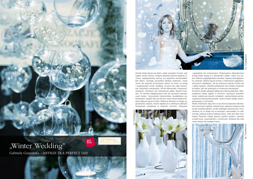 Zwykle śluby bierze się latem, kiedy wszystko kwitnie, jest ciepło, świeci słońce, możemy pokazać pięknie opalone ramiona, zaprezentować suknię, czy pojechać samochodem bez dachu. Szukając pomysłów bardziej szalonych, może warto też spojrzeć przychylnym okiem na zimę, na śnieg i zorganizować winter wedding. Ta pora roku daje niezwykłe możliwości aranżacyjne. Klimat elementów mrożonych, szklanych, śnieżnych czy malowanych gałęzi, białych kwiatów. To również najlepsza pora roku do używania nastrojowych świec i niezwykłych świeczników, kandelabrów czy lampionów. Szybko robi się ciemno, więc niemal każde przyjęcie odbywa się po zmroku. Można je chować w śniegu sygnalizować wejście, można zapalać je w szklanych pięknych lampionach, przebierać w kolorach, formach, miejscach „Winter Wedding” Gabriela Gasparska - ARTSIZE DLA PERFECT DAY i sposobach ich umieszczania. Proponujemy zdecydowanie kwiaty białe, łącząc je z elementem zieleni, czerni czy srebra. Pięknie wyglądają białe orchidee, tulipany, biała gipsówka, amarylis. Można łączyć kwiaty z malowanymi gałęziami, sztucznymi dodatkami, tak by stworzyć nastrój mroźny ale i ciepły zarazem. Właśnie połączenie tych dwóch skrajnych klimatów, jest tak atrakcyjne w zimowych aranżacjach. Do takich wesel najlepiej nadają się wnętrza pałacowe. Obowiązkowo należy zapalić w kominku, zaznaczyć światłem świec wejście po starych schodach, zaakcentować portyk, wreszcie wykorzystać konsole, nisze a nawet rzeźby, wkomponowując w nie kwiaty. Wiele możliwości dają nam w tej chwili producenci elementów sztucznych, gałązki, szklane kule, udawany śnieg czy lód są tak wysokiej jakości, że bez żadnego ocierania się o kicz, możemy to co dzieje się na zewnątrz wprowadzić na stół, tworząc własną śnieżno-lodową krainę. Jeśli jest taka możliwość Państwo młodzi powinni jechać saniami, owinięci w białe futra, z pochodniami i rumieńcami. Właśnie taki ślub może okazać się niezapomniany.