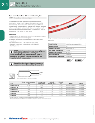 Izolacja 2.1 Rury i koszulki termokurczliwe Rura termokurczliwa 4:1 w odcinkach 1,2 m SA47 - standardowa ścianka, z klejem SA47 jest półsztywną rurą trudnopalną wykonaną z poliolefiny bez związków halogenowych i z grubą warstwą wewnętrzną kleju termotopliwego. Charakteryzuje się doskonałą wytrzymałością na rozciąganie oraz redukcją naprężeń. Warstwa kleju zapewnia doskonałą ochronę przed wilgocią. Jest idealna do stosowania w połączeniach elektrycznych i rozgałęzieniach przewodów w samochodach. Rura jest przezroczysta, a klej topliwy ma kolor czarny. Właściwości • Elastyczna, rura termokurczliwa z poliolefiny o standardowej ściance • Doskonała wytrzymałość na rozciąganie • Zapewnia doskonałą ochronę przed wilgocią, a także redukuje naprężenia • Rura jest przezroczysta, a klej topliwy ma kolor czarny • Zapewnia uszczelnienie środowiskowe części złożonych • Bezhalogenowa SA47 został zaprojektowany we współpracy z naszymi partnerami z przemysłu samochodowego, by wyeliminować ryzyko korozji na łączeniach elektrycznych oraz na rozgałęzieniach przewodów. SA47 - rura termokurczliwa z klejem, idealna do zastosowania na rozgałęzieniach przewodów. MATERIAŁ Poliolefina usieciowana (PO-X) Stopień skurczu 4:1 Temperatura pracy -40 °C do +125 °C Min. temp. obkurczania +110 °C Temperatura topienia od +110°C Skurcz wzdłużny -10% max. Wytrzymałość elektryczna >20 kV/mm Odcinki o określonej długości dostępne na zamówienie. Skontaktuj się z nami! L Rura termokurczliwa o skurczu 4:1 z klejem Śred. przed skurczem (D) Śred. po max skurczu (d) Grubość ścianki (WT) Długość (L) Kolor Nr art. SA47 5,75/1,25 5,75 1,25 1,15 1,2 m Przeźroczysty (CL) 301-10000 SA47 7,5/1,65 7,5 1,65 1,40 1,2 m Przeźroczysty (CL) 301-10001 SA47 11,0/2,4 11,0 2,4 1,80 1,2 m Przeźroczysty (CL) 301-10002 SA47 18,3/4,35 18,3 4,35 2,20 1,2 m Przeźroczysty (CL) 301-10003 SA47 24/6 24,0 6,0 2,54 1,2 m Przeźroczysty (CL) 301-10005 SA47 32/8 32,0 8,0 2,54 1,2 m Przeźroczysty (CL) 301-10004 TYP Data wydania: 10/2015 Wszystkie dane w mm. Zastrzegamy sobie prawo do ewentualnych zmian technicznych. Minimalna ilość do zamówienia (MOQ, Minimum Order Quantity) może różnić się od ilości sztuk w paczce. 236 Więcej informacji: www.HellermannTyton.pl/izolacja Izolacja 2.1 Rury i koszulki termokurczliwe Rura termokurczliwa 1:4 w odcinkach 1,2 m SA47-LA - standardowa ścianka, z klejem SA47-LA jest półsztywną rurą trudnopalną wykonaną z poliolefiny bez związków halogenowych i z warstwą wewnętrzną kleju termotopliwego. Charakteryzuje się doskonałą wytrzymałością na rozciąganie oraz redukcją naprężeń. Warstwa kleju zapewnia doskonałą ochronę przed wilgocią. Jest idealna do stosowania w połączeniach elektrycznych i rozgałęzieniach przewodów w samochodach. Rura jest przezroczysta, a klej topliwy ma kolor czarny. SA47-LA jest specjalnie zaprojektowana , dzięki mniejszej ilości kleju do stosowania w połączeniach kablowych. Właściwości • Elastyczna, rura termokurczliwa z poliolefiny o standardowej ściance • Doskonała wytrzymałość na rozciąganie • Zapewnia doskonałą ochronę przed wilgocią, a także redukuje naprężenia • Rura jest przezroczysta, a klej topliwy ma kolor czarny • Zapewnia uszczelnienie środowiskowe części złożonych • Nie zawiera halogenów SA47 został zaprojektowany we współpracy z naszymi partnerami z przemysłu samochodowego, by wyeliminować ryzyko korozji na łączeniach elektrycznych oraz na rozgałęzieniach przewodów. SA47-LA - rura termokurczliwa z klejem do zastosowania w połączeniach elektrycznych. MATERIAŁ Poliolefina usieciowana (PO-X) Stopień skurczu 4:1 Temperatura pracy -40 °C do +125 °C Min. temp. obkurczania +110 °C Temperatura topienia od +110°C Skurcz wzdłużny -10% max. Wytrzymałość elektryczna >20 kV/mm Odcinki o określonej długości dostępne na zamówienie. Skontaktuj się z nami! L Rura termokurczliwa o skurczu 4:1 z klejem Śred. przed skurczem (D) Śred. po max skurczu (d) Grubość ścianki (WT) Długość (L) Kolor Nr art. SA47-LA 5,75/1,25 5,75 1,25 1,15 1,2 m Przeźroczysty (CL) 301-10020 SA47-LA 7,5/1,65 7,5 1,65 1,40 1,2 m Przeźroczysty (CL) 301-10021 SA47-LA 11,0/2,4 11,0 2,4 1,80 1,2 m Przeźroczysty (CL) 301-10022 SA47-LA 18,3/4,35 18,3 4,35 2,20 1,2 m Przeźroczysty (CL) 301-10023 SA47-LA 24/6 24,0 6,0 2,54 1,2 m Przeźroczysty (CL) 301-10024 SA47-LA 32/8 32,0 8,0 2,54 1,2 m Przeźroczysty (CL) 301-10025 SA47-LA 52/13 52,0 13,0 3,00 1,2 m Przeźroczysty (CL) 301-10026 TYP Data wydania: 10/2015 Wszystkie dane w mm. Zastrzegamy sobie prawo do ewentualnych zmian technicznych. Minimalna ilość do zamówienia (MOQ, Minimum Order Quantity) może różnić się od ilości sztuk w paczce. Więcej informacji: www.HellermannTyton.pl/izolacja 237 Izolacja 2.1 Rury i koszulki termokurczliwe Rura termokurczliwa 4:1 w odcinkach 1,2 m SA47-HT - standardowa ścianka, z klejem SA47-HT jest półsztywną rurą trudnopalną wykonaną z poliolefiny o grubej warstwie wewnętrznej kleju termotopliwego. Rura ta charakteryzuje się doskonałą wytrzymałością na rozciąganie oraz redukcją naprężeń. Warstwa kleju zapewnia doskonałą ochronę przed wilgocią. Jest idealna do stosowania w połączeniach elektrycznych i rozgałęzieniach przewodów w samochodach. Nadaje się do zastosowań wysokotemperaturowych do +150°C. Rura jest czarna, tak samo jak klej termotopliwy. Właściwości • Elastyczna, rura termokurczliwa z poliolefiny o standardowej ściance • Doskonała wytrzymałość na rozciąganie • Zapewnia doskonałą ochronę przed wilgocią oraz redukcją naprężeń • Rura jest w kolorze czarnym, tak samo jak klej termotopliwy • Zapewnia uszczelnienie środowiskowe części złożonych • Do zastosowań w wysokich temperaturach do 150°C • Wykazuje właściwości niepalne SA47-HT - rura termokurczliwa z klejem,