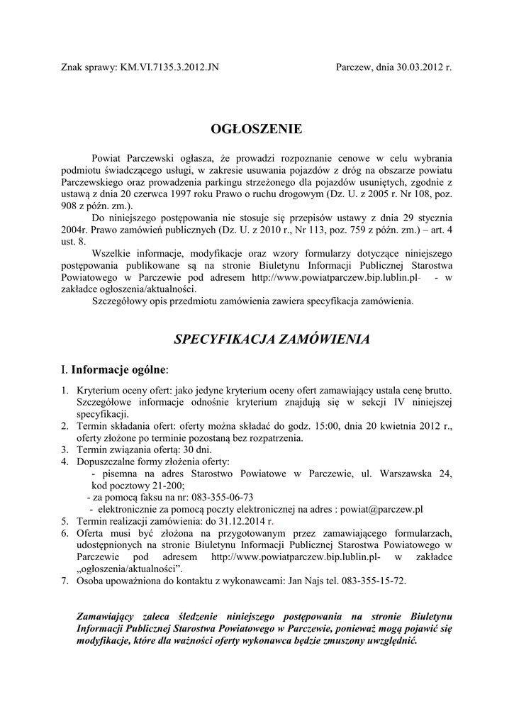 Znak sprawy: KM.VI.7135.3.2012.JN Parczew, dnia 30.03.2012 r. OGŁOSZENIE Powiat Parczewski ogłasza, że prowadzi rozpoznanie cenowe w celu wybrania podmiotu świadczącego usługi, w zakresie usuwania pojazdów z dróg na obszarze powiatu Parczewskiego oraz prowadzenia parkingu strzeżonego dla pojazdów usuniętych, zgodnie z ustawą z dnia 20 czerwca 1997 roku Prawo o ruchu drogowym (Dz. U. z 2005 r. Nr 108, poz. 908 z późn. zm.). Do niniejszego postępowania nie stosuje się przepisów ustawy z dnia 29 stycznia 2004r. Prawo zamówień publicznych (Dz. U. z 2010 r., Nr 113, poz. 759 z późn. zm.) – art. 4 ust. 8. Wszelkie informacje, modyfikacje oraz wzory formularzy dotyczące niniejszego postępowania publikowane są na stronie Biuletynu Informacji Publicznej Starostwa Powiatowego w Parczewie pod adresem http://www.powiatparczew.bip.lublin.pl- - w zakładce ogłoszenia/aktualności. Szczegółowy opis przedmiotu zamówienia zawiera specyfikacja zamówienia. SPECYFIKACJA ZAMÓWIENIA I. Informacje ogólne: 1. Kryterium oceny ofert: jako jedyne kryterium oceny ofert zamawiający ustala cenę brutto. Szczegółowe informacje odnośnie kryterium znajdują się w sekcji IV niniejszej specyfikacji. 2. Termin składania ofert: oferty można składać do godz. 15:00, dnia 20 kwietnia 2012 r., oferty złożone po terminie pozostaną bez rozpatrzenia. 3. Termin związania ofertą: 30 dni. 4. Dopuszczalne formy złożenia oferty: - pisemna na adres Starostwo Powiatowe w Parczewie, ul. Warszawska 24, kod pocztowy 21-200; - za pomocą faksu na nr: 083-355-06-73 - elektronicznie za pomocą poczty elektronicznej na adres : [email protected] 5. Termin realizacji zamówienia: do 31.12.2014 r. 6. Oferta musi być złożona na przygotowanym przez zamawiającego formularzach, udostępnionych na stronie Biuletynu Informacji Publicznej Starostwa Powiatowego w Parczewie pod adresem http://www.powiatparczew.bip.lublin.pl- w zakładce „ogłoszenia/aktualności”. 7. Osoba upoważniona do kontaktu z wykonawcami: Jan Najs tel. 083-355-15-72. Zamawiający zaleca śledzenie niniejszego postępowania na stronie Biuletynu Informacji Publicznej Starostwa Powiatowego w Parczewie, ponieważ mogą pojawić się modyfikacje, które dla ważności oferty wykonawca będzie zmuszony uwzględnić. II. Przedmiot zamówienia: Usuwanie pojazdów z dróg powiatu parczewskiego po otrzymaniu dyspozycji od uprawnionego funkcjonariusza, a następnie umieszczanie i rozładunek na strzeżonym parkingu do czasu uiszczenia opłaty za jego usunięcie i przechowywanie. Typy pojazdów oraz wymagany czas na ich usunięcie: 1. Pojazd o dopuszczalnej masie całkowitej do 3,5 tony, rower, motorower, motocykl – wymagany czas na usunięcie z drogi: do 80 minut od wydania dyspozycji przez osobę uprawnioną; 2. Pojazd o dopuszczalnej masie całkowitej powyżej 3,5 tony do 7,5 tony – wymagany czas na usunięcie z drogi: do 120 minut od wydania dyspozycji przez osobę uprawnioną; 3. Pojazd o dopuszczalnej masie całkowitej powyżej 7,5 tony – wymagany czas na usunięcie z drogi: do 180 minut od wydania dyspozycji przez osobę uprawnioną; Osoby uprawnione do wydania dyspozycji usunięcia pojazdu z drogi: 1. Funkcjonariusz Policji; 2. Osoba dowodząca akcją ratowniczą; Wykonawca zobowiązany będzie do następujących czynności podczas realizacji usługi: 1. Przyjęcia każdego zlecenia usunięcia pojazdu zgodnie z dyspozycją wydaną przez uprawniony organ w trybie art. 130a ustawy z dnia 20 czerwca 1997 r. Prawo o ruchu drogowym (Dz. U. z 2005 r., Nr 108, poz. 908 z późn. zm.), a następnie usunięcia z drogi i umieszczenia pojazdu na parkingu strzeżonym. Podstawą przyjęcia pojazdu na miejsce jego przechowywania będzie kopia dokumentu potwierdzającego wydanie dyspozycji usunięcia pojazdu; 2. Przechowywania usuniętego pojazdu na parkingu strzeżonym do czasu jego odbioru przez właściciela lub osobę przez niego upoważnioną; 3. Wydanie pojazdu właścicielowi lub osobie przez niego upoważnionej po okazaniu dowodu uiszczenia opłat za jego usunięcie i przechowywanie; 4. Przechowywania w zabezpieczonym pomieszczeniu wyposażenia, części lub innych elementów oddzielonych od pojazdu, które mogłyby ulec zniszczeniu lub zaginięciu w miejscu do przechowywania pojazdów; 5. Zabezpieczenia prawidłowego przechowywania pojazdów z uszkodzeniami powypadkowymi, co najmniej przykrycia ich folią; 6. Przechowywania pojazdów na parkingu wskazanym w wykazie załączonym do oferty; 7. Przedstawienie w Starostwie Powiatowym w Parczewie (Wydział Komunikacji) wraz z fakturą wykazu pojazdów umieszczonych na parkingu strzeżonym w poprzednim kwartale z podaniem trybu umieszczenia, daty umieszczenia, marki i typu pojazdu, numeru rejestracyjnego (w przypadku braku numeru rejestracyjnego należy podać nr nadwozia/podwozia/ramy) i daty odbioru, (doba rozpoczyna się z chwilą umieszczenia pojazdu na parkingu); 8. Powiadomienie Starostwa Powiatowego w Parczewie (Wydział Komunikacji) oraz podmiotu, który wydał dyspozycję usunięcia o nieodebraniu pojazdu z parkingu wykonawcy w terminie nie później niż trzeciego dnia od dnia upływu 3 miesięcy od momentu umieszczenia pojazdu na parkingu; 9. Pojazd usunięty w trybie określonym w art. 130a ustawy i nieodebrany przez właściciela lub osobę przez niego uprawnioną w terminie 3 miesięcy od dnia usunięcia pozostaje na parkingu do czasu zakończenia postępowania sądowego w sprawie przepadku pojazdu na rzecz powiatu; Wyżej wymieniona usługa będzie świadczona całodobowo przez 7 dni w tygodniu. III. Warunki, jakie musi spełniać wykonawca, aby móc się ubiegać o niniejsze zamówienie publiczne: 1. Wymagania formalne: uprawnienia do wykonywania określonej działalności lub czynności, w tym wypadku posiadanie przez wykonawcę aktualnej licencji na wykonywanie transportu drogowego rzeczy, wydawanej na podstawie art. 5 ust. 1 ustawy z dnia 6 września 2001 r. o transpo