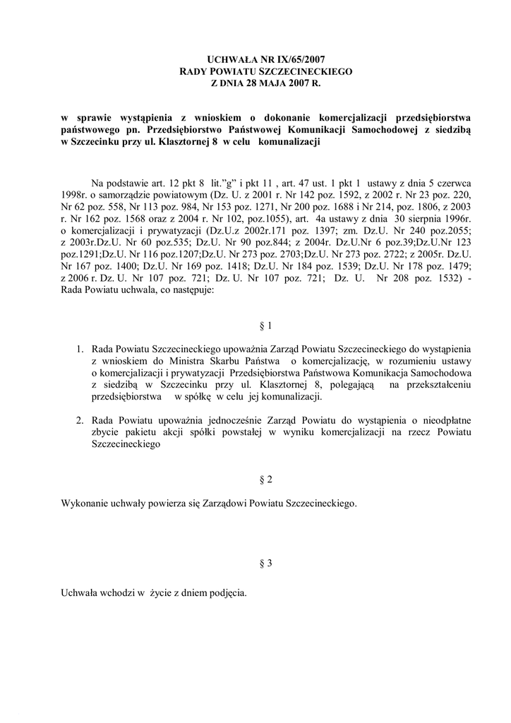 UCHWAŁA NR IX/65/2007 RADY POWIATU SZCZECINECKIEGO Z DNIA 28 MAJA 2007 R. w sprawie wystąpienia z wnioskiem o dokonanie komercjalizacji przedsiębiorstwa państwowego pn. Przedsiębiorstwo Państwowej Komunikacji Samochodowej z siedzibą w Szczecinku przy ul. Klasztornej 8 w celu komunalizacji Na podstawie art. 12 pkt 8 lit.”g” i pkt 11 , art. 47 ust. 1 pkt 1 ustawy z dnia 5 czerwca 1998r. o samorządzie powiatowym (Dz. U. z 2001 r. Nr 142 poz. 1592, z 2002 r. Nr 23 poz. 220, Nr 62 poz. 558, Nr 113 poz. 984, Nr 153 poz. 1271, Nr 200 poz. 1688 i Nr 214, poz. 1806, z 2003 r. Nr 162 poz. 1568 oraz z 2004 r. Nr 102, poz.1055), art. 4a ustawy z dnia 30 sierpnia 1996r. o komercjalizacji i prywatyzacji (Dz.U.z 2002r.171 poz. 1397; zm. Dz.U. Nr 240 poz.2055; z 2003r.Dz.U. Nr 60 poz.535; Dz.U. Nr 90 poz.844; z 2004r. Dz.U.Nr 6 poz.39;Dz.U.Nr 123 poz.1291;Dz.U. Nr 116 poz.1207;Dz.U. Nr 273 poz. 2703;Dz.U. Nr 273 poz. 2722; z 2005r. Dz.U. Nr 167 poz. 1400; Dz.U. Nr 169 poz. 1418; Dz.U. Nr 184 poz. 1539; Dz.U. Nr 178 poz. 1479; z 2006 r. Dz. U. Nr 107 poz. 721; Dz. U. Nr 107 poz. 721; Dz. U. Nr 208 poz. 1532) Rada Powiatu uchwala, co następuje: §1 1. Rada Powiatu Szczecineckiego upoważnia Zarząd Powiatu Szczecineckiego do wystąpienia z wnioskiem do Ministra Skarbu Państwa o komercjalizację, w rozumieniu ustawy o komercjalizacji i prywatyzacji Przedsiębiorstwa Państwowa Komunikacja Samochodowa z siedzibą w Szczecinku przy ul. Klasztornej 8, polegającą na przekształceniu przedsiębiorstwa w spółkę w celu jej komunalizacji. 2. Rada Powiatu upoważnia jednocześnie Zarząd Powiatu do wystąpienia o nieodpłatne zbycie pakietu akcji spółki powstałej w wyniku komercjalizacji na rzecz Powiatu Szczecineckiego §2 Wykonanie uchwały powierza się Zarządowi Powiatu Szczecineckiego. §3 Uchwała wchodzi w życie z dniem podjęcia. 2 UZASADNIENIE Przedsiębiorstwo Państwowej Komunikacji Samochodowej z siedzibą w Szczecinku przy ul. Klasztornej 8 zostało utworzone na podstawie zarządzenia Nr 166 Ministra Transportu i Gospodarki Morskiej z dnia 07 czerwca 1990 r., a jego organem założycielskim jest Wojewoda Zachodniopomorski. Przedsiębiorstwo zostało wpisane w dniu 04 stycznia 2002 r. przez Sąd Rejonowy w Koszalinie IX Wydział Krajowego Rejestru Sądowego do rejestru przedsiębiorców pod nr KRS 0000069212. Dane identyfikacyjne Przedsiębiorstwa: NIP 673-000-63-66 - nadany w dniu 14 czerwca 1993 r. przez urząd Skarbowy w Szczecinku; NIP PL 6730006366 jako podatnika VAT UE – nadany w dniu 19 kwietnia 2004r. przez Urząd Skarbowy w Szczecinku; REGON 000616511 - nadany przez Wojewódzki Urząd Statystyczny w Koszalinie Przedmiotem działalność Przedsiębiorstwa jest: - transport pasażerski międzymiastowy drogowy - pozostały pasażerski transport lądowy - sprzedaż detaliczna części i akcesoriów do pojazdów - sprzedaż detaliczna paliw - obsługa i naprawy pojazdów mechanicznych - pomoc drogowa oraz pozostała działalność usługowa - wynajem nieruchomości na własny rachunek - badania i analizy techniczne kod PKD 60.21 kod PKD 60.23 kod PKD 50.30 kod PKD 50.50 kod PKD 50.20 kod PKD 50.20B kod PKD 70.20 kod PKD 74.30 Podstawowym wykonywanym przedmiotem działalności Przedsiębiorstwa jest transport pasażerski międzymiastowy drogowy. Kierując się racjonalizacją usług zbiorowego transportu na obszarze działania Powiatu Szczecineckiego oraz biorąc pod uwagę ekonomikę ich wykonywania Rada Powiatu podejmuje działania umożliwiające realizację tych celów, a umożliwiają je następujące przesłanki: Ø zadania (usługi) te mieszczą się w katalogu publicznych zadań własnych o charakterze ponadgminnym zastrzeżonych do realizacji przez samorząd powiatowy ustawą o samorządzie powiatowym w art. 4 ust. 1 pkt 6; Ø podmiot wykonuje podstawową działalność na obszarze administracyjnym Powiatu Szczecineckiego obsługując m.in. następujące linie komunikacji autobusowej: Szczecinek – Czaplinek; Szczecinek - Złocieniec; Szczecinek – Drawsko Pomorskie; Szczecinek Barwice; Szczecinek – Grzmiąca; Szczecinek – Kalisz Pomorski; Szczecinek Wierzchowo Złocienieckie, a także realizuje przewozy osób w relacjach dalekobieżnych Szczecinek – Koszalin; Szczecinek - Piła, Szczecinek – Szczecin; Szczecinek Kraków; Szczecinek – Wrocław; Szczecinek – Jelenia Góra i inne. Ø podmiot nie jest wpisany na listę przedsiębiorstw państwowych oraz jednoosobowych spółek Skarbu Państwa o szczególnym znaczeniu dla gospodarki państwa utworzonej Rozporządzeniem Rady Ministrów z dnia 18 stycznia 2005 r. w sprawie określenia przedsiębiorstw państwowych oraz jednoosobowych spółek Skarbu Państwa o szczególnym znaczeniu dla gospodarki państwa (Dz. U. Nr 15 poz. 123) ani na inne listy spółek o znaczeniu państwowym tworzonych na podstawie odrębnych przepisów. W związku z możliwościami jakie daje ustawa o komercjalizacji i prywatyzacji, a także w konsekwencji doprowadzenie do władania przekształconym przedsiębiorstwem - Rada Powiatu zobowiązuje Zarząd Powiatu do wykonania drugiego etapu tego procesu, a mianowicie wystąpienia z wnioskiem do Ministra Skarbu Państwa o nieodpłatne nabycie na rzecz Powiatu Szczecineckiego pakietu akcji spółki powstałej w wyniku komercjalizacji. 3 Uznaje bowiem, że samorząd powiatu będąc właścicielem tej firmy z jej majątkiem: gruntami oraz budynkami, taborem samochodowym, rzeczami ruchomymi oraz wartościami niematerialnymi i prawnymi, a także kadrą pracowników posiada większe możliwości racjonalnego wykonywania zadań w zakresie transportu zbiorowego. Korzyści płynące z komunalizacji tego Przedsiębiorstwa należy rozpatrywać uwzględniając zamiar połączenia go z Komunikacją Miejską Sp. z o.o. w Szczecinku przez co nastąpi konsolidacja – połączenie dwóch firm komunalnych w jedną - świadczącą usługi zarówno na liniach międzymiastowych jak i komunikacji miejskiej. K