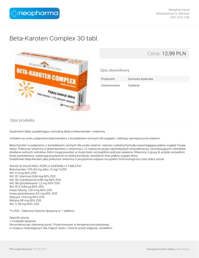 Neopharma.pl Mickiewicza 5, Mikstat 531-470-109 Beta-Karoten Complex 30 tabl. Cena: 12,99 PLN Opis słownikowy Producent Domowa Apteczka Zastosowanie Opalanie Opis produktu Suplement diety uzupełniający normalną dietę w beta-karoten i witaminy. Unikalne na rynku połączenie beta-karotenu z kompleksem cennych dla wyglądu i dobrego samopoczucia witamin. Beta-Karoten w połączeniu z kompleksem cennych dla urody witamin, stanowi unikalną formułę wspomagającą piękny wygląd Twojej skóry. Prekursor witaminy A (beta-karoten) z witaminą C i E należą do grupy najsilniejszych antyutleniaczy, neutralizujących szkodliwe działanie wolnych rodników, które mogą powstać w dużej ilości szczególnie podczas opalania. Witaminy z grupy B, przede wszystkim kwas pantotenowy, wpływają pozytywnie na dobrą kondycję, nawilżenie oraz piękny wygląd skóry. Dodatkowo beta-karoten jako prekursor witaminy A pozytywnie wpływa na system immunologiczny oraz dobry wzrok. SKŁAD W ZALECANEJ PORCJI DZIENNEJ 4 TABLETKI: Beta-karoten 10% 60 mg (ekw. 6 mg) %ZDS Wit. E 6mg 60% ZDS Wit. B1 (tiamina) 0,84 mg 60% ZDS Wit. B2 (ryboflawina) 0,96 mg 60% ZDS Wit. B6 (pirydoksyna) 1,2 mg 60% ZDS Wit. B12 0,6mcg 60% ZDS Kwas foliowy 120 mcg 60% ZDS Kwas pantotenowy 3,6 mg 60% ZDS Niacyna 10,8 mg 60% ZDS Biotyna 90 mg 60% ZDS Wit. C 36 mg 60% ZDS *% ZDS - Zalecane Dzienne Spożycie w 1 tabletce Sposób użycia: 1-4 tabletki dziennie. Nie przekraczać zalecanej porcji. Przechowywać w temperaturze pokojowej, w miejscu niedostępnym dla małych dzieci. Chronić przed wilgocią i światłem! Plik wygenerowano: 07-03-2017 Oprogramowanie sklepu: AptusShop Neopharma.pl Mickiewicza 5, Mikstat 531-470-109 Suplement diety nie może być stosowany jako substytut zróżnicowanej diety. Zrównoważony sposób żywienia i zdrowy tryb życia są ważne. Plik wygenerowano: 07-03-2017 Powered by TCPDF (www.tcpdf.org) Oprogramowanie sklepu: AptusShop
