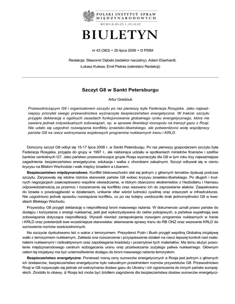 BIURO BADAŃ I ANALIZ BIULETYN nr 43 (383) • 20 lipca 2006 • © PISM Redakcja: Sławomir Dębski (redaktor naczelny), Adam Eberhardt, Łukasz Kulesa, Emil Pietras (sekretarz Redakcji) Szczyt G8 w Sankt Petersburgu Artur Gradziuk Przewodniczącym G8 i organizatorem szczytu po raz pierwszy była Federacja Rosyjska. Jako najważniejszy priorytet swego przewodnictwa wyznaczyła bezpieczeństwo energetyczne. W trakcie szczytu przyjęto deklarację o ogólnych zasadach funkcjonowania globalnego rynku energetycznego, która nie zawiera jednak indywidualnych zobowiązań, np. w sprawie likwidacji monopolu na tranzyt gazu z Rosji. Nie udało się uzgodnić rozwiązania konfliktu izraelsko-libańskiego, ale potwierdzono wolę współpracy państw G8 na rzecz wstrzymania wojskowych programów nuklearnych Iranu i KRLD. Doroczny szczyt G8 odbył się 15-17 lipca 2006 r. w Sankt Petersburgu. Po raz pierwszy gospodarzem szczytu była Federacja Rosyjska, przyjęta do grupy w 1997 r., ale niebiorąca udziału w spotkaniach ministrów finansów i szefów banków centralnych G7. Jako państwo przewodniczące grupie Rosja wyznaczyła dla G8 w tym roku trzy najważniejsze zagadnienia: bezpieczeństwo energetyczne, edukacja i walka z chorobami zakaźnymi. Szczyt odbywał się w cieniu kryzysu na Bliskim Wschodzie i walk między Izraelem a Libanem. Bezpieczeństwo międzynarodowe. Konflikt bliskowschodni stał się jednym z głównych tematów dyskusji podczas szczytu. Zarysowały się istotne różnice stanowisk państw G8 wobec kryzysu izraelsko-libańskiego. Po długich i trudnych negocjacjach zaakceptowano wspólne oświadczenie, w którym obarczono ekstremistów z Hezbollahu i Hamasu odpowiedzialnością za przemoc i rozszerzenie się konfliktu oraz wezwano ich do zaprzestania ataków. Zaapelowano do Izraela o powściągliwość w działaniach, unikanie ofiar wśród ludności cywilnej oraz zniszczeń w infrastrukturze. Nie uzgodniono jednak sposobu rozwiązania konfliktu, co po raz kolejny uwidoczniło brak jednomyślności G8 w kwestiach Bliskiego Wschodu. Przywódcy G8 przyjęli deklarację o nieproliferacji broni masowego rażenia. W dokumencie uznali prawo państw do dostępu i korzystania z energii nuklearnej, jeśli jest wykorzystywana do celów pokojowych, a państwa wypełniają swe zobowiązania dotyczące nieproliferacji. Wyrazili również zaniepokojenie rozwojem programów nuklearnych w Iranie i KRLD oraz potwierdzili swe wcześniejsze stanowiska: skierowanie sprawy Iranu do RB ONZ oraz wezwanie KRLD do wznowienia rozmów sześciostronnych. Na szczycie dyskutowano też o walce z terroryzmem. Prezydenci Putin i Bush przyjęli wspólną Globalną inicjatywę walki z terroryzmem nuklearnym. Zakłada ona rozszerzenie i przyspieszenie działań na rzecz lepszej kontroli nad materiałami nuklearnymi i radioaktywnym oraz zapobiegania kradzieży i przemytowi tych materiałów. Ma temu służyć powołanie międzynarodowego centrum wzbogacania uranu oraz przetwarzania zużytego paliwa nuklearnego. Głównym celem tej inicjatywy ma być uniemożliwienie dostępu do broni masowego rażenia terrorystom. Bezpieczeństwo energetyczne. Ponieważ rosną ceny surowców energetycznych a Rosja jest jednym z głównych ich dostawców, bezpieczeństwo energetyczne było naturalnym przedmiotem rozmów przywódców G8. Przewodnictwo Rosji w G8 rozpoczęło się jednak od wstrzymania dostaw gazu do Ukrainy i ich ograniczenia do innych państw europejskich. Zrodziło to obawy, iż Rosja też może być źródłem zagrożenia dla bezpieczeństwa dostaw surowców energetycz- 1668 Polski Instytut Spraw Międzynarodowych nych. Członkami G8 są zarówno państwa będące głównymi światowymi odbiorcami surowców energetycznych, jak i Rosja oraz Kanada, liczący się dostawcy. Pomimo różnic w postrzeganiu bezpieczeństwa energetycznego przywódcy G8 przyjęli deklarację wyznaczającą ogólne zasady poprawy funkcjonowania globalnego rynku energetycznego. Konieczne działania mają się koncentrować na: podniesieniu przejrzystości i stabilności rynków energetycznych, poprawie klimatu inwestycyjnego w sektorze energetycznym, efektywniejszym wykorzystaniu energii, dywersyfikacji źródeł energii, zapewnieniu bezpieczeństwa infrastruktury energetycznej. Przyjęty dokument ma charakter deklaratywny. Nie wyznaczono konkretnych narzędzi kontroli i stabilizacji cen surowców, ale za pozytywną należy uznać inicjatywę o wzmocnieniu systemu gromadzenia danych na temat rezerw ropy i innych surowców energetycznych. Dzięki niemu lepiej będą znane możliwości i źródła uzupełnienia dostaw surowców w razie wahań ich podaży. Przywódcy G8 zaapelowali o redukcję barier dla inwestycji w sektorze energetycznym na wszystkich etapach dostaw energii, ale nie określili wymagań dla poszczególnych państw. Odzwierciedla to różnicę zdań między UE i Rosją. UE zależy na zwiększeniu dostępu do rosyjskich złóż ropy i gazu oraz do infrastruktury tranzytowej, która jest obecnie pod kontrolą monopolisty państwowego – Gazpromu. Rosji natomiast chodzi o dostęp do europejskiego rynku dystrybucji. Deklaracja przywódców G8 w sprawie bezpieczeństwa energetycznego wyznacza podstawowe zasady jego poprawy. Jednakże w przyszłości konieczne będą bardziej konkretne działania i zobowiązania poszczególnych członków, co nie będzie proste biorąc pod uwagę różnice interesów. Świadczy o nich spór między UE i FR o Europejską Kartę Energetyczną. Rosja odmawia ratyfikacji dokumentu, obawiając się negatywnych konsekwencji liberalizacji rynku surowców. Walka z chorobami zakaźnymi, edukacja. W przyjętej deklaracji zapowiedziano zwiększenie międzynarodowej współpracy w walce z chorobami zakaźnymi. Priorytetem jest walka z HIV/AIDS, a celem zapewnienie do 2010 r. powszechnego dostępu do leczenia. Zaakceptowano rosyjską propozycję włączenia państw Europy Wschodniej i Azji Centralnej do ini