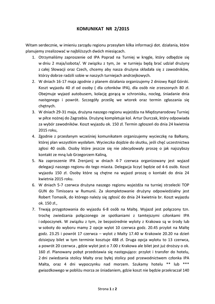 KOMUNIKAT NR 2/2015 Witam serdecznie, w imieniu zarządu regionu przesyłam kilka informacji dot. działania, które planujemy zrealizować w najbliższych dwóch miesiącach. 1. Otrzymaliśmy zaproszenie od IPA Poprad na Turniej w kręgle, który odbędzie się w dniu 2 maja/sobota/. W związku z tym, że w turnieju będą brać udział drużyny z całej Słowacji oraz Czech, chcemy aby nasza drużyna składała się z zawodników, którzy dobrze radzili sobie w naszych turniejach andrzejkowych. 2. W dniach 16-17 maja zgodnie z planem działania organizujemy 2 dniowy Rajd Górski. Koszt wyjazdu 40 zł od osoby ( dla członków IPA), dla osób nie zrzeszonych 80 zł. Obejmuje wyjazd autobusem, kolację gorącą w schronisku, nocleg, śniadanie dnia następnego i powrót. Szczegóły prześlę we wtorek oraz termin zgłaszania się chętnych. 3. W dniach 29-31 maja, drużyna naszego regionu wyjeżdża na Międzynarodowy Turniej w piłce nożnej do Zagrzebia. Drużynę kompletuje kol. Artur Durczak, który odpowiada za wybór zawodników. Koszt wyjazdu ok. 150 zł. Termin zgłoszeń do dnia 24 kwietnia 2015 roku, 4. Zgodnie z przesłanym wcześniej komunikatem organizujemy wycieczkę na Bałkany, której plan wszystkim wysłałam. Wycieczka dojdzie do skutku, jeśli chęć uczestnictwa zgłosi 40 osób. Osoby które jeszcze się nie zdecydowały proszę o jak najszybszy kontakt ze mną lub Grzegorzem Kaliną, 5. Na zaproszenie IPA Zrenjanij w dniach 4-7 czerwca organizowany jest wyjazd delegacji naszego regionu do tego miasta. Delegacja liczyć będzie od 4-6 osób. Koszt wyjazdu 150 zł. Osoby które są chętne na wyjazd proszę o kontakt do dnia 24 kwietnia 2015 roku. 6. W dniach 5-7 czerwca drużyna naszego regionu wyjeżdża na turniej strzelecki TOP GUN do Timisoara w Rumunii. Za skompletowanie drużyny odpowiedzialny jest Robert Tomasik, do którego należy się zgłosić do dnia 24 kwietnia br. Koszt wyjazdu ok. 150 zł., 7. Trwają przygotowania do wyjazdu 6-8 osób na Maltę. Wyjazd jest połączony tzn. trochę zwiedzania połączonego ze spotkaniami z tamtejszymi członkami IPA i odpoczynek. W związku z tym, że bezpośrednie wyloty z Krakowa są w środy lub w soboty do wyboru mamy 2 opcje wylot 10 czerwca godz. 20.45 przylot na Maltę godz. 23.25 i powrót 17 czerwca – wylot z Malty 17.40 w Krakowie 20.20 na dzień dzisiejszy bilet w tym terminie kosztuje 488 zł. Druga opcja wylotu to 13 czerwca, a powrót 20 czerwca , gdzie wylot jest o 7.00 z Krakowa ale bilet jest już droższy o ok. 160 zł. Planowany pobyt przedstawia się następująco: przylot i transfer do hotelu, 2 dni zwiedzania stolicy Malty oraz byłej stolicy pod przewodnictwem członka IPA Malta, oraz 4 dni wypoczynku nad morzem. Szukamy hotelu ** lub *** gwiazdkowego w pobliżu morza ze śniadaniem, gdzie koszt nie będzie przekraczał 140 Strona 1 z 2 zł od dwuosobowego pokoju za noc. Pozostałe koszty, tj. przejazdy środkami komunikacji i wyżywienie w trakcie pobytu uczestnicy płacą sobie sami w zależności od tego co zechcą zjeść w czasie dnia. Prognozowany koszt od osoby to 75-80 zł/od osoby za noc (ze śniadaniem) tj. 480 zł, bilet samolotowy – 500 zł, ubezpieczenie 40 zł. Chcemy aby koszty te zamknąć w kwocie 1.100 zł. Jednakże, ze względu na zmieniające się ceny biletów oraz ostateczny wybór hotelu może on ulec zmianie. Określiliśmy jednakże graniczny koszt na 1.400 zł. na powyższe składniki. Ze względu na to, chętnych na wyjazd proszę o zgłaszanie swojego uczestnictwa do dnia 24 kwietnia i po potwierdzeniu wolnych miejsc wpłatę zaliczki w wysokości 700 zł. Po zakupie biletu lotniczego, zaliczka nie będzie zwracana w przypadku wycofania się z wyjazdu. Dwie osoby ze zgłaszających się muszą znać język angielski i zarząd dobierze kierownika grupy wyjeżdżającej. Przypominam także, że u Grzegorza są do odbioru legitymacje na rok 2015, osoby które jeszcze nie zapłaciły składki i nie odebrały legitymacji proszone są aby uczyniły to jak najszybciej. Mamy nadzieję, że to naprawdę duży wybór i każdy znajdzie coś dla siebie. Serdecznie zachęcamy do udziału. W imieniu zarządu Ela Gargula Przewodnicząca Strona 2 z 2