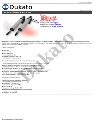 Informacje o produkcie Utworzono 07-03-2017 Ducati 812/300 mm - 1 szt Cena : 471,54 zł (netto) 580,00 zł (brutto) o Producent : Ducati Dostępność : Dostępny Stan magazynowy : średni Średnia ocena : brak recenzji Zalety urządzenia ● ● ● ● ● niska cena łatwy montaż niska awaryjność napięcie zasilania 12V niewielki pobór mocy: max 75W wysoki poziom bezpieczeństwa uk ● at Siłownik Ducati 812/300 mm jest urządzeniem wykazującym wysoką sprawność działania. Doskonale spełnia swoją funkcję w zastosowaniach o średniej intensywności działania, np. prywatne posesje. Nadaje się do automatyzacji bram o szerokości światła bramy do 5m (przy zastosowaniu dwóch siłowników) lub 3m (przy zastosowaniu jednego siłownika). Oto szczególne zalety stosowania zasilania niskonapięciowego: ● ● ● ● ● ● ● absolutne bezpieczeństwo przy niezachowaniu należytej ostrożności w obsłudze wysoka wydajność silników wykorzystujących niewielką ilość prądu nieprzegrzewanie się silników, co umożliwia częste otwieranie bram możliwość funkcjonowania poprzez podłączeenie do panela słonecznego większa kontrola nad mocą urządzenia co zwiększa bezpieczeństwo podczas pracy optymalne działanie w każdym klimacie; również w strefach dużej wilgotności funkcjonowanie w razie potrzeby z wykorzystaniem akumulatora niższe koszty produkcji, przez co niższa cena. D ● Charakterystyka techniczna ● ● ● ● ● ● ● ● ● silnik elektryczny prądu stałego 12V 35W napęd elektryczno-mechaniczny obroty śruby 1.5cm/sekundę maksymalny ciąg liniowy 90Kg praca dorywcza temperatura pracy -25oC ... +55oC zabezpieczenie poprzez wyłącznik przeciążeniowy rozblokowanie na kluczyk gwarancja 100.000 cykli Wygenerowano w programie www.oscGold.com