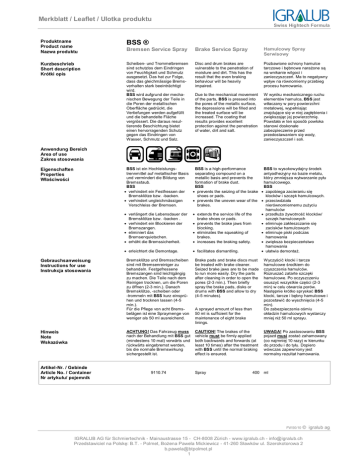 Merkblatt / Leaflet / Ulotka produktu Swiss Hightech Formula Produktname Product name Nazwa produktu BSS ® Bremsen Service Spray Brake Service Spray Hamulcowy Spray Serwisowy Kurzbeschrieb Short description Krótki opis Scheiben- und Trommelbremsen sind schutzlos dem Eindringen von Feuchtigkeit und Schmutz ausgesetzt. Das hat zur Folge, dass das gleichmässige Bremsverhalten stark beeinträchtigt wird. BSS wird aufgrund der mechanischen Bewegung der Teile in die Poren der metallischen Oberfläche gedrückt, die Vertiefungen werden aufgefüllt und die behandelte Fläche vergrössert. Die daraus resultierende Beschichtung bietet einen hervorragenden Schutz gegen das Eindringen von Wasser, Schmutz und Salz. Disc and drum brakes are vulnerable to the penetration of moisture and dirt. This has the result that the even braking behaviour will be heavily impaired. Pozbawione ochrony hamulce tarczowe i bębnowe narażone są na wnikanie wilgoci i zanieczyszczeń. Ma to negatywny wpływ na równomierny przebieg procesu hamowania. Due to the mechanical movement of the parts, BSS is pressed into the pores of the metallic surface, the depressions will be filled and the treated surface will be increased. The coating that results provides excellent protection against the penetration of water, dirt and salt. W wyniku mechanicznego ruchu elementów hamulca, BSS jest wtłaczany w pory powierzchni metalowej, wypełniając znajdujące się w niej zagłębienia i zwiększając jej powierzchnię. Powstała w ten sposób powłoka stanowi doskonałe zabezpieczenie przed przedostawaniem się wody, zanieczyszczeń i soli. Anwendung Bereich Area of use Zakres stosowania BSS ist ein HochleistungsBSS is a high-performance BSS to wysokowydajny środek trennmittel auf metallischer Basis separating compound on a antyadhezyjny na bazie metalu, und vermindert die Bildung von metallic basis and prevents the który zmniejsza wytwarzanie pyłu Bremsstaub. formation of brake dust. hamulcowego. BSS BSS BSS verhindert ein Festfressen der prevents the seizing of the brake zapobiega zacieraniu się Bremsklötze bzw. -backen. shoes or pads. klocków i szczęk hamulcowych. verhindert ungleichmässigen prevents the uneven wear of the przeciwdziała Verschleiss der Bremsen. brakes. nierównomiernemu zużyciu hamulców verlängert die Lebensdauer der extends the service life of the przedłuża żywotność klocków/ Bremsklötze bzw. -backen . brake shoes or pads. szczęk hamulcowych verhindert ein Blockieren der prevents the brake jaws from eliminuje zakleszczanie się Bremszangen. blocking. zacisków hamulcowych eliminiert das eliminates the squeaking of eliminuje piski podczas Bremsenquietschen. brakes. hamowania erhöht die Bremssicherheit. increases the braking safety. zwiększa bezpieczeństwo hamowania erleichtert die Demontage. facilitates dismantling. ułatwia demontaż. Eigenschaften Properties Właściwości Gebrauchsanweisung Instructions for use Instrukcja stosowania Hinweis Note Wskazówka Artikel-Nr. / Gebinde Article No. / Container Nr artykułu/ pojemnik Bremsklötze und Bremsscheiben sind mit Bremsenreiniger zu behandeln. Festgefressene Bremszangen sind leichtgängig zu machen. Die Teile nach dem Reinigen trocknen, um die Poren zu öffnen (2-3 min.). Danach Bremsklötze, -scheiben oder -trommeln mit BSS kurz einsprühen und trocknen lassen (4-5 min.). Für die Pflege von acht Bremsbelägen ist eine Spraymenge von weniger als 50 ml ausreichend. Brake pads and brake discs must be treated with brake cleaner. Seized brake jaws are to be made to run more easily. Dry the parts after cleaning in order to open the pores (2-3 min.). Then briefly spray the brake pads, disks or drums with BSS and allow to dry (4-5 minutes). ACHTUNG! Das Fahrzeug muss nach der Behandlung mit BSS gut (mindestens 10 mal) vorwärts und rückwärts eingebremst werden, bis die normale Bremswirkung sichergestellt ist. CAUTION! The brakes of the vehicle must be firmly applied both backwards and forwards (at least 10 times) after the treatment with BSS until the normal braking effect is ensured. UWAGA! Po zastosowaniu BSS pojazd musi zostać zahamowany (co najmniej 10 razy) w kierunku do przodu i do tyłu. Dopiero wówczas zapewniony jest normalny rezultat hamowania. Spray ml 9110.74 A sprayed amount of less than 50 ml is sufficient for the maintenance of eight brake linings. 400 Wyczyścić klocki i tarcze hamulcowe środkiem do czyszczenia hamulców. Rozruszać zatarte szczęki hamulcowe. Po oczyszczeniu osuszyć wszystkie części (2-3 min) w celu otwarcia porów. Następnie krótko spryskać BSS klocki, tarcze i bębny hamulcowe i pozostawić do wyschnięcia (4-5 min). Do zabezpieczenia ośmiu okładzin hamulcowych wystarczy mniej niż 50 ml sprayu. FW50/10 © igralub ag IGRALUB AG für Schmiertechnik - Mainaustrasse 15 - CH-8008 Zürich - www.igralub.ch - [email protected] Przedstawiciel na Polskę: B.T. - Polmet, Bożena Pawela Mickiewicz - 41-260 Sławków ul. Szerokotorowa 2 [email protected] 1 Merkblatt / Leaflet / Ulotka produktu Swiss Hightech Formula Fortsetzung / Continued / Kontynuacja Technische Daten / Technical Data / Dane techniczne Produktname / Product name / Nazwa produktu BSS Farbe / Colour / Kolor dunkelgrau dark grey szary Form / Form / Forma Aerosol Aerosol Aerozol produktespezifisch product-specific charakterystyczny dla produktu Estern, Benzinen Esters, petrols Estry, benzynę Geruch / Odour / Zapach Grundöl / Base oil / Olej bazowy Temperaturbeständigkeit Temperature stability Odporność temperaturowa do bis till jusqu'à Flammpunkt (o.T.) / Flash point (o.c.) / Temperatura zapłonu °C Dichte / Density / Gęstość 20°C Zündtemperatur / Ignition temperature / Temperatura palenia się °C Löslichkeit in Wasser / Solubility in water / Rozpuszczalność w wodzie 20°C Gefahrenhinweise Hazard warnings Niebezpieczeństwa Sicherheitsmassnahmen Safety measures Środki bezpieczeństwa + 1'200 °C Vorschriften Regulations Prz
