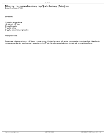 Ewa Kulak Mleczny, bo¿onarodzeniowy napój alkoholowy (Sabajon) ¶roda, 27 pa¼dziernik 2004 Sk³adniki: 1 butelka aguardiente 12 ubitych ¿Ã³³tek 3 butelki mleka 1 ³y¿ka cukru 2 ³y¿ku cynamonu w proszku Przygotowanie: Podgrzaæ mleko z cukrem, ¿Ã³³tkami i cynamonem. Kiedy p³yn zrobi siê gêsty, pozostawiæ do ostygniêcia. Nastêpnie dodaæ aguardiente, wymieszaæ i wstawiæ do lodówki. W celu nadania koloru, dodaje siê szczyptê szafranu. http://www.kolumbijsko.com _PDF_POWERED _PDF_GENERATED 7 March, 2017, 11:20