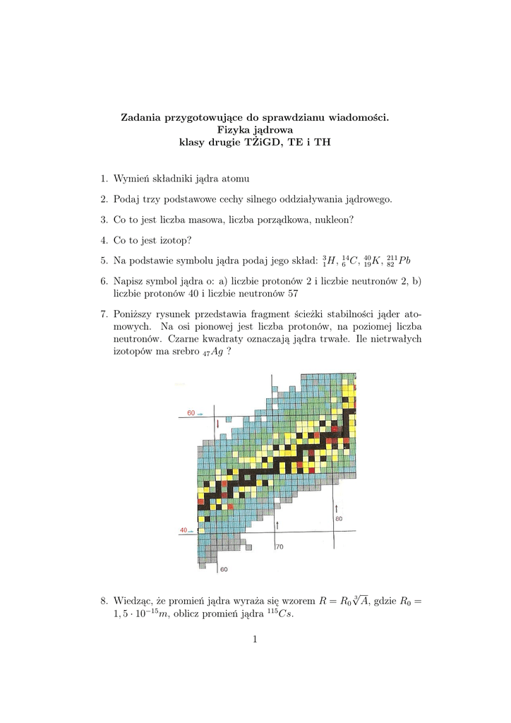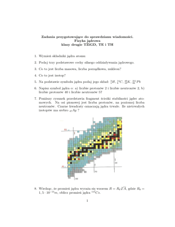 Zadania przygotowujące do sprawdzianu wiadomości. Fizyka jądrowa klasy drugie TŻiGD, TE i TH 1. Wymień składniki jądra atomu 2. Podaj trzy podstawowe cechy silnego oddziaływania jądrowego. 3. Co to jest liczba masowa, liczba porządkowa, nukleon? 4. Co to jest izotop? 5. Na podstawie symbolu jądra podaj jego skład: 31 H, 14 40 211 6 C, 19 K, 82 P b 6. Napisz symbol jądra o: a) liczbie protonów 2 i liczbie neutronów 2, b) liczbie protonów 40 i liczbie neutronów 57 7. Poniższy rysunek przedstawia fragment ścieżki stabilności jąder atomowych. Na osi pionowej jest liczba protonów, na poziomej liczba neutronów. Czarne kwadraty oznaczają jądra trwałe. Ile nietrwałych izotopów ma srebro 47 Ag ? √ 8. Wiedząc, że promień jądra wyraża się wzorem R = R0 3 A, gdzie R0 = 1, 5 · 10−15 m, oblicz promień jądra 115 Cs. 1 9. Co to jest energia wiązania jądra? 10. Wiedząc, że masa protonu wynosi mp = 1, 007 u, masa neutronu mn = 1, 008 u, oraz masa jądra 73 Li jest równa MLi = 7, 016 u, gdzie u oznacza atomową jednostkę masy, oblicz energię wiązania na jeden nukleon dla jądra litu. Przyjmij, że 1u = 1, 66 · 10−27 kg oraz c = 3 · 108 ms . 11. Wymień rodzaje reakcji jądrowych, w których można otrzymać energię jądrową. W których z nich otrzymuje się więcej energii? 12. Co jest źródłem energii w reakcjach syntezy jądrowej? 13. Podaj przykład reakcji syntezy. W jakich warunkach musi ona przebiegać? 14. Jeżeli w procesie rozszczepienia jądra uranu 235 92 U spowodowanym powolnym neutronem , jednym z dwóch lekkich powstałych jąder jest jądro baru 126 56 Ba oraz w procesie tym powstały dwa dodatkowe neutrony, to jakim jądrem musiało być drugie z powstałych jąder lżejszych? 15. Opisz łańcuch przemian energii jądrowej na energię elektryczną w elektrowni jądrowej. 16. Na czym polega zjawisko promieniotwórczości naturalnej? 17. Podaj przykłady najpowszechniej występujących źródeł naturalnej promieniotwóczości. 18. Na czym polega rozpad alfa jąder atomowych? 19. Na czym polega rozpad beta minus? 20. Na czym polega przemiana gamma? 21. Jądro radonu jądra. 222 86 Rn ulega rozpadowi alfa. Zapisz reakcję rozpadu tego 22. Jądro ołowiu 210 82 P b ulega rozpadowi beta minus. Zapisz reakcję rozpadu tego jądra. 23. Czas połowicznego zaniku jądra radonu 222 86 Rn wynosi około 4 dni. Po ilu dniach w pomieszczeniu, w którym jest 1000 jąder radonu zostanie ich najwyżej 50? 24. Jaki jest średni poziom naturalnego tła promieniowania na terenie Polski? 2