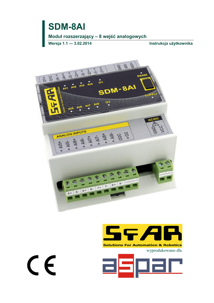 SDM-8AI Moduł rozszerzający – 8 wejść analogowych Wersja 1.1 — 3.02.2014 Instrukcja użytkownika wyprodukowano dla SDM-8AI SfAR Instrukcja użytkownika Dziękujemy za wybór naszego produktu. Niniejsza instrukcja ułatwi Państwu prawidłową obsługę i poprawną eksploatację opisywanego urządzenia. Informacje zawarte w niniejszej instrukcji przygotowane zostały z najwyższą uwagą przez naszych specjalistów i służą jako opis produktu bez ponoszenia jakiejkolwiek odpowiedzialności w rozumieniu prawa handlowego. Informacje te nie zwalniają użytkownika z obowiązku poddania produktu własnej ocenie i sprawdzenia jego właściwości. Zastrzegamy sobie możliwość zmiany parametrów produktów bez powiadomienia. Prosimy o uważne przeczytanie instrukcji i stosowanie się do zawartych w niej zaleceń UWAGA! Niedostosowanie się do instrukcji może spowodować uszkodzenie urządzenia albo utrudnić posługiwanie się sprzętem lub oprogramowaniem. Moduł rozszerzający – 8 wejść analogowych Instrukcja użytkownika © SfAR 2014. Wszelkie prawa zastrzeżone. Wersja 1.1- 3.02.2014 2 z 18 SDM-8AI SfAR Instrukcja użytkownika 1. Zasady bezpieczeństwa • Przed pierwszym uruchomieniem urządzenia należy zapoznać się z niniejszą instrukcją obsługi; • Przed pierwszym uruchomieniem urządzenia należy upewnić się, że wszystkie przewody zostały podłączone prawidłowo; • Należy zapewnić właściwe warunki pracy, zgodne ze specyfikacją urządzenia (np.: napięcie zasilania, temperatura, maksymalny pobór prądu); • Przed dokonaniem jakichkolwiek modyfikacji przyłączeń przewodów, należy wyłączyć napięcie zasilania. 2. Charakterystyka modułu 2.1. Przeznaczenie i opis modułu Moduł SDM-8AI umożliwia pomiar wartości napięć oraz prądów. Odczyt wartości następuje za pomocą magistrali RS485 (protokół Modbus), dzięki czemu w prosty sposób można zintegrować moduł z popularnymi sterownikami PLC, HMI lub komputerami PC wyposażonymi w odpowiednie przejściówki. Urządzenie posiada zestaw 8 wejść do pomiarów analogowych. Dodatkowo moduł wyposażony jest w 2 konfigurowalne wyjścia cyfrowe. Moduł ten podłączany jest do magistrali RS485 za pomocą dwu przewodowej skrętki. Komunikacja odbywa się z wykorzystaniem protokołu MODBUS RTU lub MODBUS ASCII. Zastosowanie 32-bitowego procesora z rdzeniem ARM zapewnia szybkie przetwarzanie danych i szybką komunikację. Prędkość transmisji jest konfigurowalna od 2400 do 115200. Moduł przeznaczony jest do montażu na szynie DIN zgodnie z normą DIN EN 5002. Moduł został wyposażony z zestaw diod LED (kontrolek), używanych do wskazywania stanu wyjść przydatnych w celach diagnostycznych i pomagających w znalezieniu błędów. Konfiguracja modułu odbywa się przez USB za pomocą dedykowanego programu komputerowego. Możliwa jest również zmiana parametrów za pomocą protokołu MODBUS. Moduł rozszerzający – 8 wejść analogowych Instrukcja użytkownika © SfAR 2014. Wszelkie prawa zastrzeżone. Wersja 1.1- 3.02.2014 3 z 18 SDM-8AI SfAR Instrukcja użytkownika 2.2. Specyfikacja techniczna Zasilanie Wejścia Wyjścia cyfrowe Temperatura Złącza Wymiary Interfejs * Napięcie 10-30 VDC; 10-28VAC Prąd maksymalny* DC: 52 mA @ 24VDC AC: 62 mA @ 24VAC Maksymalna pobierana moc DC: 1,25W; AC: 1,5VA Liczba wejść 8 Wejście napięciowe 0V do 10V (rozdzielczość 1.5mV) Wejście napięciowe -10V do 10V (rozdzielczość 1.5mV) Wejście napięciowe 0V do 1V(rozdzielczość 0.1875mV) Wejście napięciowe -1V do 1V(rozdzielczość 0.1875V) Wejście prądowe 4mA do 20mA (rozdzielczość 3.75μA) Wejście prądowe 0mA do 20mA (rozdzielczość 3.75μA) Wejście prądowe -20mA do 20mA (rozdzielczość 3.75μA) Rozdzielczość przetwornika 14 bitów Czas przetwarzania ADC 16ms / kanał Izolacja 1500 Vrms Maksymalny prąd i napięcie 500mA / 55V Izolacja 1500 Vrms Pracy -10 °C - +50°C Przechowywania -40 °C - +85°C Zasilające 2 pinowe Komunikacyjne 3 pinowe Wejścia 2x 10 pinowe Konfiguracyjne Mini USB Wysokość 110 mm Głębokość 62 mm Szerokość 88 mm RS485 Do 128 urządzeń Maksymalny prąd przy aktywnej transmisji Modbus, załączonych wszystkich wejściach i wyjściach Moduł rozszerzający – 8 wejść analogowych Instrukcja użytkownika © SfAR 2014. Wszelkie prawa zastrzeżone. Wersja 1.1- 3.02.2014 4 z 18 SDM-8AI SfAR Instrukcja użytkownika 2.3. Wymiary modułu Wygląd i wymiary modułu znajdują się na rysunku poniżej. Moduł mocowany jest bezpośrednio do szyny w przemysłowym standardzie DIN. Złącza zasilające, komunikacyjne oraz wejść znajdują się od dołu i góry modułu. Złącze konfiguracyjne USB oraz wskaźniki znajdują się z przodu modułu. 91 45 110 42,3 35 110 88 Moduł rozszerzający – 8 wejść analogowych Instrukcja użytkownika © SfAR 2014. Wszelkie prawa zastrzeżone. Wersja 1.1- 3.02.2014 5 z 18 SDM-8AI SfAR Instrukcja użytkownika 3. Konfiguracja komunikacji 3.1. Uziemienie i ekranowanie Moduł może być zainstalowany wraz z innymi urządzeniami, które generują promieniowanie elektromagnetyczne. Przykładami takich urządzeń są przekaźniki i styczniki, transformatory, sterowniki silników itp. To promieniowanie elektromagnetyczne może powodować zakłócenia elektryczne zasilania i przewodów sygnałowych, a także promieniując bezpośrednio do modułu, powodując negatywne skutki dla systemu. Odpowiednie uziemienie, osłony oraz inne działania ochronne należy podjąć na etapie instalacji, aby zapobiec tym efektom. Te działania ochronne obejmują m.in. uziemienie szafy sterowniczej, uziemienie modułu, uziemienie ekranowania przewodów, zabezpieczenie urządzeń przełączających, prawidłowego okablowania, jak również uwzględnienie typów kabli i ich przekrojów. 3.2. Terminator Efekty linii transmisyjnej często powodują problemy w sieciach teleinformatycznych. Problemy te dotyczą najczęściej tłumienia sygnału i odbić w sieci. 