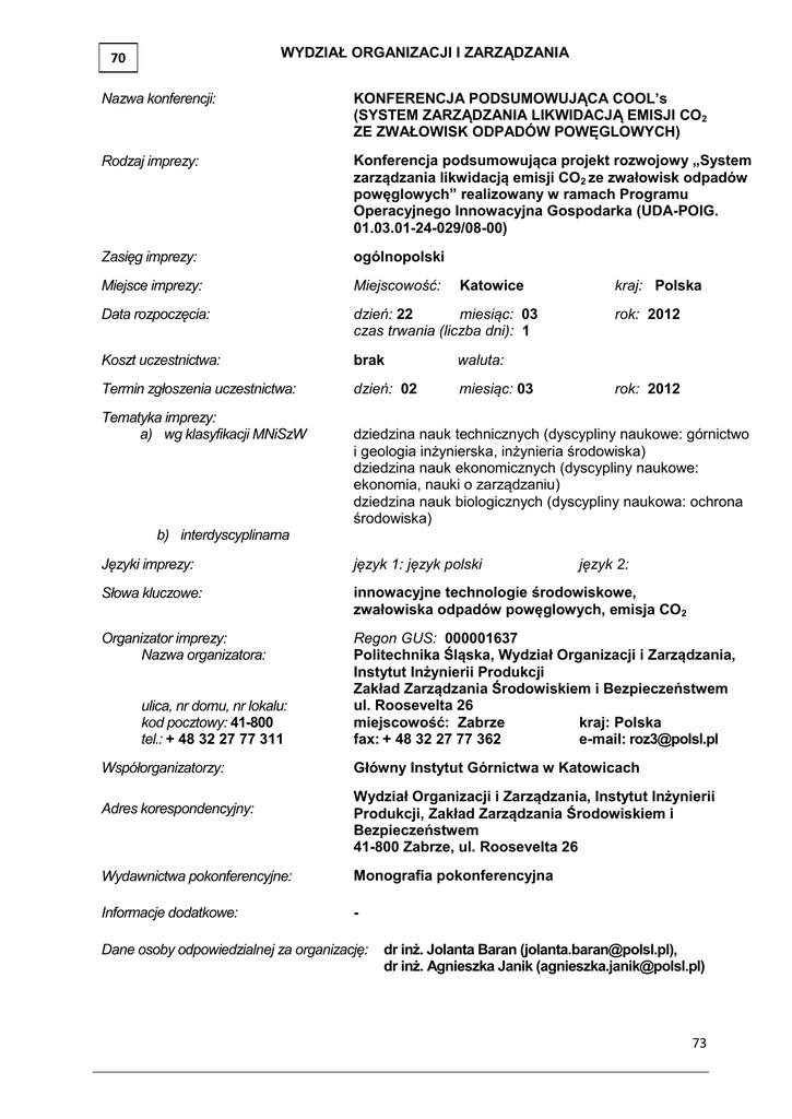 WYDZIAŁ ORGANIZACJI I ZARZĄDZANIA 70 Nazwa konferencji: KONFERENCJA PODSUMOWUJĄCA COOL’s (SYSTEM ZARZĄDZANIA LIKWIDACJĄ EMISJI CO2 ZE ZWAŁOWISK ODPADÓW POWĘGLOWYCH) Rodzaj imprezy: Konferencja podsumowująca projekt rozwojowy „System zarządzania likwidacją emisji CO2 ze zwałowisk odpadów powęglowych” realizowany w ramach Programu Operacyjnego Innowacyjna Gospodarka (UDA-POIG. 01.03.01-24-029/08-00) Zasięg imprezy: ogólnopolski Miejsce imprezy: Miejscowość: Data rozpoczęcia: dzień: 22 miesiąc: 03 czas trwania (liczba dni): 1 Koszt uczestnictwa: brak waluta: Termin zgłoszenia uczestnictwa: dzień: 02 miesiąc: 03 Tematyka imprezy: a) wg klasyfikacji MNiSzW Katowice kraj: Polska rok: 2012 rok: 2012 dziedzina nauk technicznych (dyscypliny naukowe: górnictwo i geologia inżynierska, inżynieria środowiska) dziedzina nauk ekonomicznych (dyscypliny naukowe: ekonomia, nauki o zarządzaniu) dziedzina nauk biologicznych (dyscypliny naukowa: ochrona środowiska) b) interdyscyplinarna Języki imprezy: język 1: język polski Słowa kluczowe: innowacyjne technologie środowiskowe, zwałowiska odpadów powęglowych, emisja CO2 Organizator imprezy: Nazwa organizatora: Regon GUS: 000001637 Politechnika Śląska, Wydział Organizacji i Zarządzania, Instytut Inżynierii Produkcji Zakład Zarządzania Środowiskiem i Bezpieczeństwem ul. Roosevelta 26 miejscowość: Zabrze kraj: Polska fax: + 48 32 27 77 362 e-mail: [email protected] ulica, nr domu, nr lokalu: kod pocztowy: 41-800 tel.: + 48 32 27 77 311 Współorganizatorzy: Adres korespondencyjny: język 2: Główny Instytut Górnictwa w Katowicach Wydział Organizacji i Zarządzania, Instytut Inżynierii Produkcji, Zakład Zarządzania Środowiskiem i Bezpieczeństwem 41-800 Zabrze, ul. Roosevelta 26 Wydawnictwa pokonferencyjne: Monografia pokonferencyjna Informacje dodatkowe: - Dane osoby odpowiedzialnej za organizację: dr inż. Jolanta Baran ([email protected]), dr inż. Agnieszka Janik ([email protected]) 73