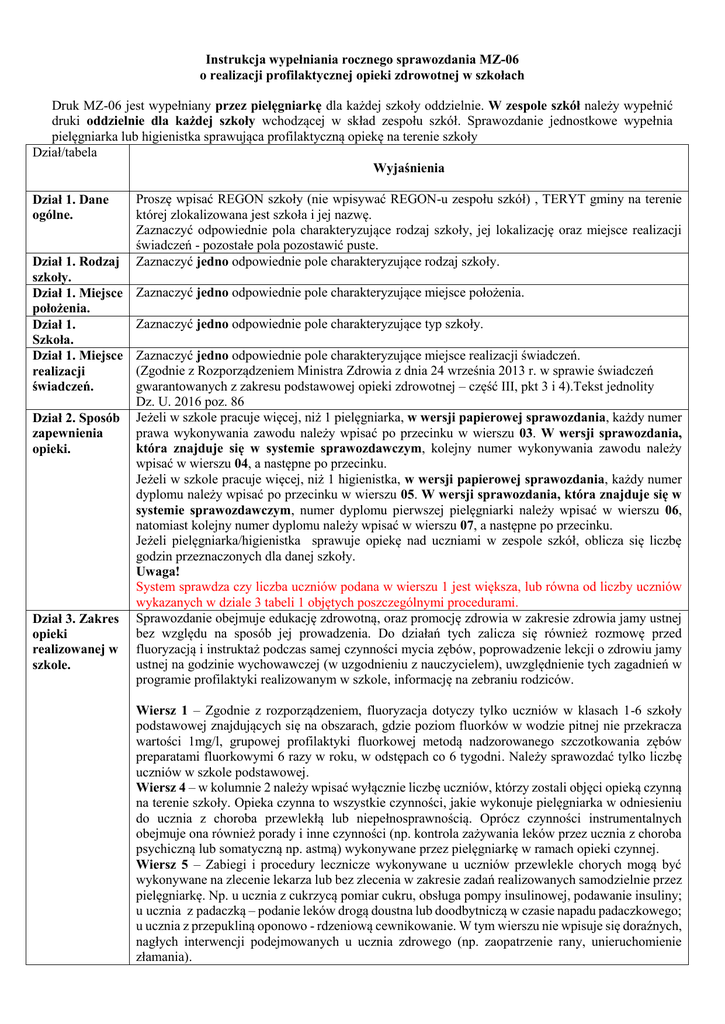 Instrukcja wypełniania rocznego sprawozdania MZ-06 o realizacji profilaktycznej opieki zdrowotnej w szkołach Druk MZ-06 jest wypełniany przez pielęgniarkę dla każdej szkoły oddzielnie. W zespole szkół należy wypełnić druki oddzielnie dla każdej szkoły wchodzącej w skład zespołu szkół. Sprawozdanie jednostkowe wypełnia pielęgniarka lub higienistka sprawująca profilaktyczną opiekę na terenie szkoły Dział/tabela Wyjaśnienia Dział 1. Dane ogólne. Dział 1. Rodzaj szkoły. Dział 1. Miejsce położenia. Dział 1. Szkoła. Dział 1. Miejsce realizacji świadczeń. Dział 2. Sposób zapewnienia opieki. Dział 3. Zakres opieki realizowanej w szkole. Proszę wpisać REGON szkoły (nie wpisywać REGON-u zespołu szkół) , TERYT gminy na terenie której zlokalizowana jest szkoła i jej nazwę. Zaznaczyć odpowiednie pola charakteryzujące rodzaj szkoły, jej lokalizację oraz miejsce realizacji świadczeń - pozostałe pola pozostawić puste. Zaznaczyć jedno odpowiednie pole charakteryzujące rodzaj szkoły. Zaznaczyć jedno odpowiednie pole charakteryzujące miejsce położenia. Zaznaczyć jedno odpowiednie pole charakteryzujące typ szkoły. Zaznaczyć jedno odpowiednie pole charakteryzujące miejsce realizacji świadczeń. (Zgodnie z Rozporządzeniem Ministra Zdrowia z dnia 24 września 2013 r. w sprawie świadczeń gwarantowanych z zakresu podstawowej opieki zdrowotnej – część III, pkt 3 i 4).Tekst jednolity Dz. U. 2016 poz. 86 Jeżeli w szkole pracuje więcej, niż 1 pielęgniarka, w wersji papierowej sprawozdania, każdy numer prawa wykonywania zawodu należy wpisać po przecinku w wierszu 03. W wersji sprawozdania, która znajduje się w systemie sprawozdawczym, kolejny numer wykonywania zawodu należy wpisać w wierszu 04, a następne po przecinku. Jeżeli w szkole pracuje więcej, niż 1 higienistka, w wersji papierowej sprawozdania, każdy numer dyplomu należy wpisać po przecinku w wierszu 05. W wersji sprawozdania, która znajduje się w systemie sprawozdawczym, numer dyplomu pierwszej pielęgniarki należy wpisać w wierszu 06, natomiast kolejny numer dyplomu należy wpisać w wierszu 07, a następne po przecinku. Jeżeli pielęgniarka/higienistka sprawuje opiekę nad uczniami w zespole szkół, oblicza się liczbę godzin przeznaczonych dla danej szkoły. Uwaga! System sprawdza czy liczba uczniów podana w wierszu 1 jest większa, lub równa od liczby uczniów wykazanych w dziale 3 tabeli 1 objętych poszczególnymi procedurami. Sprawozdanie obejmuje edukację zdrowotną, oraz promocję zdrowia w zakresie zdrowia jamy ustnej bez względu na sposób jej prowadzenia. Do działań tych zalicza się również rozmowę przed fluoryzacją i instruktaż podczas samej czynności mycia zębów, poprowadzenie lekcji o zdrowiu jamy ustnej na godzinie wychowawczej (w uzgodnieniu z nauczycielem), uwzględnienie tych zagadnień w programie profilaktyki realizowanym w szkole, informację na zebraniu rodziców. Wiersz 1 – Zgodnie z rozporządzeniem, fluoryzacja dotyczy tylko uczniów w klasach 1-6 szkoły podstawowej znajdujących się na obszarach, gdzie poziom fluorków w wodzie pitnej nie przekracza wartości 1mg/l, grupowej profilaktyki fluorkowej metodą nadzorowanego szczotkowania zębów preparatami fluorkowymi 6 razy w roku, w odstępach co 6 tygodni. Należy sprawozdać tylko liczbę uczniów w szkole podstawowej. Wiersz 4 – w kolumnie 2 należy wpisać wyłącznie liczbę uczniów, którzy zostali objęci opieką czynną na terenie szkoły. Opieka czynna to wszystkie czynności, jakie wykonuje pielęgniarka w odniesieniu do ucznia z choroba przewlekłą lub niepełnosprawnością. Oprócz czynności instrumentalnych obejmuje ona również porady i inne czynności (np. kontrola zażywania leków przez ucznia z choroba psychiczną lub somatyczną np. astmą) wykonywane przez pielęgniarkę w ramach opieki czynnej. Wiersz 5 – Zabiegi i procedury lecznicze wykonywane u uczniów przewlekle chorych mogą być wykonywane na zlecenie lekarza lub bez zlecenia w zakresie zadań realizowanych samodzielnie przez pielęgniarkę. Np. u ucznia z cukrzycą pomiar cukru, obsługa pompy insulinowej, podawanie insuliny; u ucznia z padaczką – podanie leków drogą doustna lub doodbytniczą w czasie napadu padaczkowego; u ucznia z przepukliną oponowo - rdzeniową cewnikowanie. W tym wierszu nie wpisuje się doraźnych, nagłych interwencji podejmowanych u ucznia zdrowego (np. zaopatrzenie rany, unieruchomienie złamania). W kolumnie 2 w odpowiednich wierszach należy wpisać liczbę uczniów objętych daną procedurą. W kolumnie 3 w odpowiednich wierszach należy wpisać liczbę udzielonych porad uczniom objętych daną procedurą. Liczba tych porad może być większa lub równa liczbie uczniów objętych opieką czynną. Uwaga! System kontroluje czy w wierszach 4, 6 i 7 liczba udzielonych porad nie jest mniejsza od liczby wykazanych uczniów którym te porady zostały udzielone. Dział 4. Wykonanie testów przesiewowych. Dział 5. Profilaktyczne badanie lekarskie. W tabeli należy wykazać liczbę uczniów podlegających testom przesiewowym oraz liczbę wykonanych testów wg miejsca ich wykonania. Liczbę testów wykazujemy zgodnie z rozporządzeniem Ministra Zdrowia w sprawie świadczeń gwarantowanych z zakresu podstawowej opieki zdrowotnej z dnia 24 września 2013 roku. (tekst jednolity Dz.U. 2016 poz. 86). Zakres czynności jakie powinny być wykonane w ramach jednego testu opisany jest szczegółowo w części II załącznika nr 4 Uwaga! System kontroluje czy suma wykonanych testów przesiewowych na terenie szkoły i poza szkołą nie jest większa od liczby uczniów podlegających testom przesiewowym. Liczbę uczniów zbadanych wypełnia się na podstawie zwróconych kart badania profilaktycznego wypełnionych przez lekarza. Jeśli badanie było wykonane w ostatniej klasie szkoły ponadgimnazjalnej (dotyczy to głównie technikum) u ucznia, który ukończy